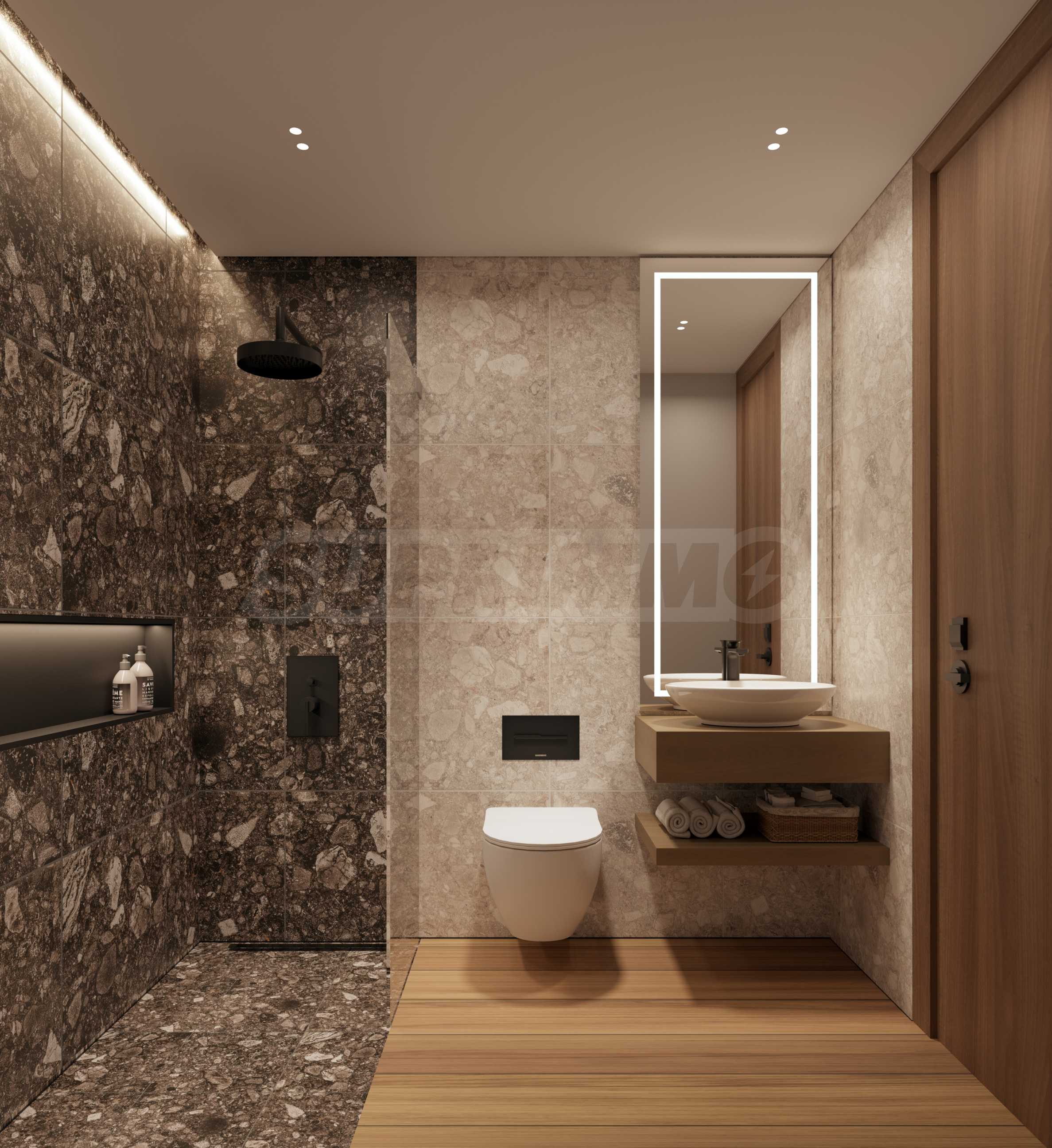 W łazience ściany w strefie prysznica pokryte są płytkami ceramicznymi lub gresowymi, a pozostałe ściany pomalowano farbą winylową. Szafka pod umywalką wykonana jest z płyty MDF z wykończeniem melaminowym lub termoprzylepną laminatem Formica, a wszystkie akcesoria i armatura wykonane są ze stali nierdzewnej, co zapewnia trwałość i elegancki wygląd.