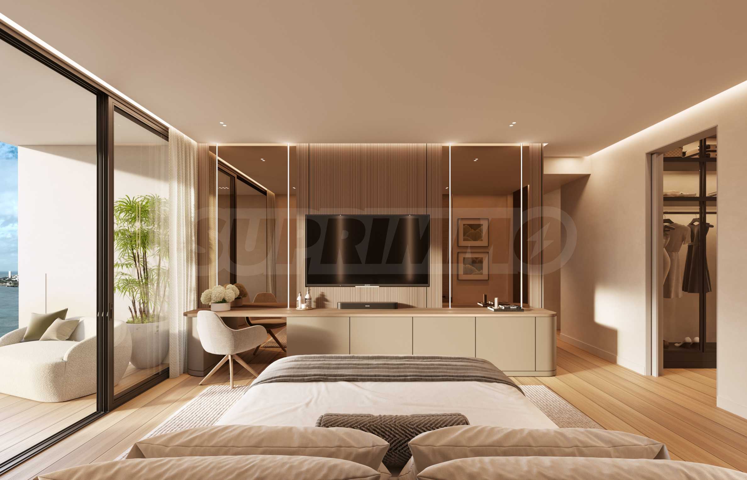 Apartament znajduje się na 9. piętrze budynku i ma powierzchnię całkowitą 98 m², z czego 93 m² przeznaczone są na przestrzeń wewnętrzną, a 5 m² na przestrzeń zewnętrzną. Wysokie sufity i okna sięgające od podłogi do sufitu, stanowiące ramy, pozwalają uchwycić niesamowite krajobrazy, które morze maluje przed Tobą każdego dnia. Układ nieruchomości jest niezwykle komfortowy i funkcjonalny, obejmuje przestronny salon z otwartą przestrzenią, kuchnię połączoną z jadalnią, sypialnię główną z łazienką i garderobą, drugą sypialnię z łazienką, toaletę dla gości i balkon.