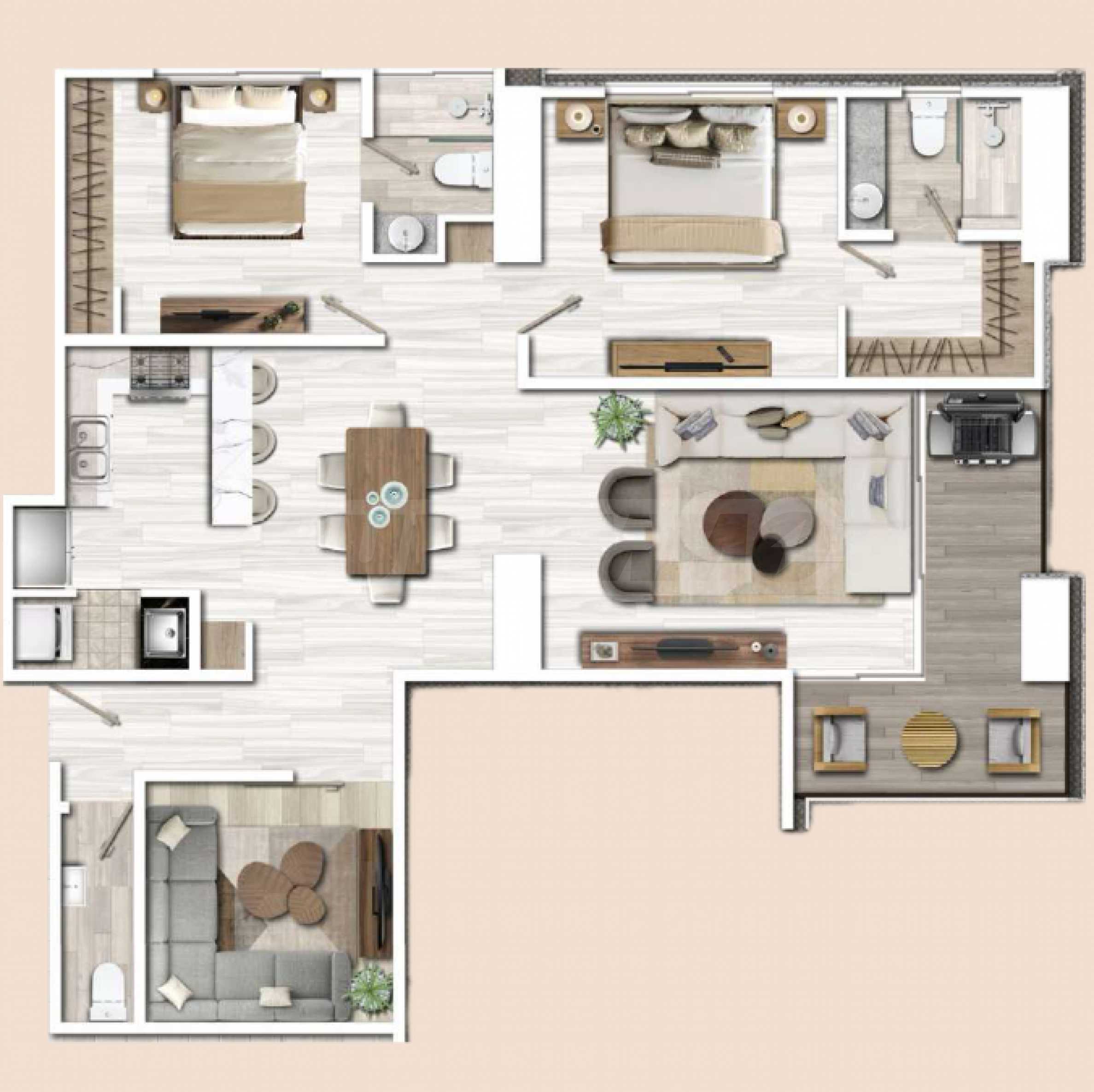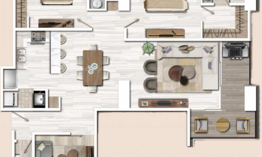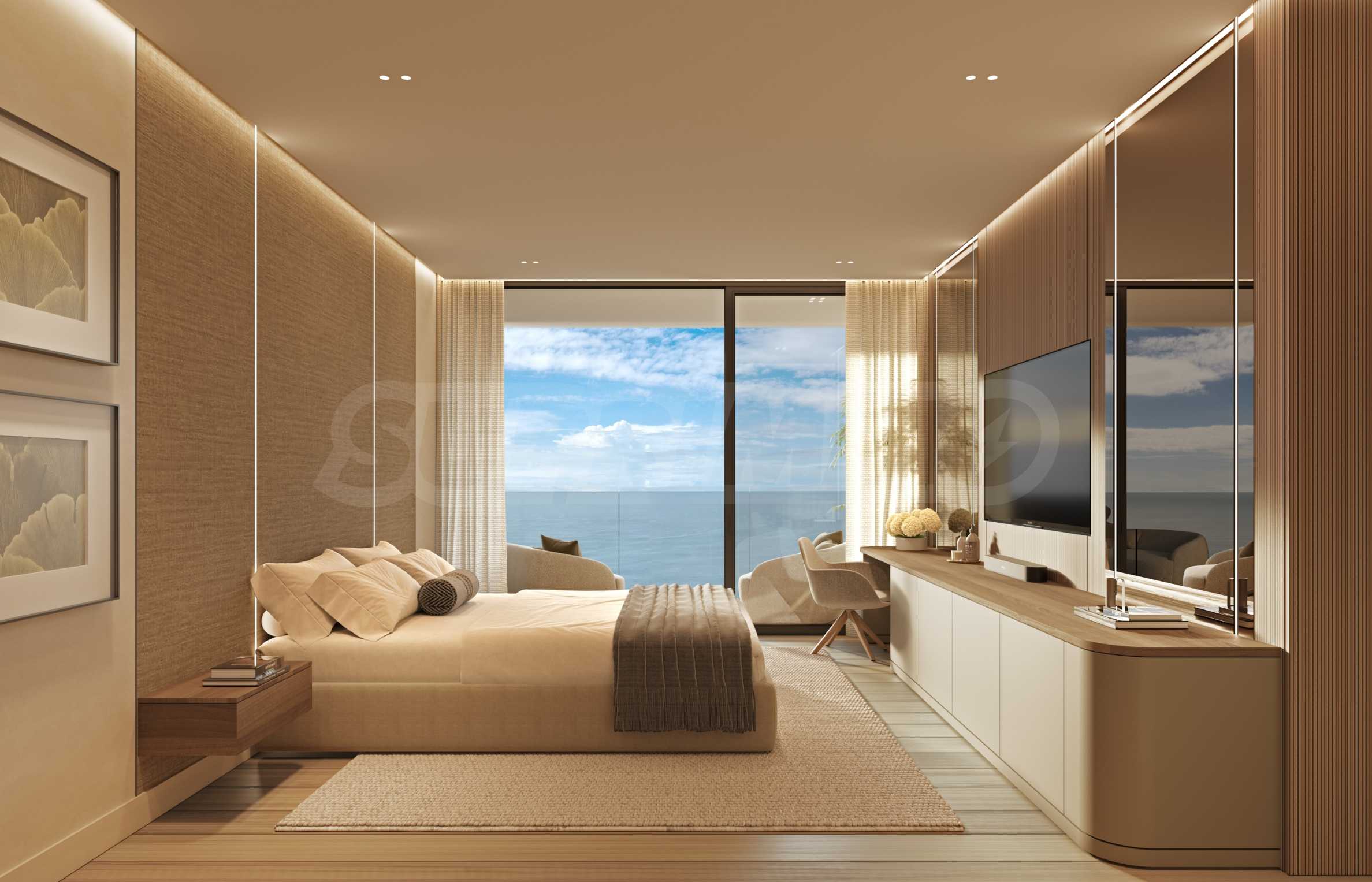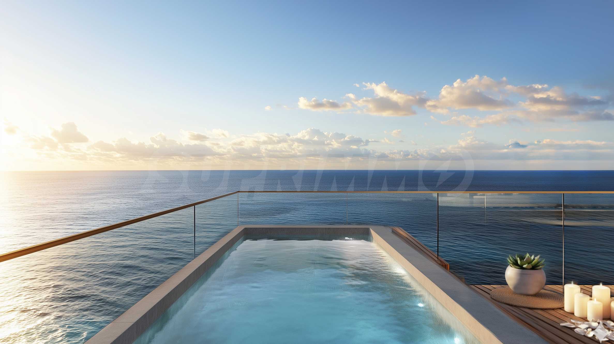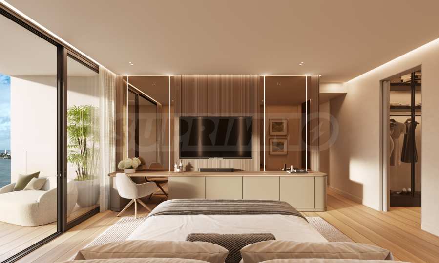 Apartament znajduje się na 27. piętrze budynku i ma powierzchnię całkowitą 120 m², z czego 110 m² jest przeznaczone na przestrzeń wewnętrzną, a 10 m² na przestrzeń zewnętrzną. Wysokie sufity i okna sięgające od podłogi do sufitu stanowią ramy, przez które można podziwiać niesamowite krajobrazy, jakie morze maluje każdego dnia. Układ nieruchomości jest niezwykle komfortowy i funkcjonalny, obejmuje przestronny salon z otwartą przestrzenią, łączący kuchnię z jadalnią, sypialnię główną z łazienką, garderobę i taras, drugą sypialnię z łazienką oraz toaletę dla gości. W apartamencie znajduje się również dodatkowy pokój, który można przeznaczyć na biuro, pokój gier, bibliotekę lub pokój gościnny.
