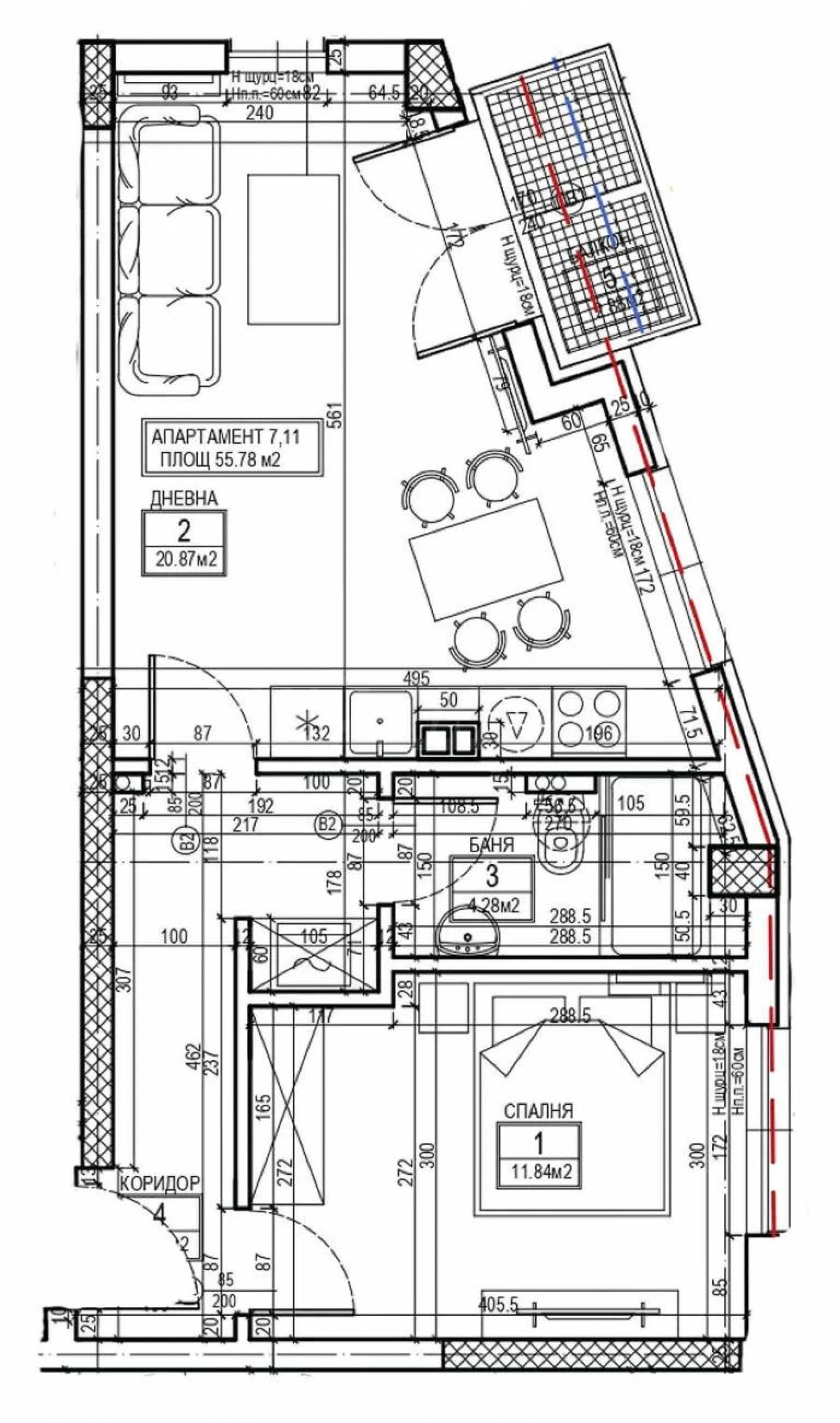 Nieruchomość o powierzchni całkowitej 66,99 m² znajduje się na 2. piętrze i składa się z przedpokoju, salonu z kuchnią, sypialni, łazienki z toaletą oraz tarasu. Do nieruchomości przynależy piwnica o powierzchni 2,35 m². Mieszkanie jest wynajmowane zgodnie z bułgarskim kodeksem handlowym, z możliwością własnej aranżacji wnętrza przez nowego właściciela.