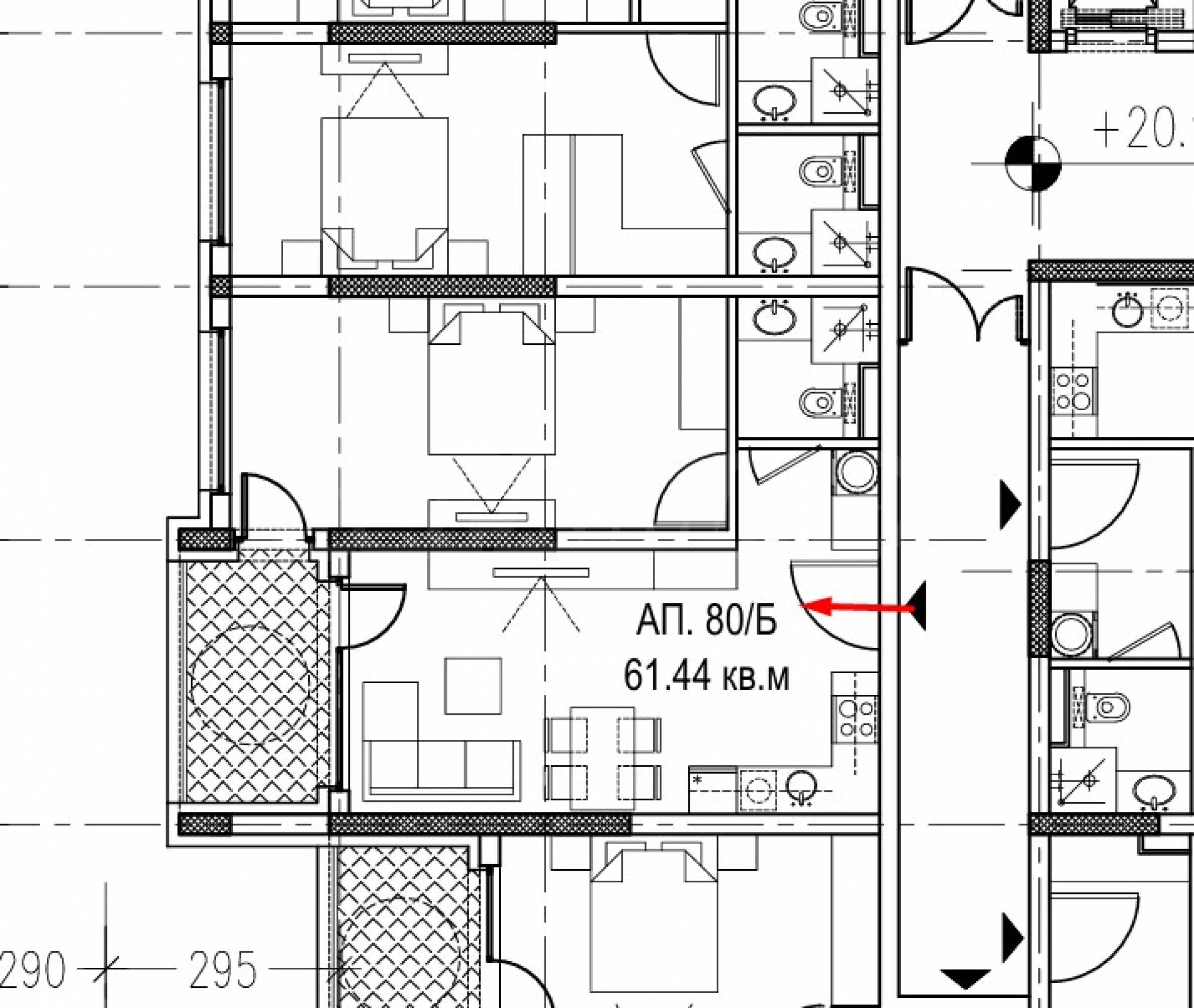 Nieruchomość znajduje się na 8. piętrze i ma powierzchnię całkowitą 70,99 m², a powierzchnia netto – 61,44 m², na którą składają się: hol wejściowy, salon z kuchnią, łazienka/WC, sypialnia oraz taras z dostępem z obu pomieszczeń. Sprzedawana jest w stanie deweloperskim, zgodnie z bułgarskimi standardami, z pięciokomorową stolarką PCV firmy Rehau, z potrójnymi szybami i antywłamaniowymi drzwiami wejściowymi.