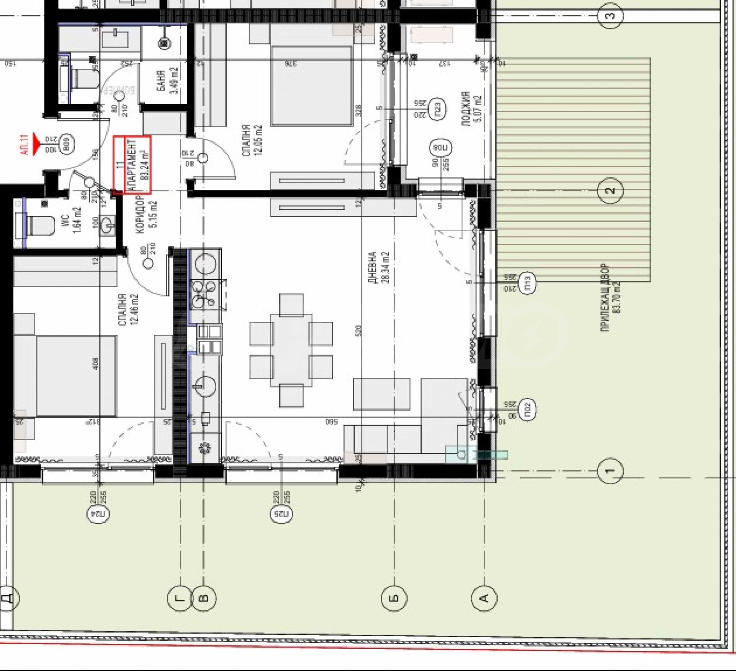Apartament nr 11 znajduje się na 1. piętrze (parterze) budynku i ma powierzchnię użytkową 83,24 m², na którą składają się: korytarz, łazienka/toaleta, toaleta, jasny salon z kuchnią i jadalnią, dwie wygodne sypialnie oraz weranda. Do apartamentu przynależy ogródek o powierzchni 83,70 m² oraz komórka lokatorska o powierzchni 3,38 m² wliczone w cenę.