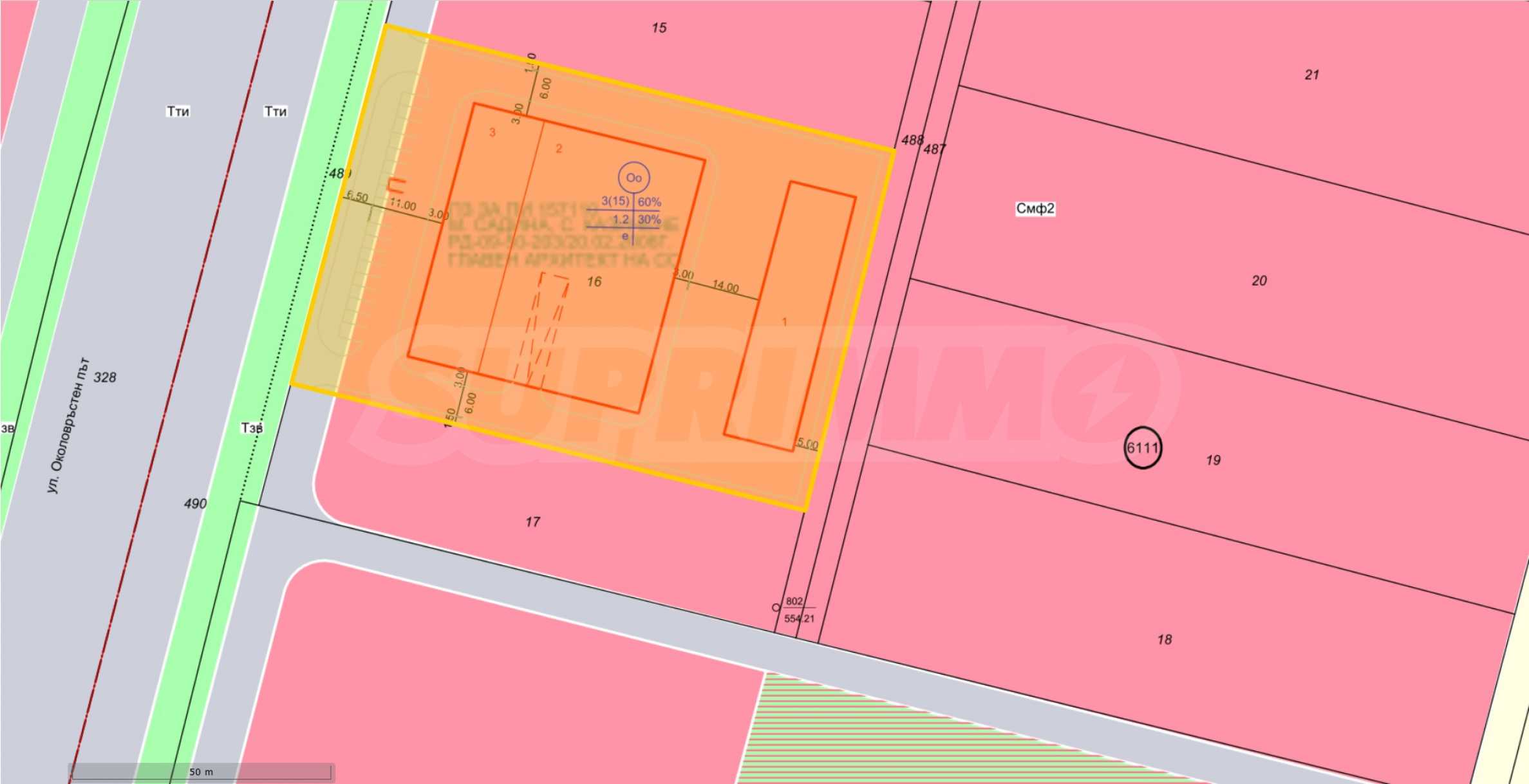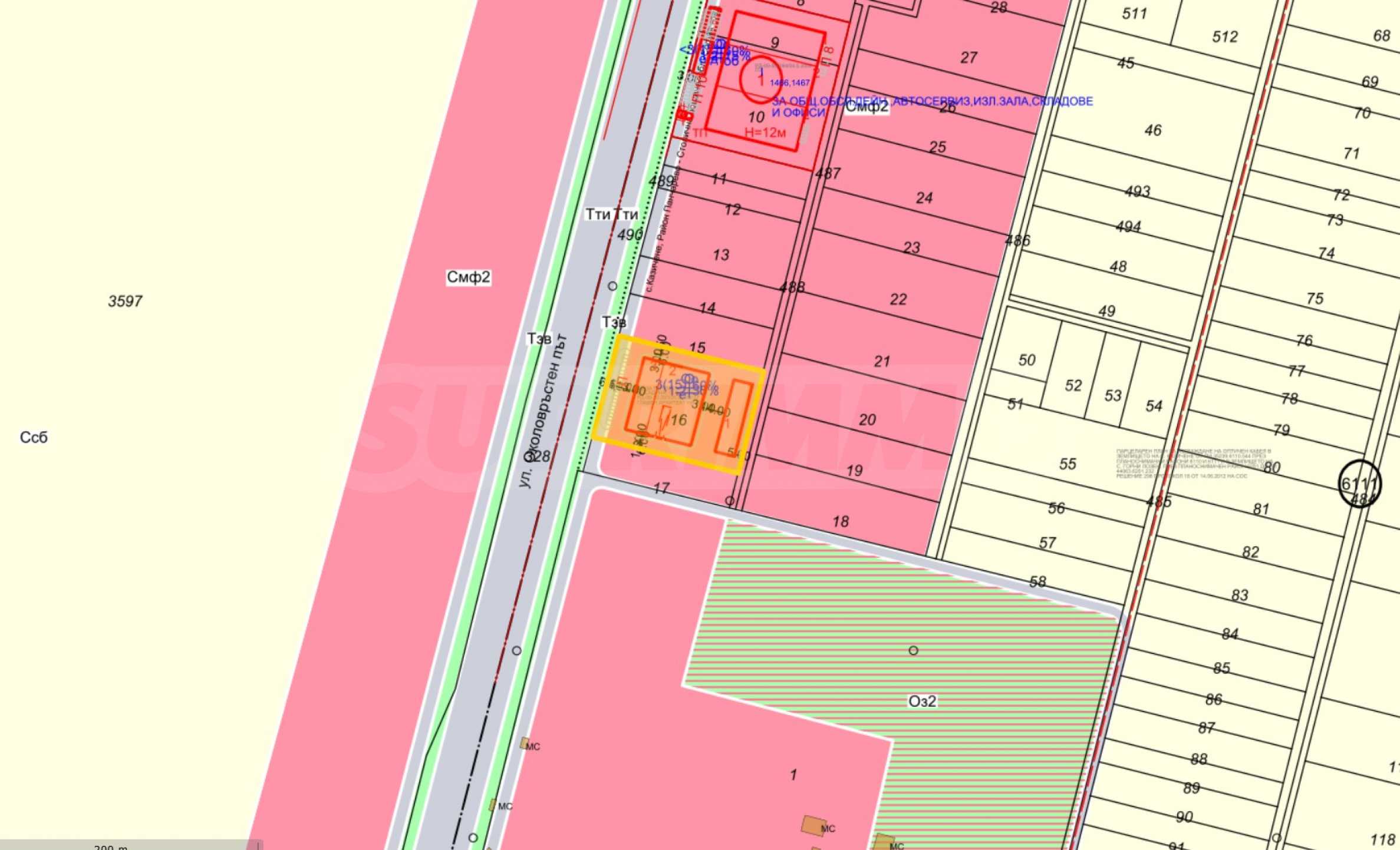 Oferowana jest nieruchomość składająca się z działki i gruntu rolnego o łącznej powierzchni 11 600 m², z czego 7300 m² jest uregulowane (pozostałe 4300 m² znajduje się bezpośrednio za działką o powierzchni 7300 m²) i charakteryzuje się absolutnie prawidłową geometrią, co zapewnia optymalny rozwój i łatwą organizację przyszłego projektu. Część uregulowana ma 71 metrów frontu do obwodnicy Sofii, położonej na widocznym i strategicznym odcinku trasy.