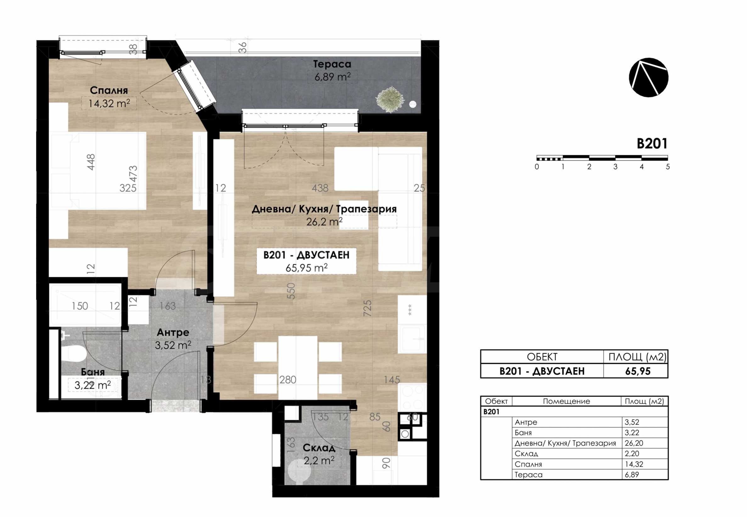 Nieruchomość znajduje się na 2. piętrze i ma powierzchnię całkowitą 83,46 m². Sprzedawana jest w stanie deweloperskim zgodnie z bułgarskim kodeksem cywilnym.
