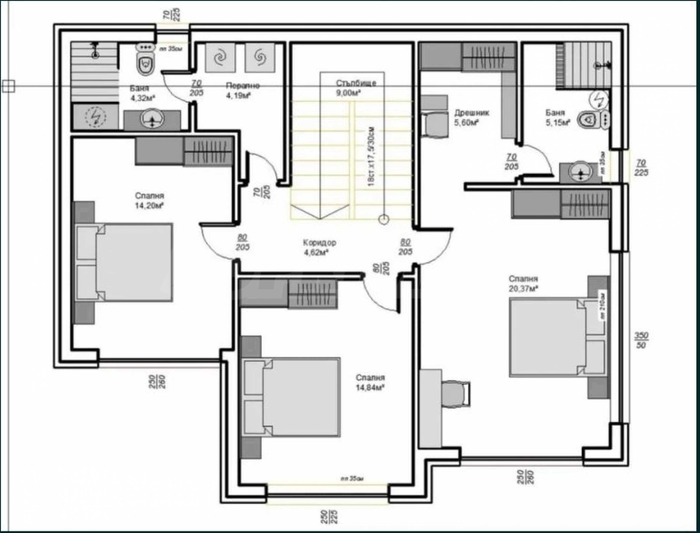 • sypialnia główna – 20,37 m2 z garderobą – 5,60 m2 i łazienką z toaletą – 5,15 m2.