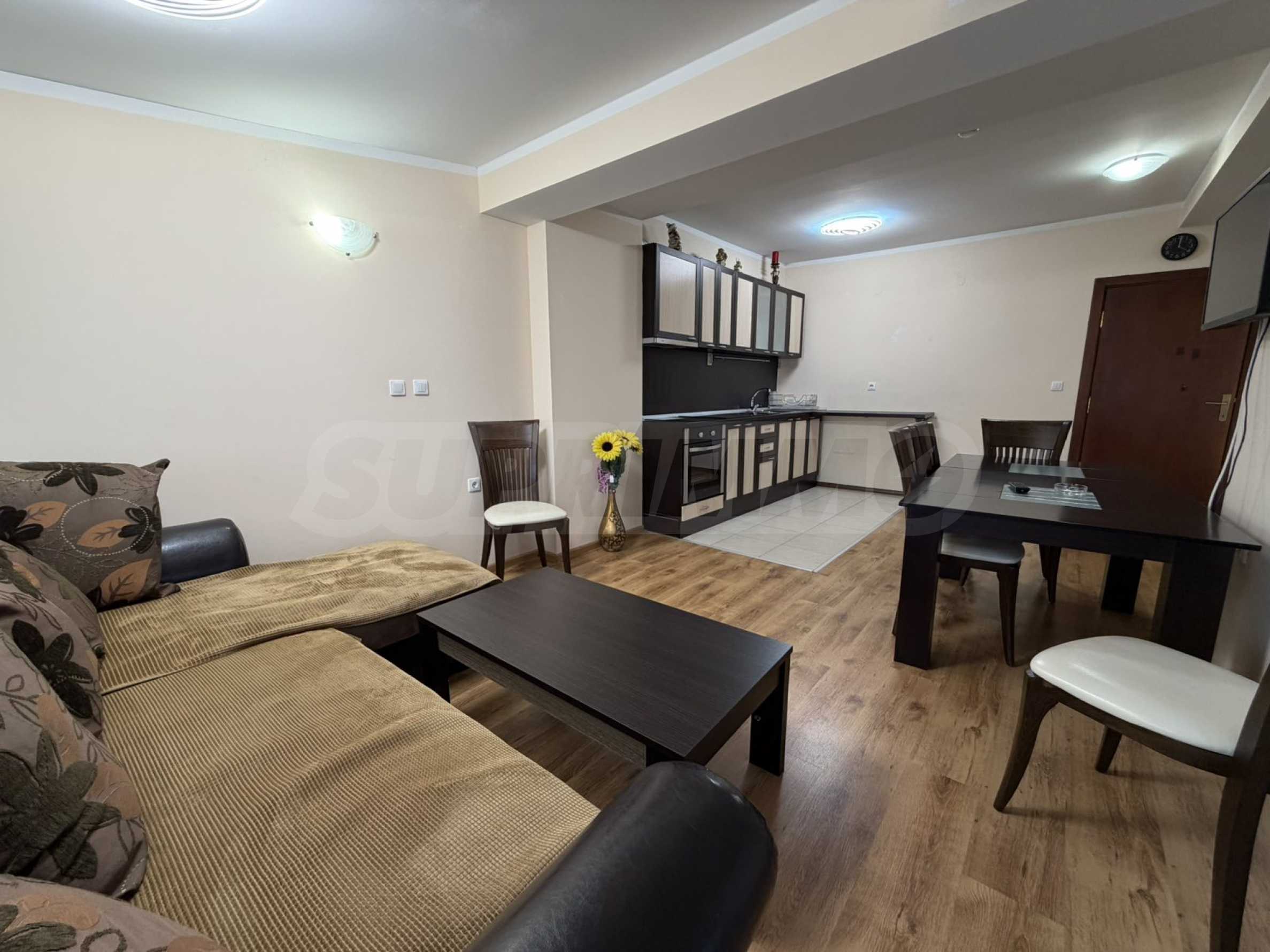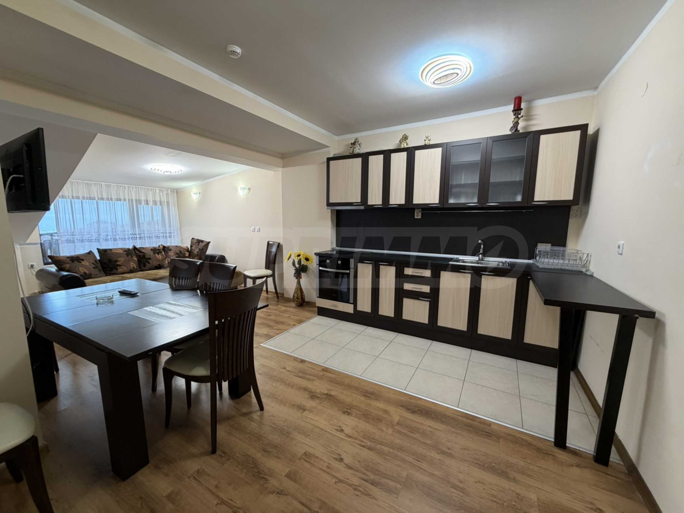 • Przestronny salon z narożną sofą, stołem jadalnym, stolikiem kawowym, telewizorem, aneksem kuchennym, sypialnią i balkonem;