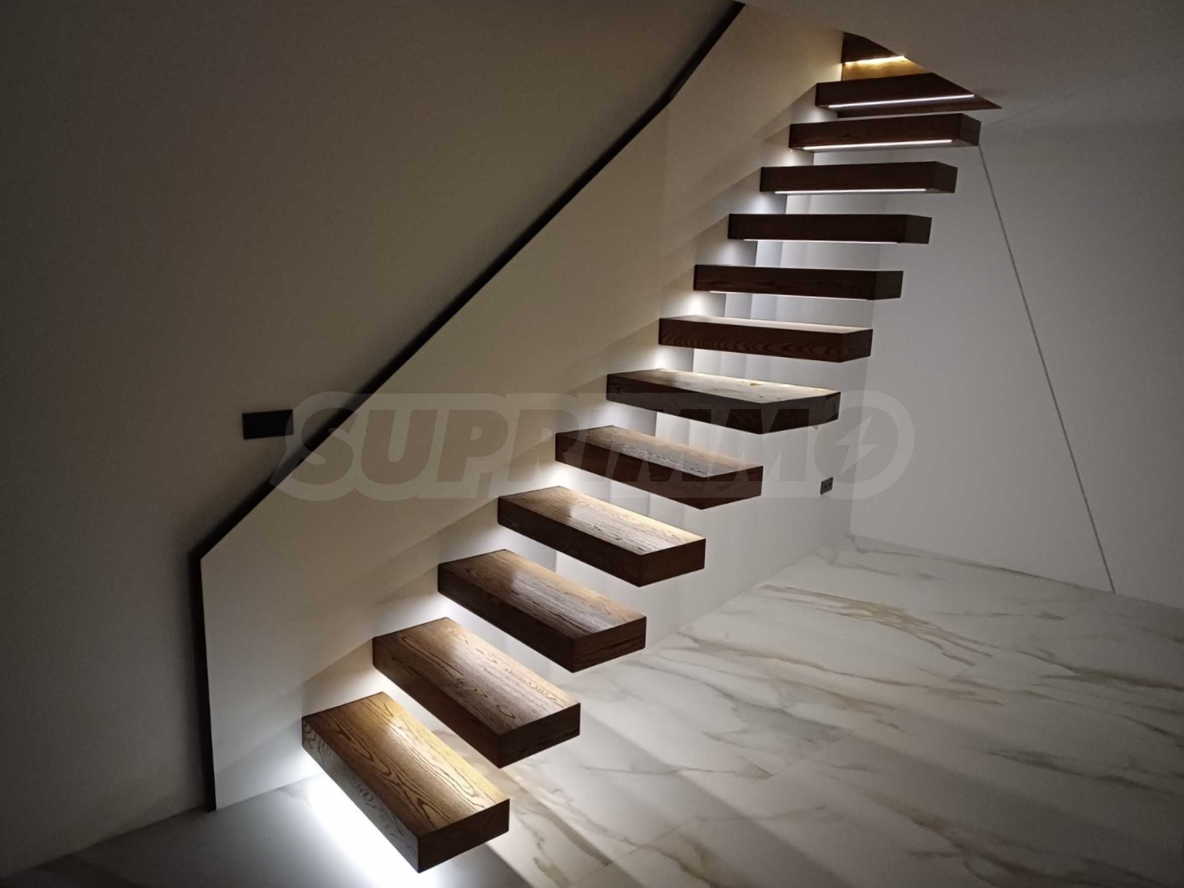 • Schody z litego dębu, zabezpieczone olejami Osmo i wyposażone w oświetlenie nastrojowe LED;