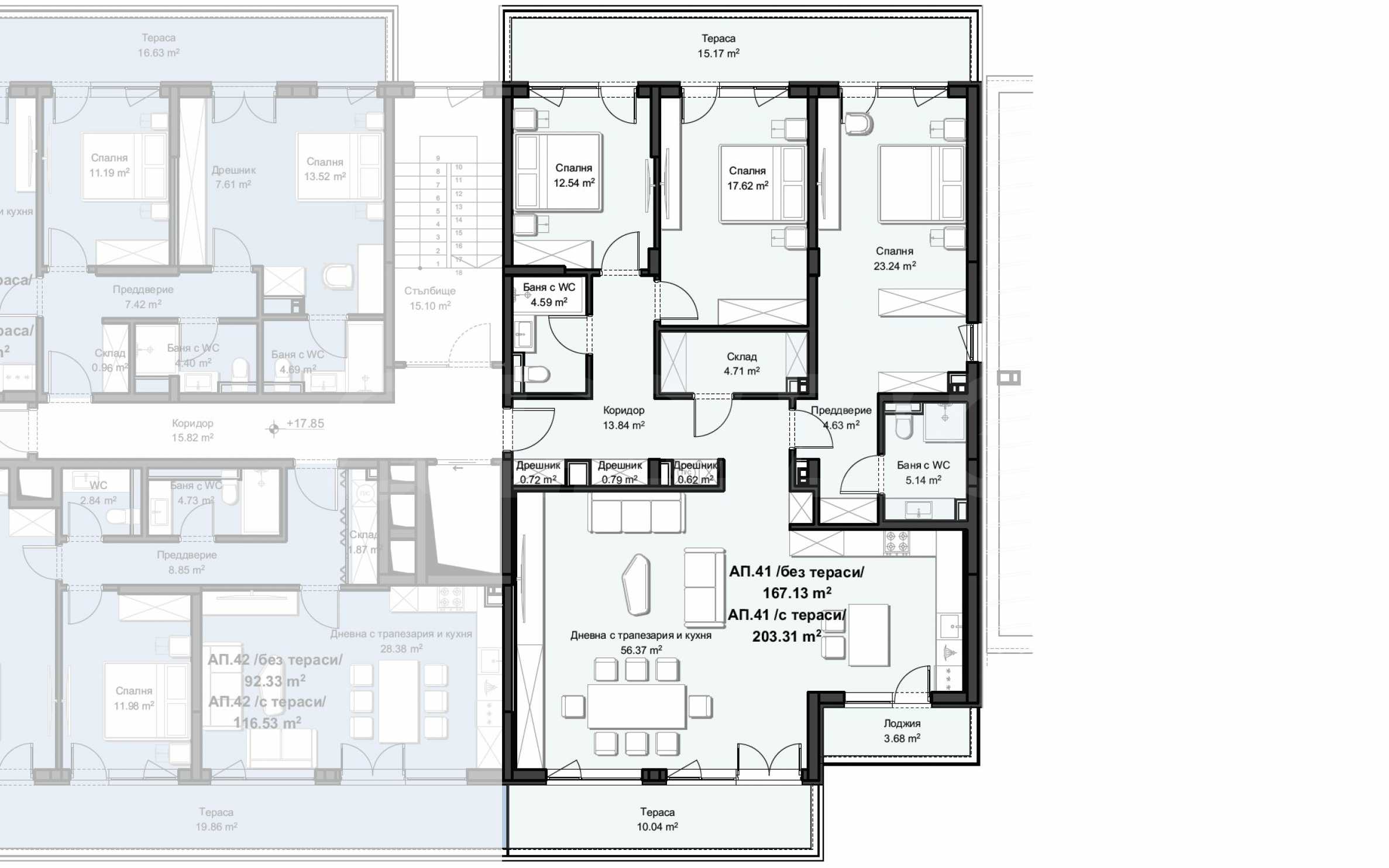 Apartament o powierzchni całkowitej 264,31 mkw. znajduje się na 7 piętrze w 7.