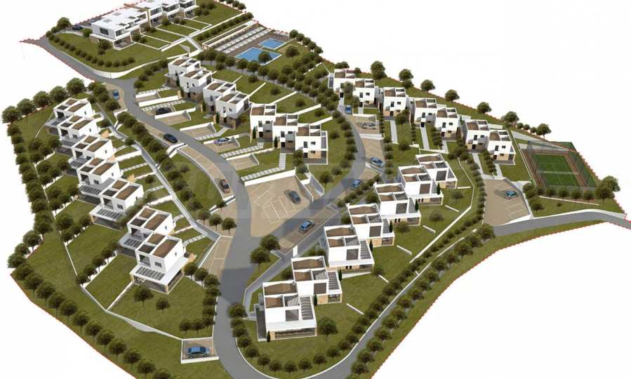 Przedstawiamy Państwu projekt inwestycyjny na dużą skalę, położony na zielonym wzgórzu w okolicach Kalandra i Possidi na wyspie Kassandra. Nieruchomość rozciąga się na rozległej działce o powierzchni 43 000 m², położonej na wysokości około 200 metrów nad poziomem morza, co zapewnia każdemu z domów wspaniały, panoramiczny widok na zatokę. Projekt to zamknięty kompleks (wioska), składający się z 34 dwupiętrowych domów szeregowych, rozmieszczonych w pięciu blokach architektonicznych. Architektura utrzymana jest w nowoczesnym stylu doryckim, z czystymi, białymi bryłami, które harmonizują z krajobrazem dzięki wykorzystaniu naturalnego światła, lokalnego kamienia i elementów drewnianych.