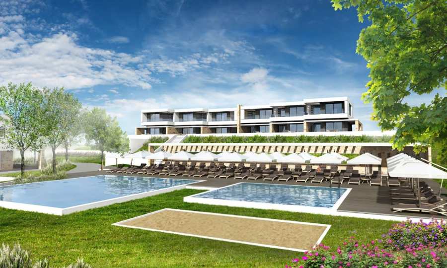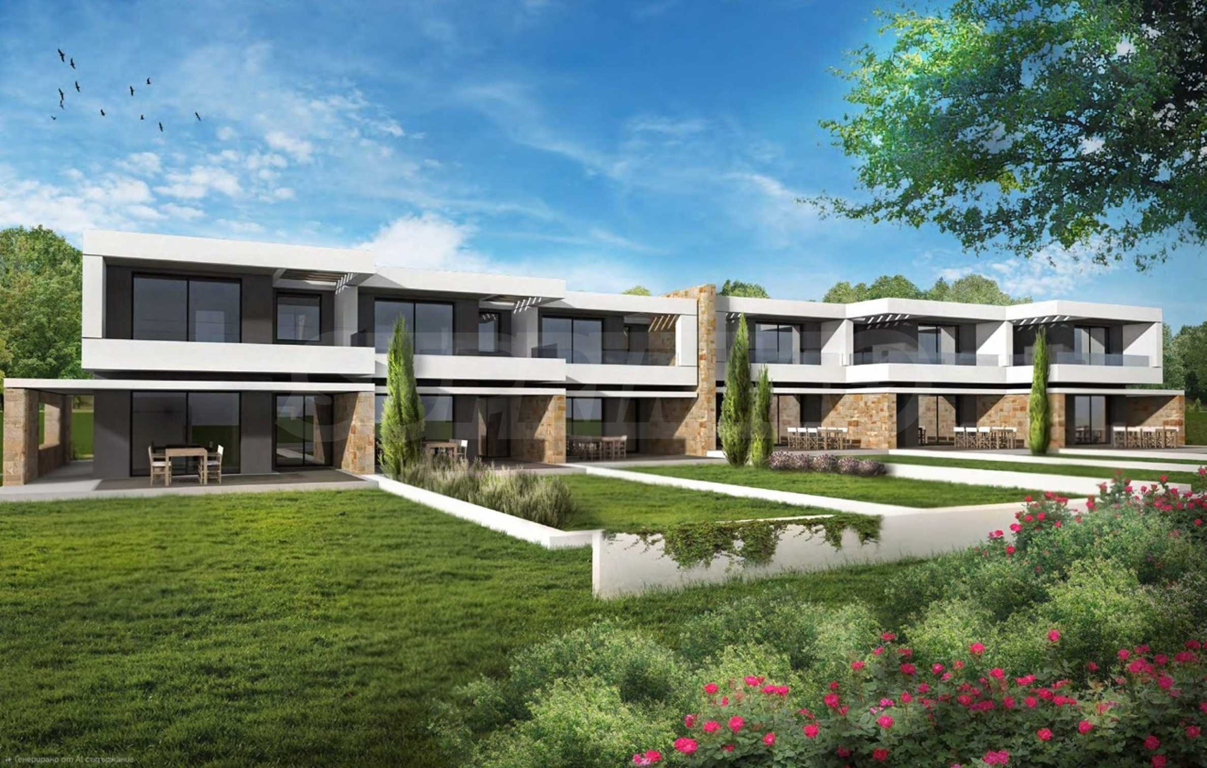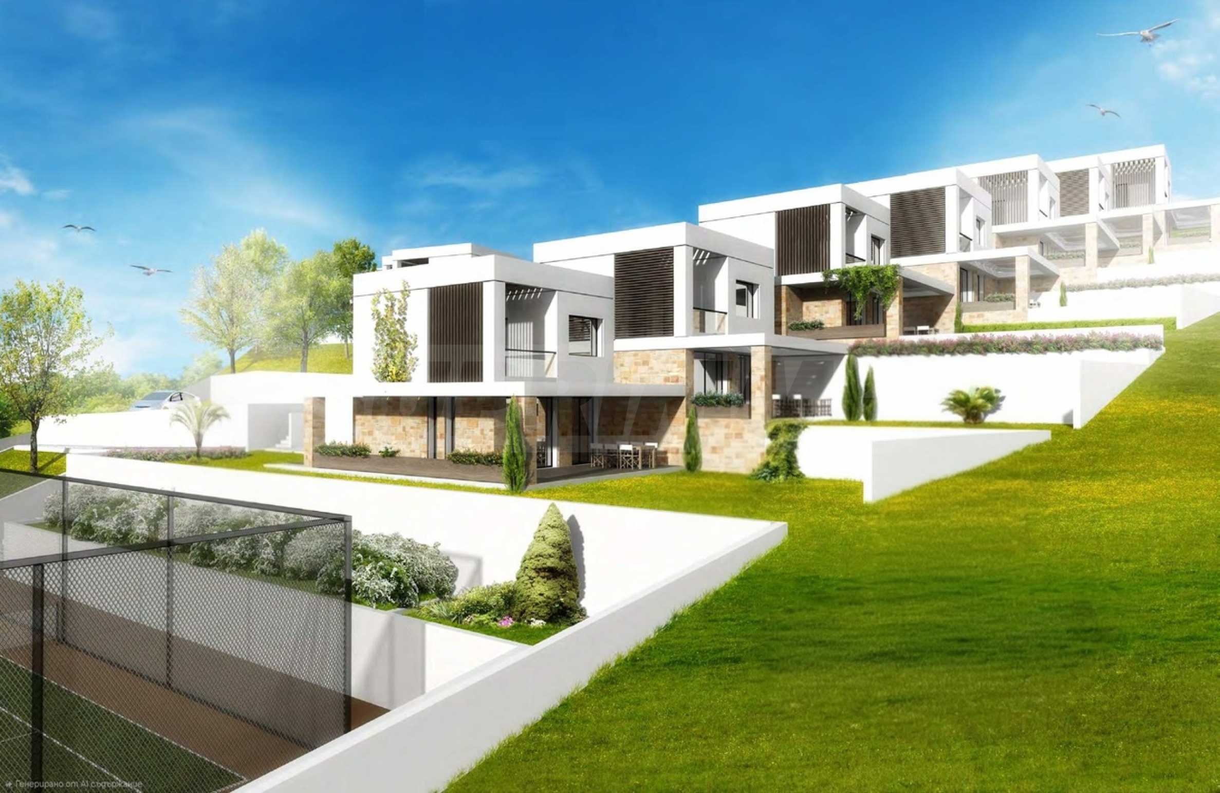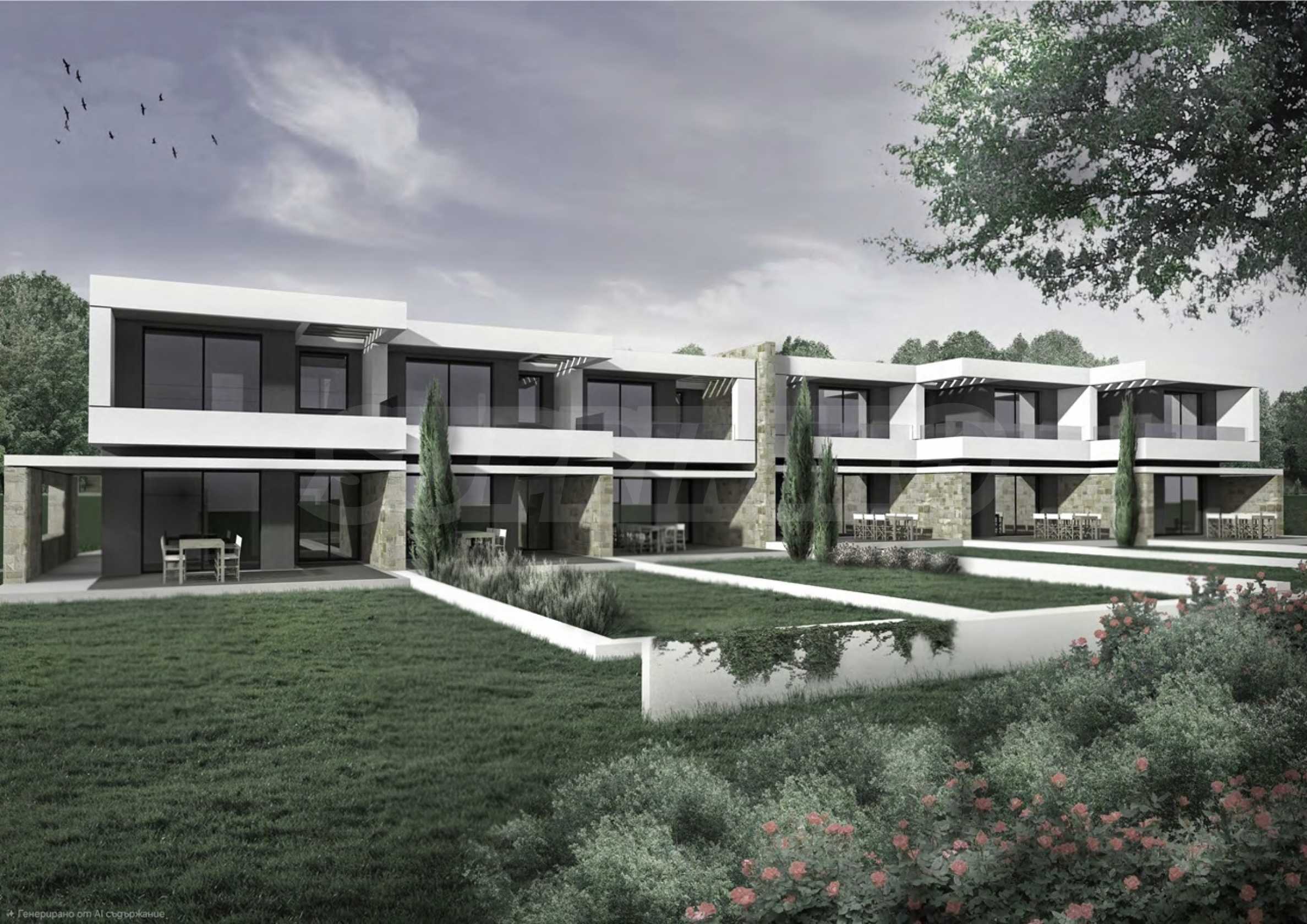 Przedstawiamy Państwu projekt inwestycyjny na dużą skalę, położony na zielonym wzgórzu w okolicach Kalandra i Possidi na wyspie Kassandra. Nieruchomość rozciąga się na rozległej działce o powierzchni 43 000 m², położonej na wysokości około 200 metrów nad poziomem morza, co zapewnia każdemu z domów wspaniały, panoramiczny widok na zatokę. Projekt to zamknięty kompleks (wioska), składający się z 34 dwupiętrowych domów szeregowych, rozmieszczonych w pięciu blokach architektonicznych. Architektura utrzymana jest w nowoczesnym stylu doryckim, z czystymi, białymi bryłami, które harmonizują z krajobrazem dzięki wykorzystaniu naturalnego światła, lokalnego kamienia i elementów drewnianych.