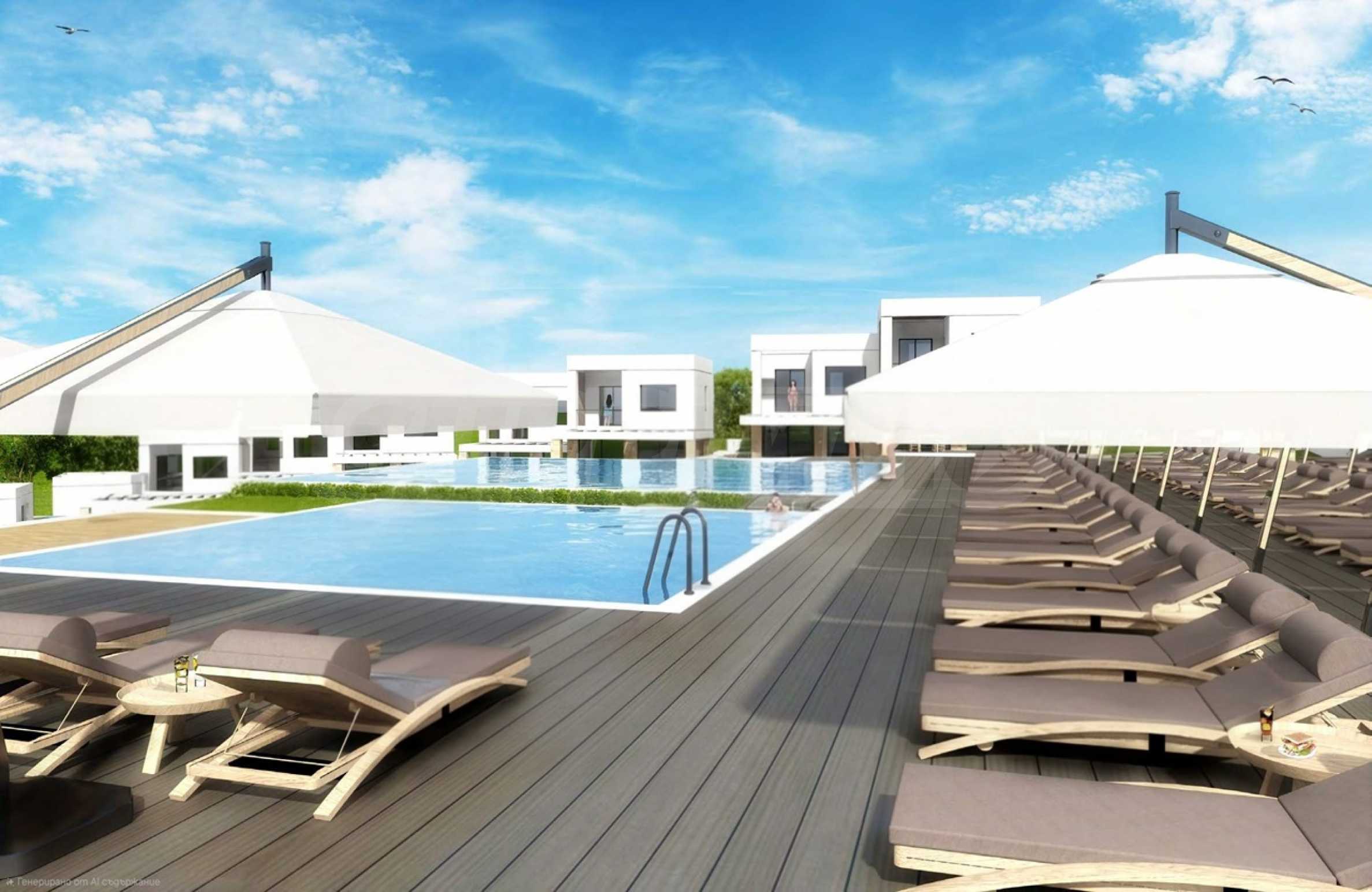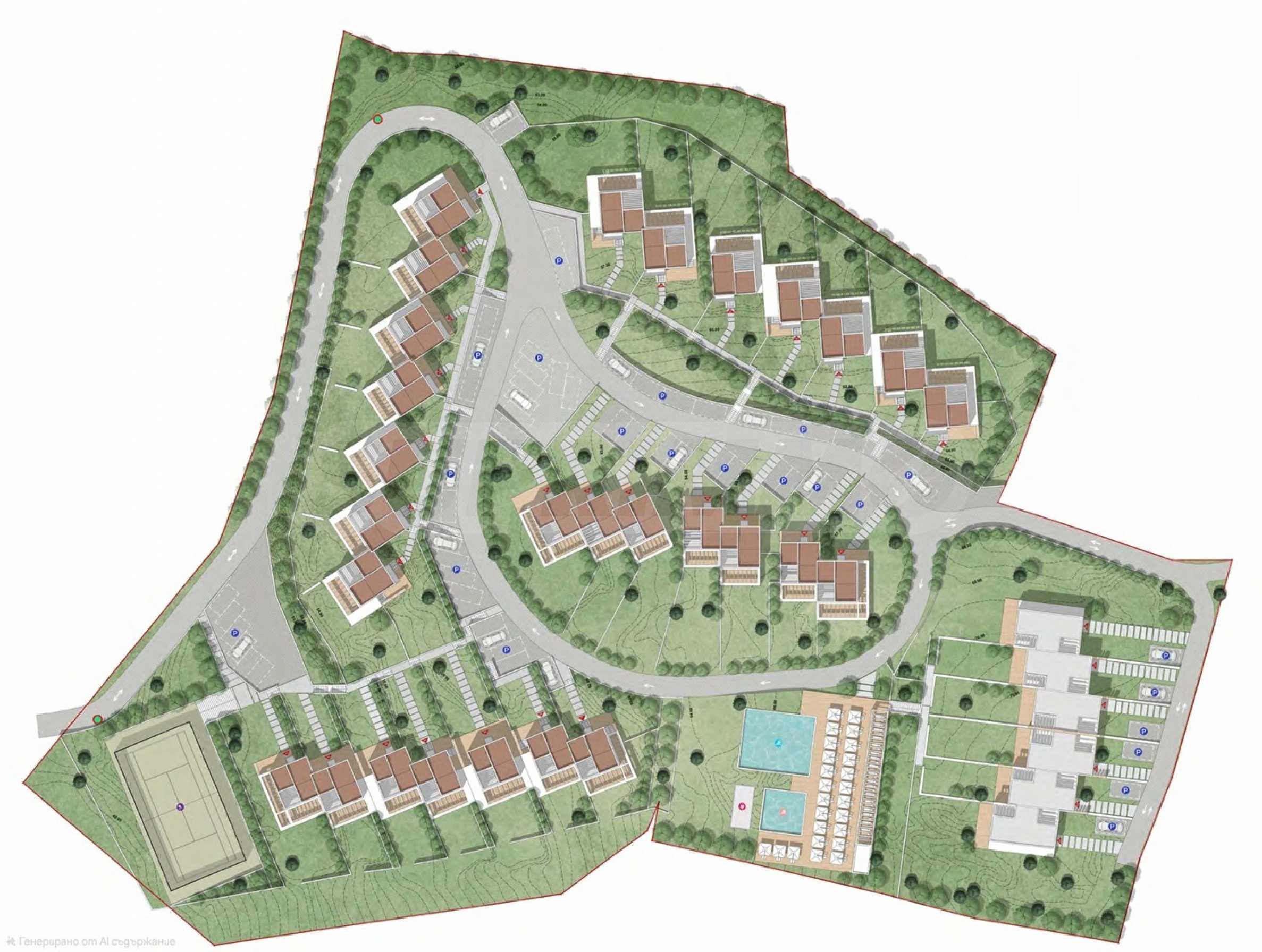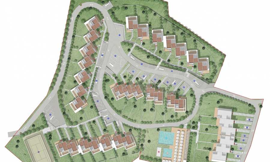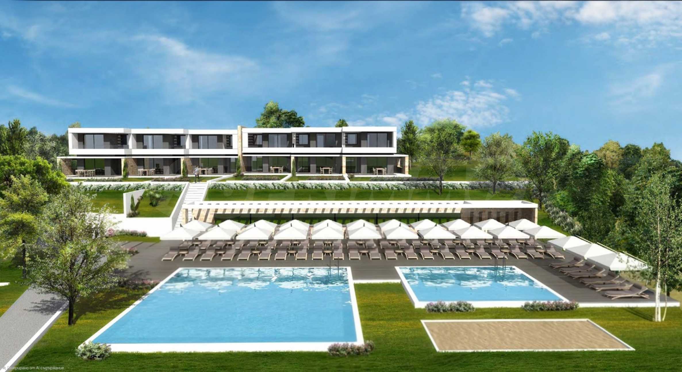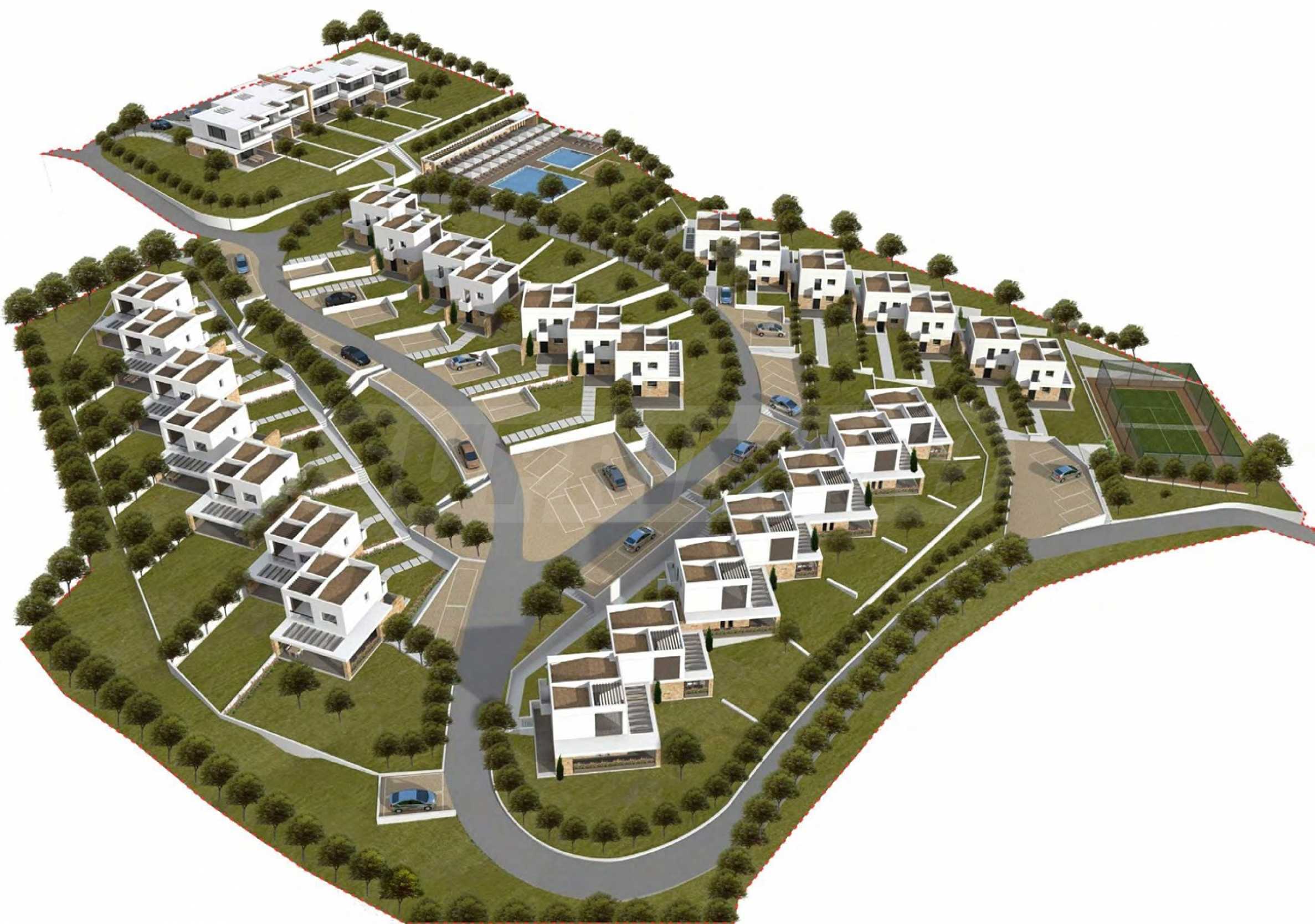 Kompleks został zaprojektowany z naciskiem na wysoki standard życia i bogatą infrastrukturę. W części południowej znajdują się dwa baseny – duży dla dorosłych i dziecięcy, a w części zachodniej, tuż przy wejściu, prywatny kort tenisowy. Komunikację wewnętrzną zapewnia centralna obwodnica, która prowadzi do dyskretnie zlokalizowanych miejsc parkingowych (dwa na każdy dom), wkomponowanych w bogato zagospodarowany teren. Obecnie budynki znajdują się w stanie surowym, co pozwala przyszłemu właścicielowi na realizację projektu zgodnie z własnymi potrzebami – czy to jako luksusowy kompleks hotelowy, czy jako ośrodek wypoczynkowy na sprzedaż.