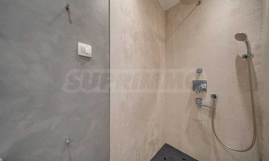 • Łazienka - ściany wykończone tynkiem mineralnym zmywalnym, kabina prysznicowa z podłogą z kamienia technicznego i ściany wykończone panelami ceramicznymi, ceramika sanitarna Ideal Standard,