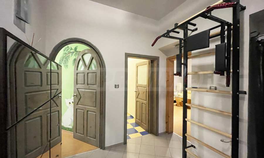 Kuchnia jest oddzielna, przestronna i w pełni wyposażona. Jedna sypialnia nadaje się na pokój dziecięcy i wyposażona jest w łóżko piętrowe, a łazienka jest przestronna i funkcjonalna. Dodatkowo do dyspozycji jest schowek, oferujący praktyczne miejsce do przechowywania. W części wspólnej znajduje się również kącik sportowy z zamontowanym symulatorem i drążkiem do podciągania.