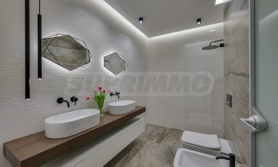 • Dwie luksusowo wyposażone łazienki z toaletami, wyposażone w wysokiej jakości sprzęt sanitarny i ogrzewanie podłogowe;