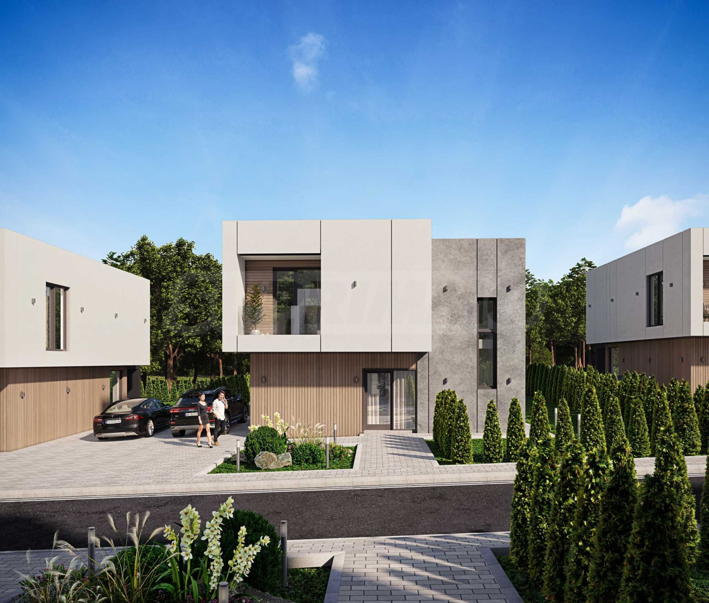 Ogród i otoczenie zewnętrzne – Działki posiadają utwardzone alejki prowadzące do wejścia do domu i miejsc parkingowych, które są funkcjonalnie połączone. Niezagospodarowane podwórka zostaną zagospodarowane niską i wysoką roślinnością, a także wyposażone w automatyczny system nawadniania kropelkowego. Zapewnione jest oświetlenie elewacji i ogrodu.