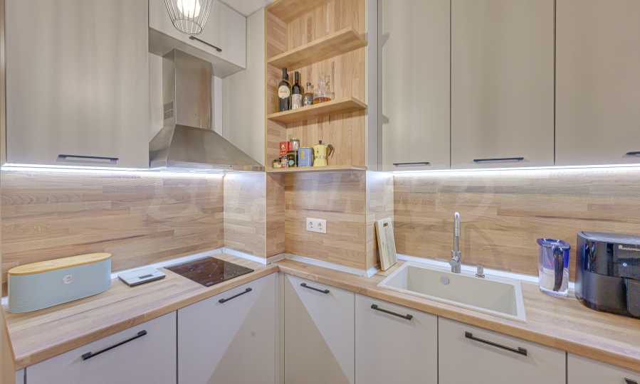 Apartament posiada jasną strefę dzienną, która w naturalny sposób łączy w sobie przestrzeń do relaksu i jadalni. Wnętrze utrzymane jest w ciepłych, stonowanych barwach, uzupełnionych naturalnymi drewnianymi elementami, które nadają mu przytulności i elegancji.