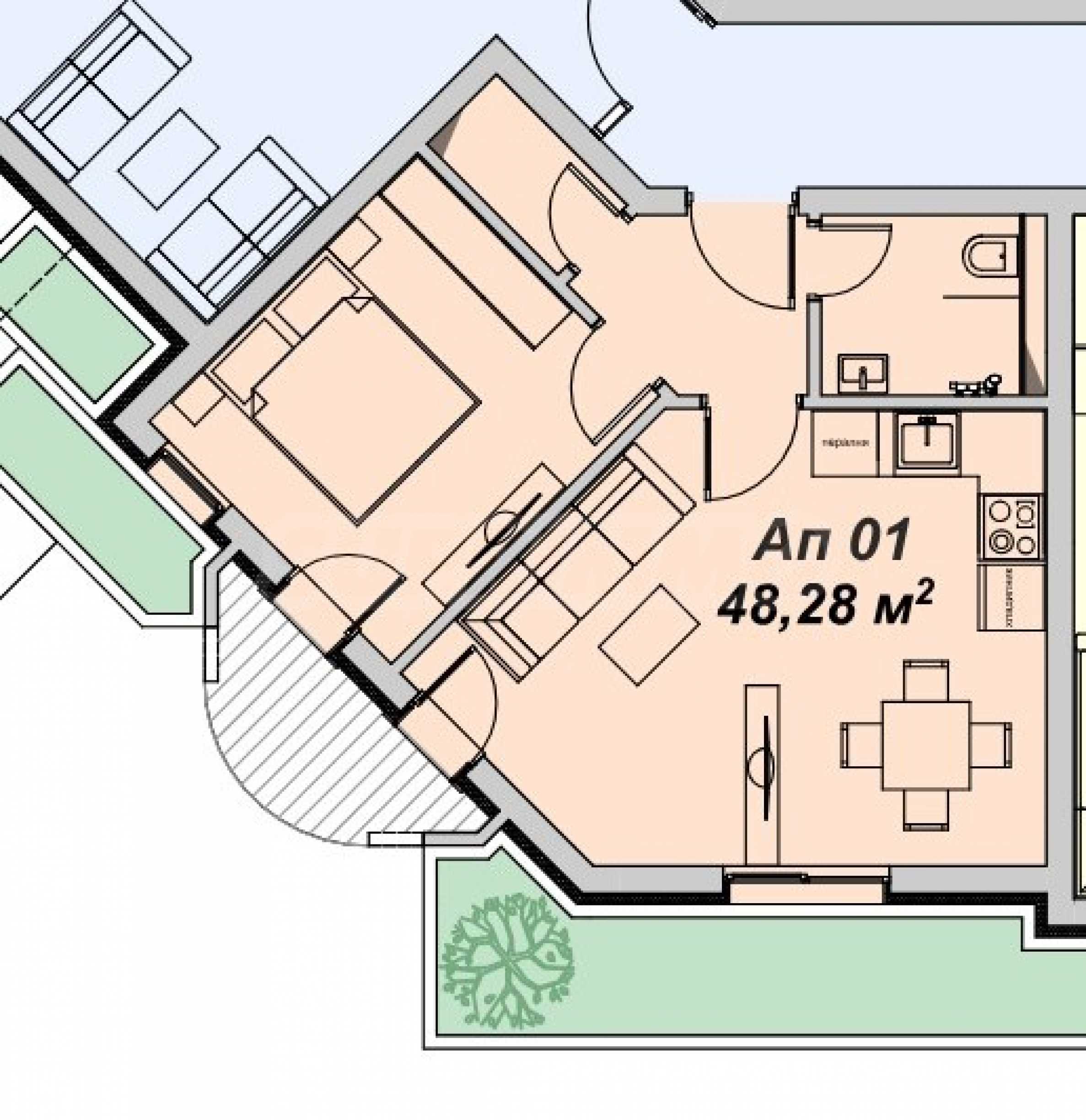 Oferujemy do sprzedaży mieszkanie jednopokojowe w nowym, luksusowym kompleksie mieszkalnym, składającym się z dwóch eleganckich budynków, położonym 600 metrów od plaży w Słonecznym Brzegu.
