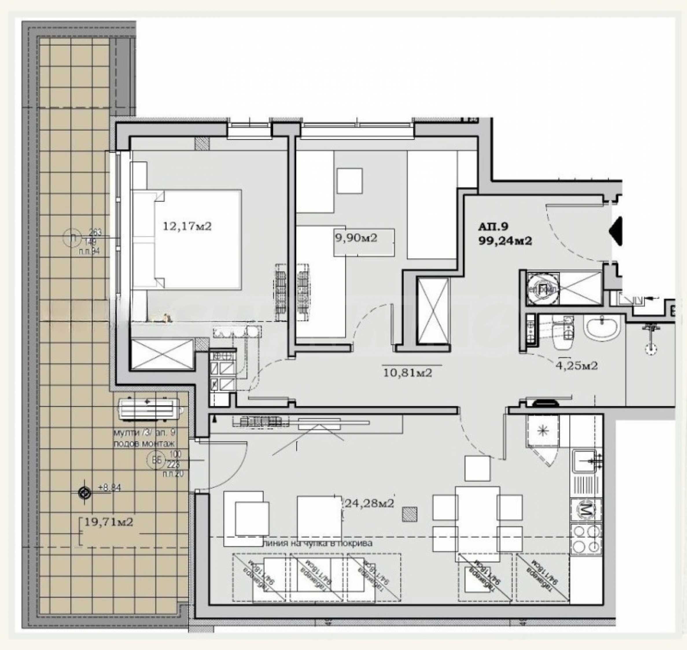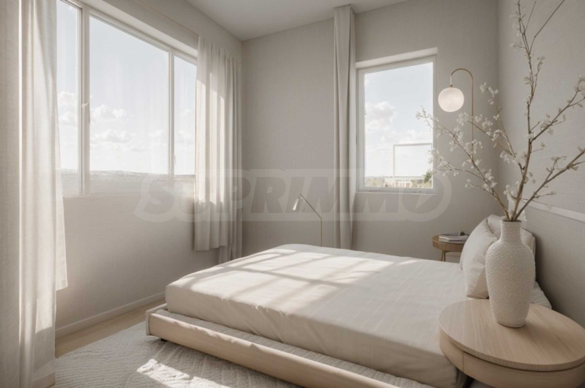 Mieszkanie znajduje się na 4. piętrze i ma powierzchnię całkowitą 119 m². Jest ono oferowane w stanie deweloperskim zgodnie z bułgarskimi standardami, z wysokiej jakości oknami PCV z podwójnymi szybami z argonem. Zdjęcia oferty z umeblowaniem są przykładowe.