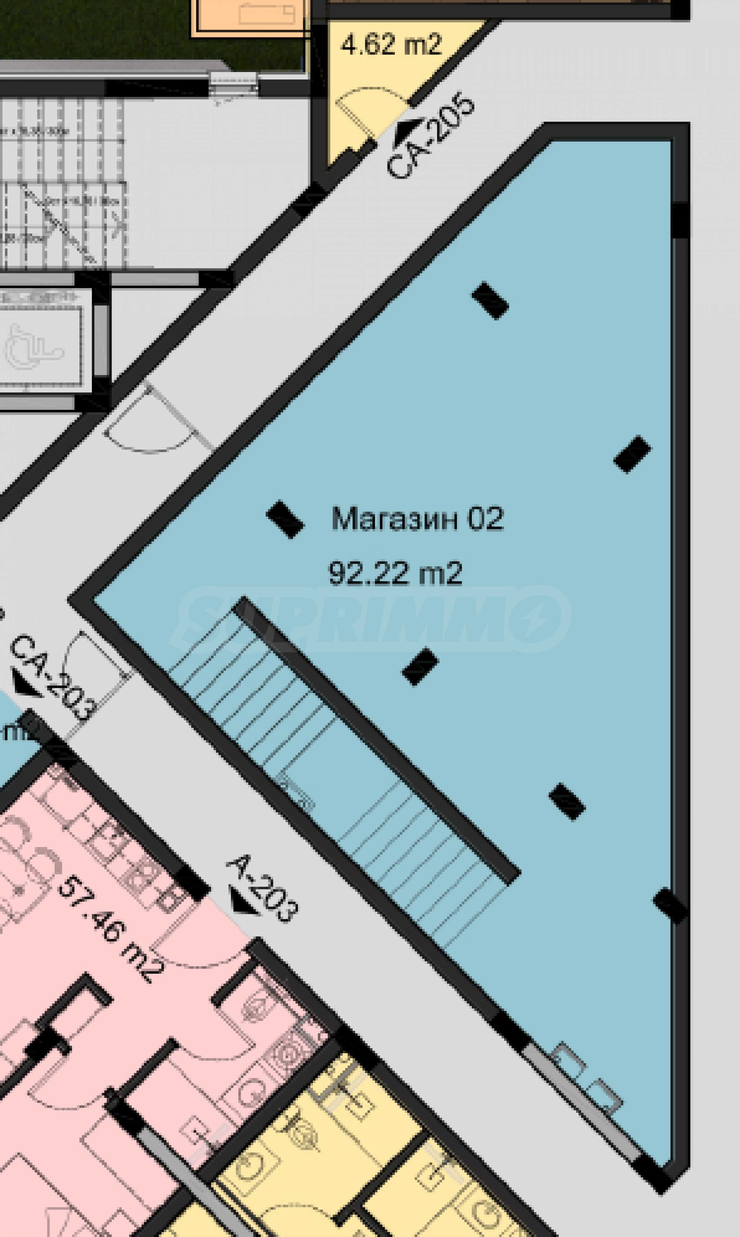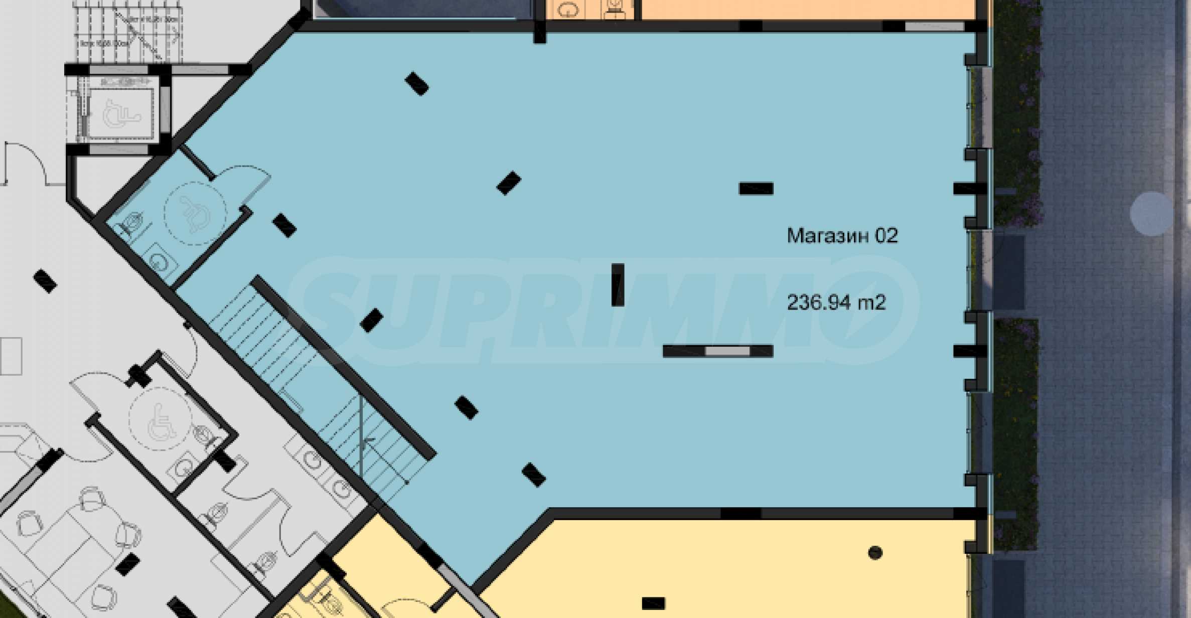 Nieruchomość o powierzchni całkowitej 329,16 m², położona na dwóch poziomach z widokiem na główną ulicę o dużym natężeniu ruchu. Składa się z jednego głównego, przestronnego pokoju i łazienki na parterze oraz jednego pokoju na 2. piętrze. Istnieje możliwość wydzielenia dodatkowych pokoi.