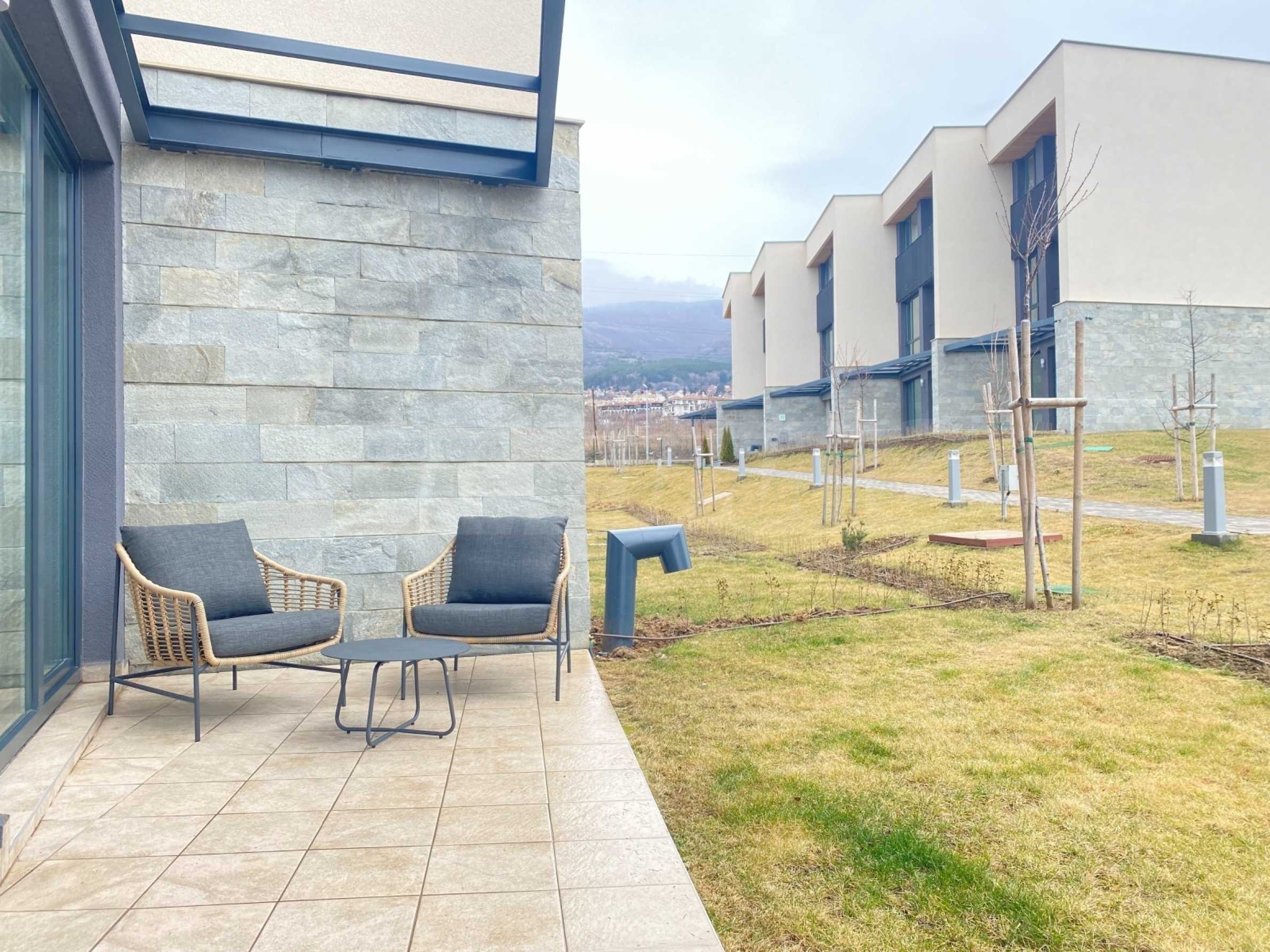 • taras z trawnikiem i meblami ogrodowymi.