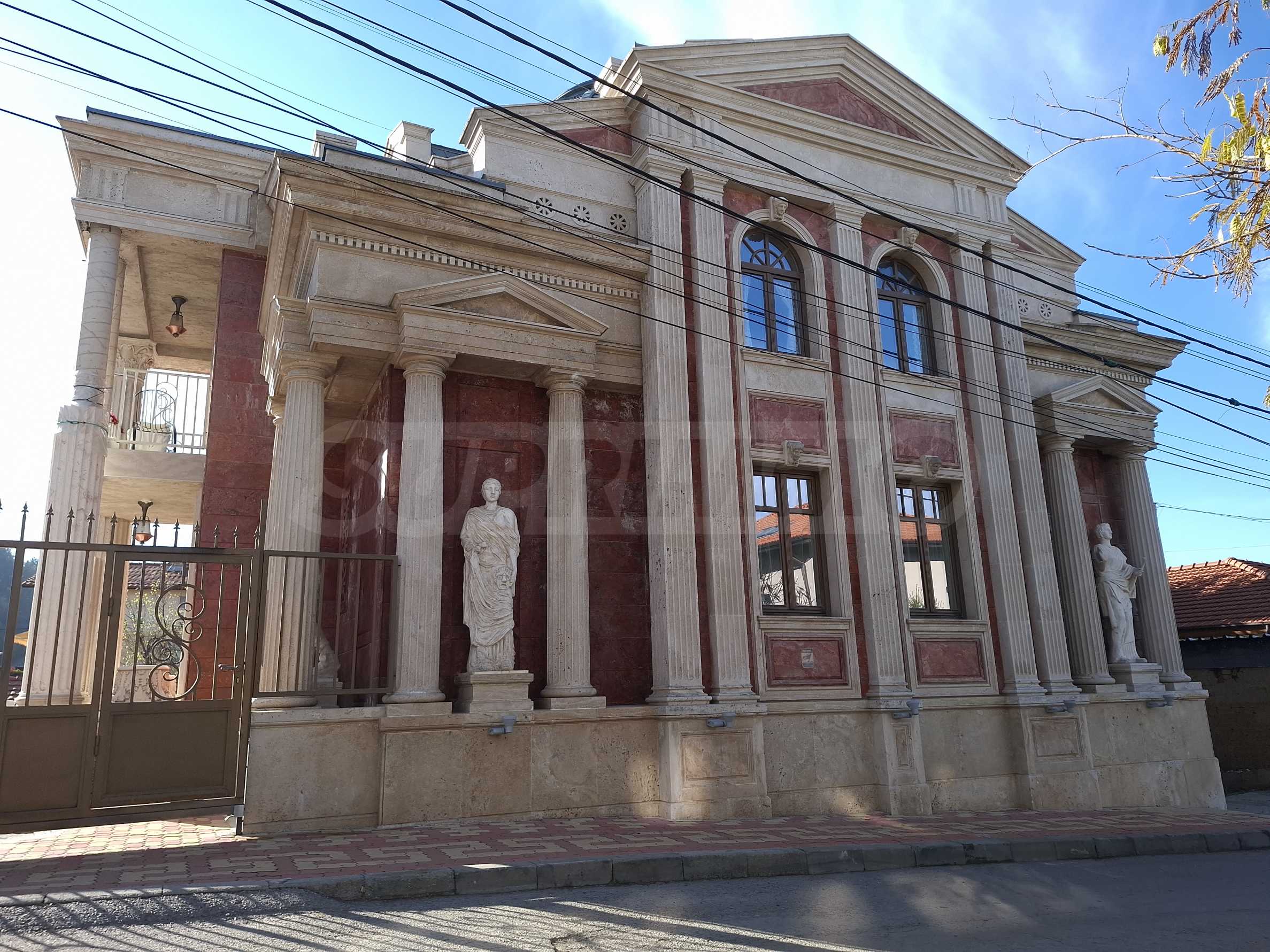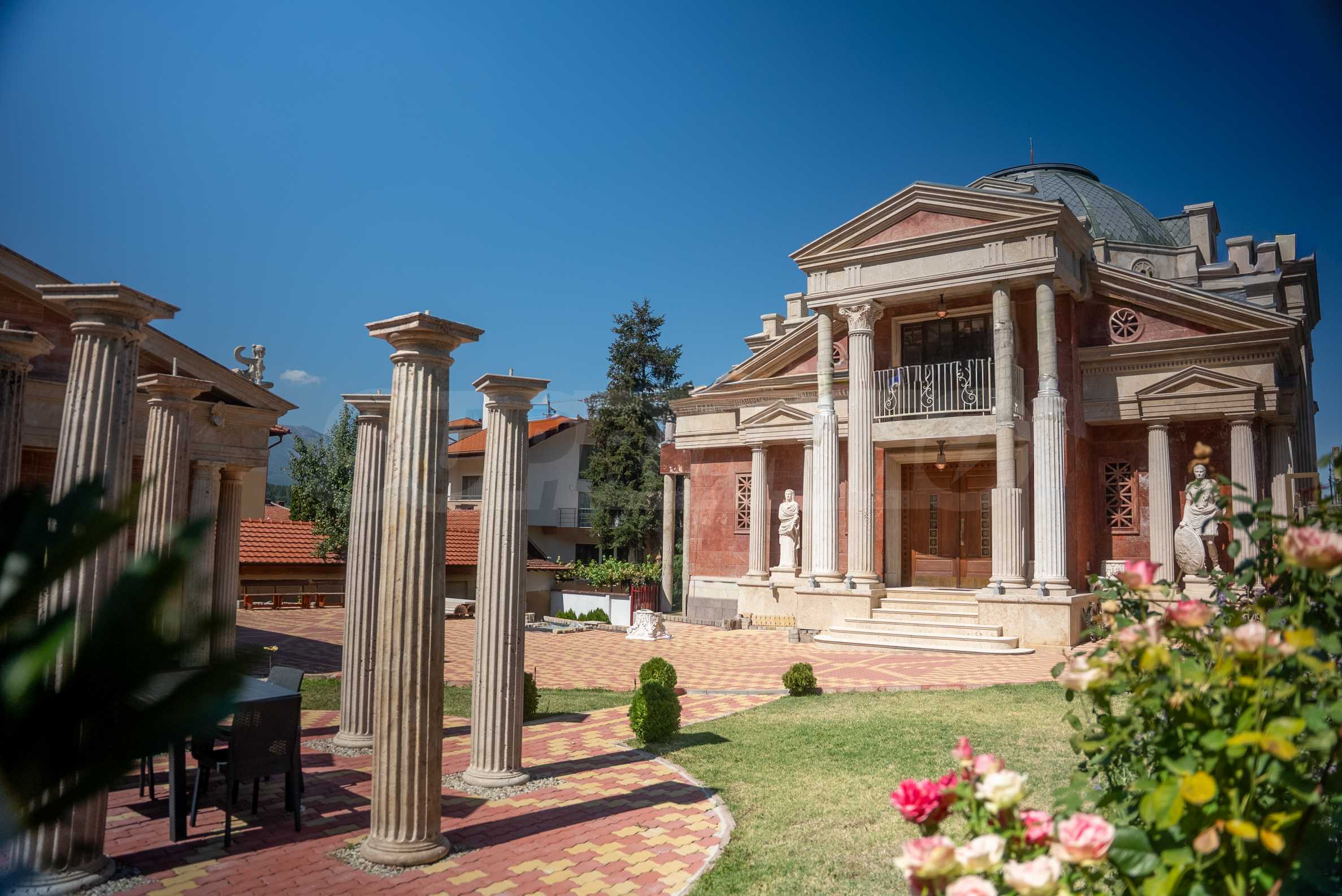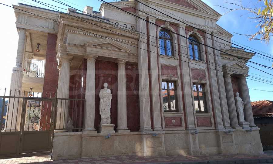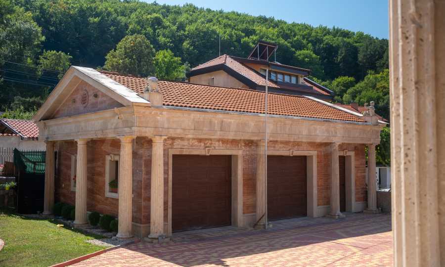 Fasada jest imponująca i niezwykle rozpoznawalna, zbudowana z naturalnego kamienia i trawertynu, o wyraźnie wyrażonych klasycznych proporcjach i symetrii. Masywne kolumny, frontony i elementy dekoracyjne tworzą wrażenie starożytnej monumentalności, godne prywatnej rezydencji lub reprezentacyjnej posiadłości najwyższej klasy.