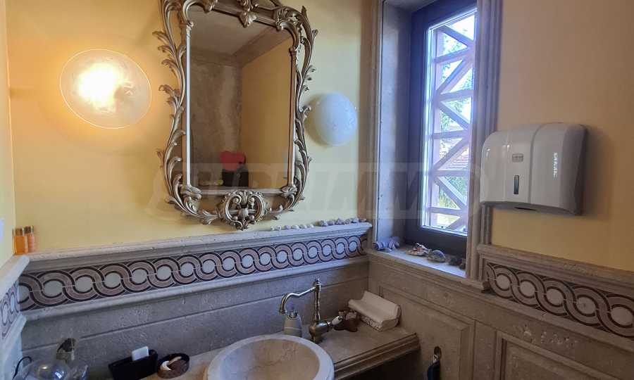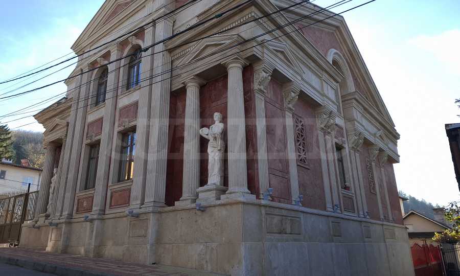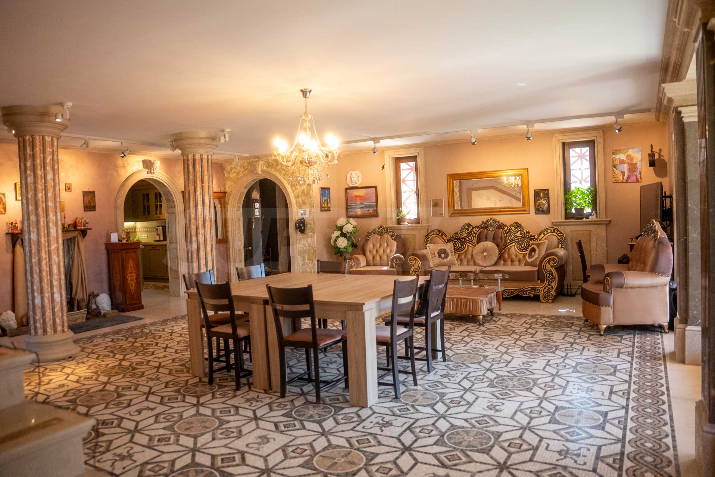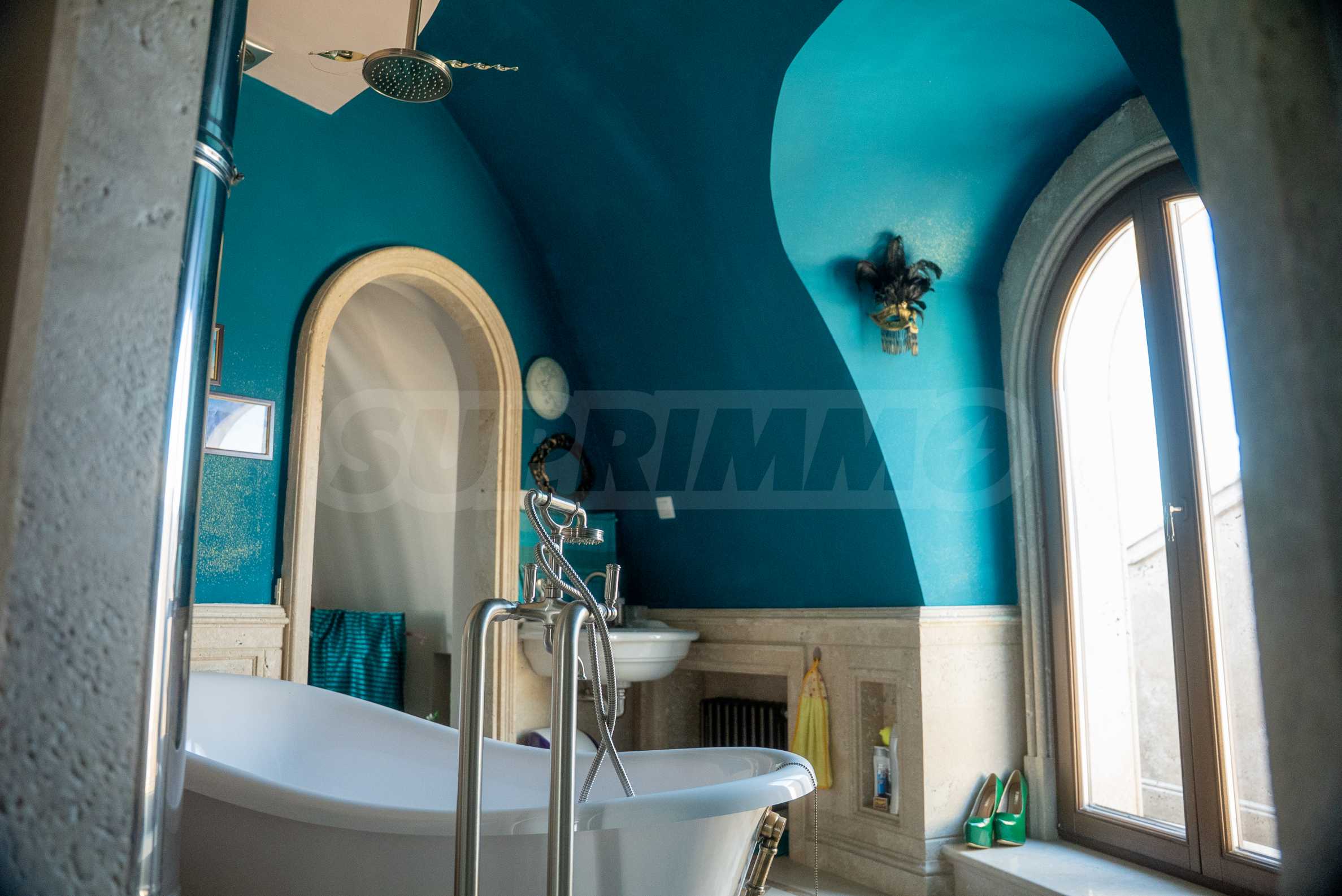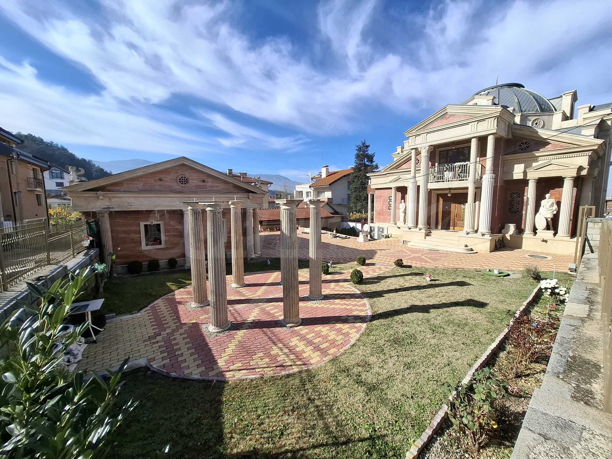 Fasada jest imponująca i niezwykle rozpoznawalna, zbudowana z naturalnego kamienia i trawertynu, o wyraźnie wyrażonych klasycznych proporcjach i symetrii. Masywne kolumny, frontony i elementy dekoracyjne tworzą wrażenie starożytnej monumentalności, godne prywatnej rezydencji lub reprezentacyjnej posiadłości najwyższej klasy.