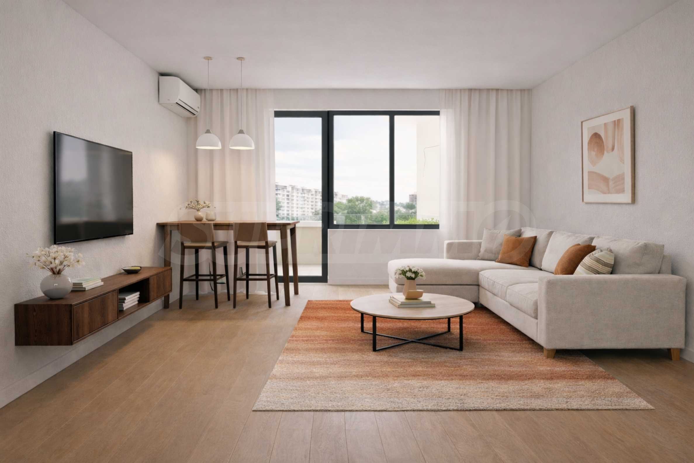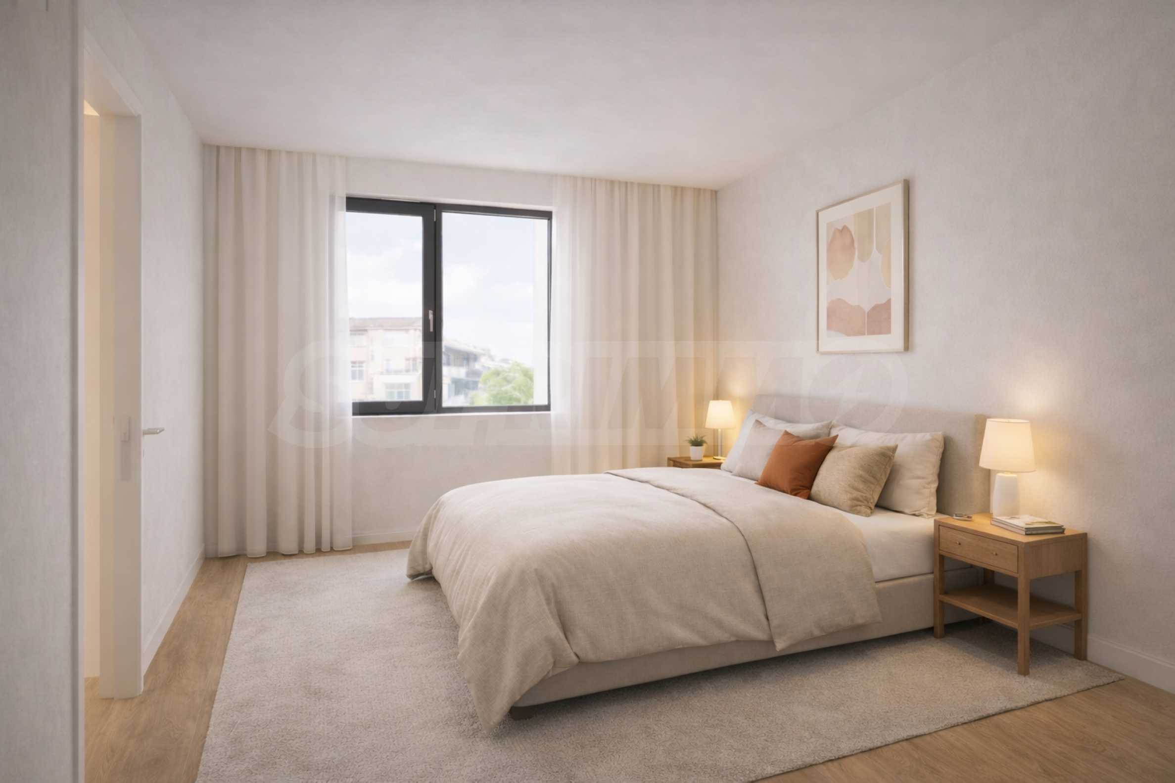 Nieruchomość jest sprzedawana w stanie wykończonym zgodnie z bułgarskimi standardami budowlanymi, z tynkiem i wylewką. Salon jest skierowany na zachód, w stronę ulicy Petko D. Petkov, co gwarantuje dobre doświetlenie naturalne. Sypialnia jest od strony wschodniej, z widokiem na wewnętrzny dziedziniec – to ciche i spokojne miejsce sprzyjające pełnemu wypoczynkowi.