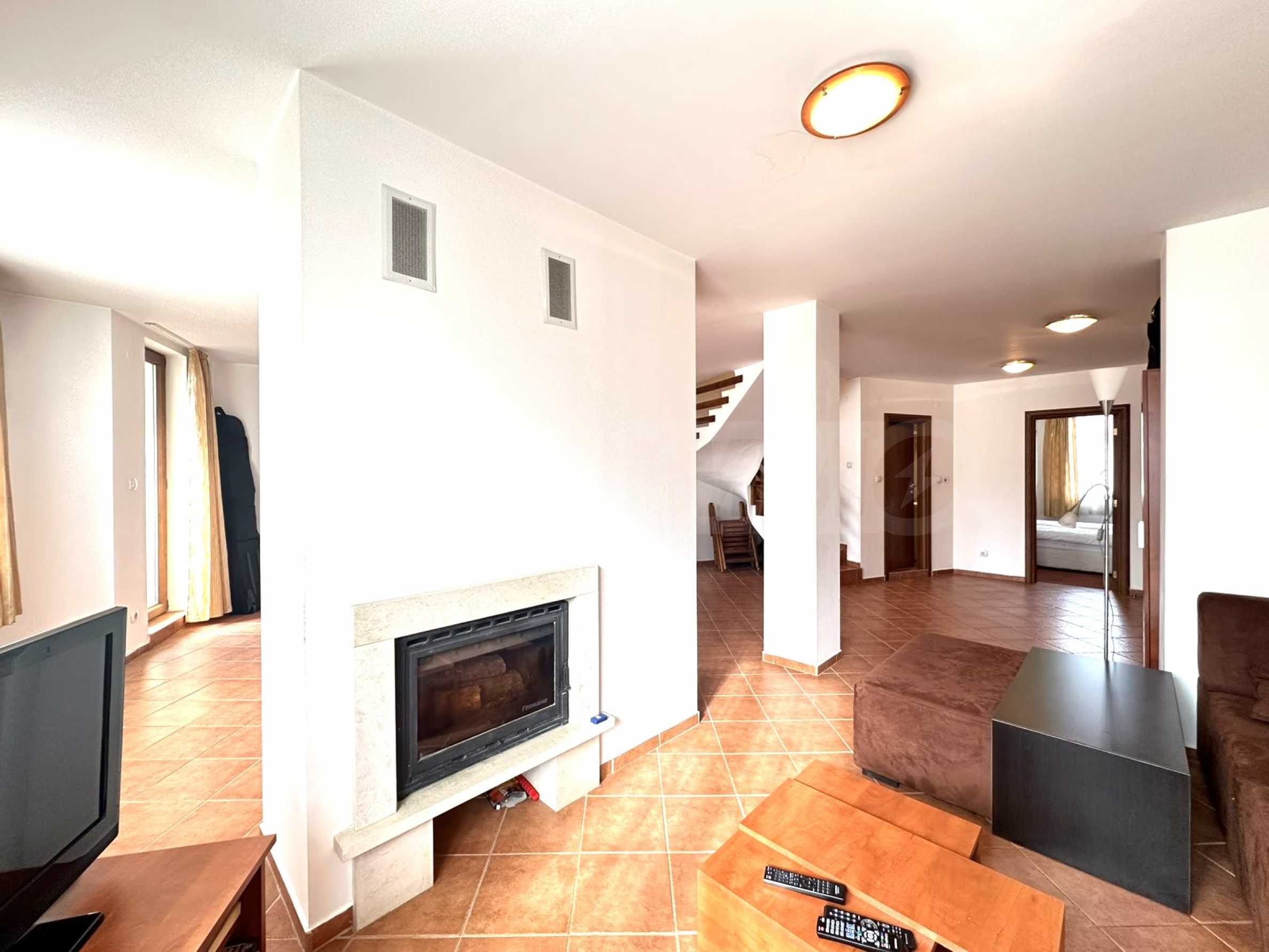Ogrzewanie zapewniają konwektory elektryczne oraz wbudowany kominek opalany drewnem w salonie.