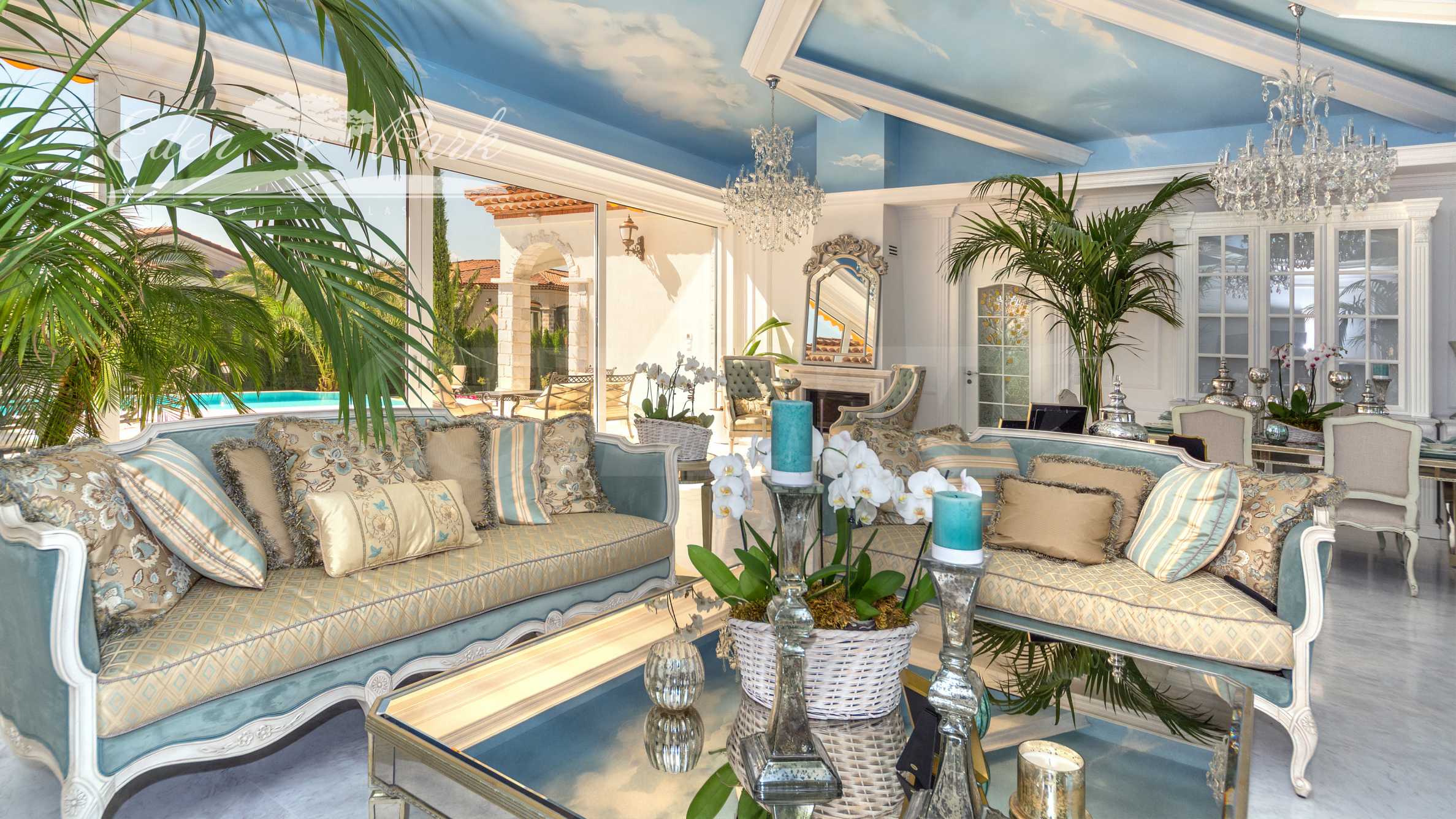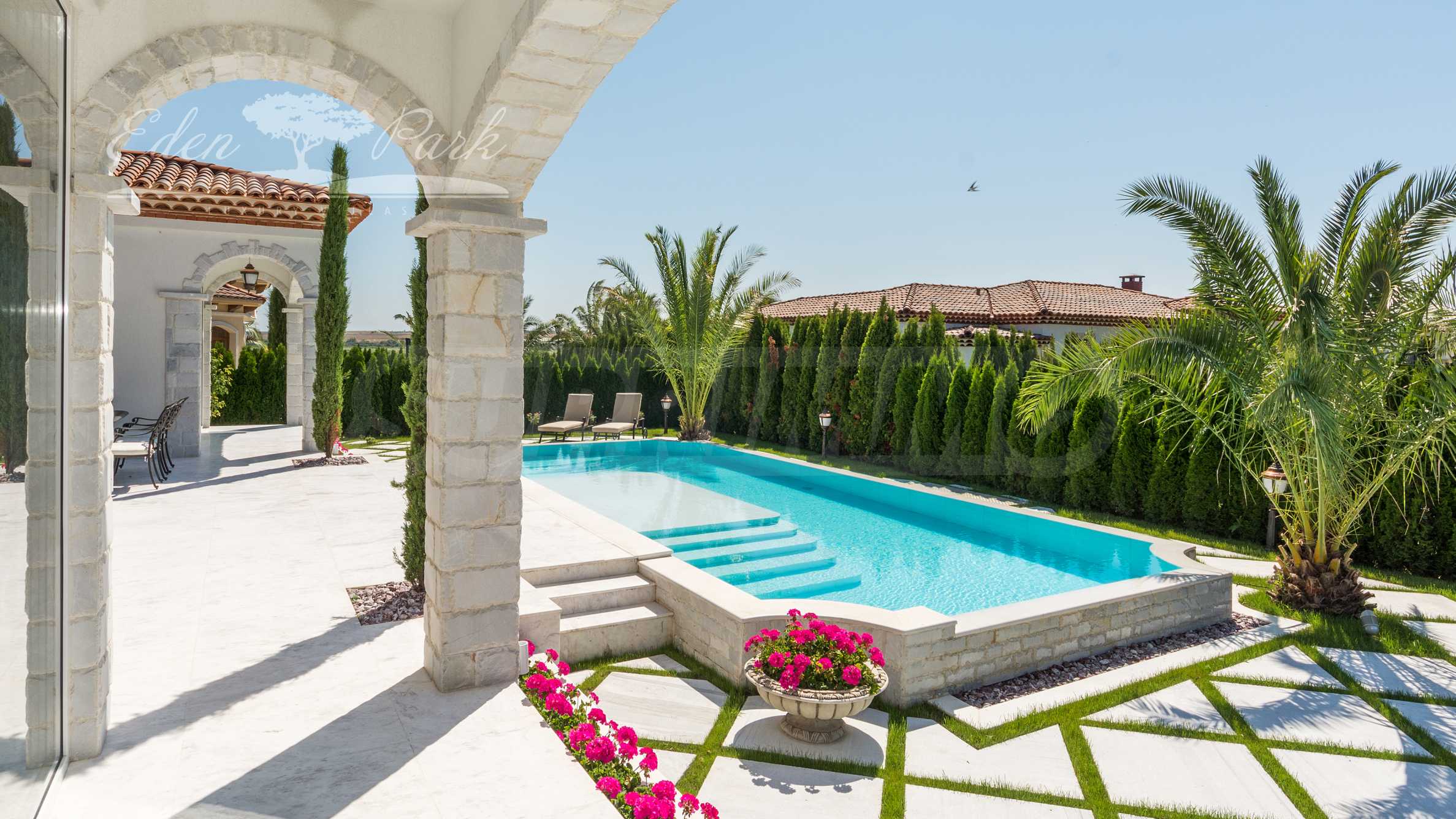 Weranda prowadzi do przestronnego basenu , położonego centralnie w ogrodzie i wyłożonego naturalnym marmurem Pyrgos Light. Dziedziniec jest bogato zagospodarowany, z egzotycznymi drzewami i kwiatami, a także posiada zagospodarowane strefy relaksu i leżaki.