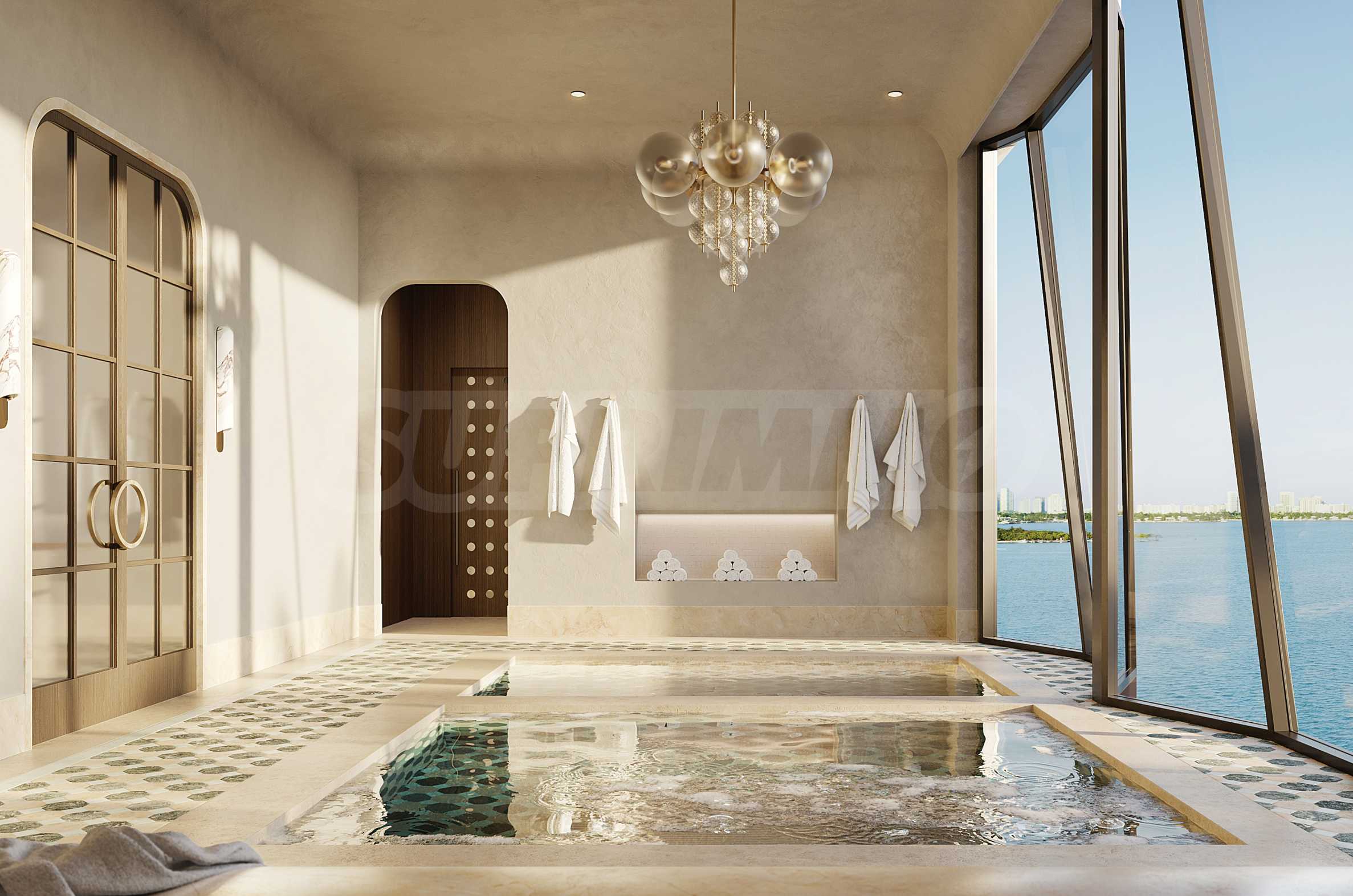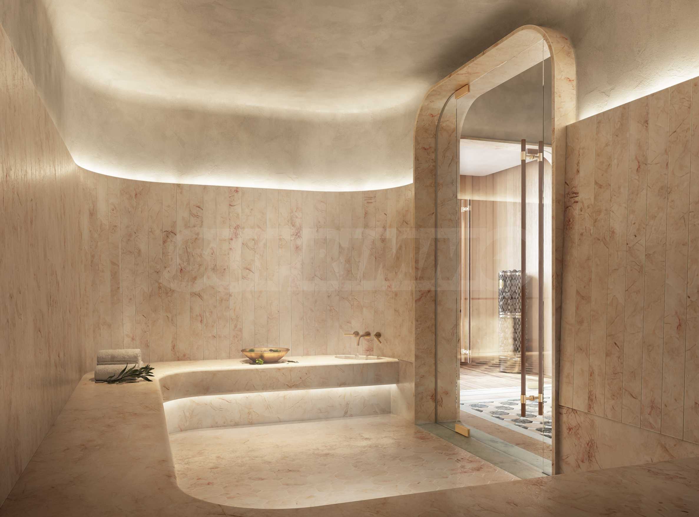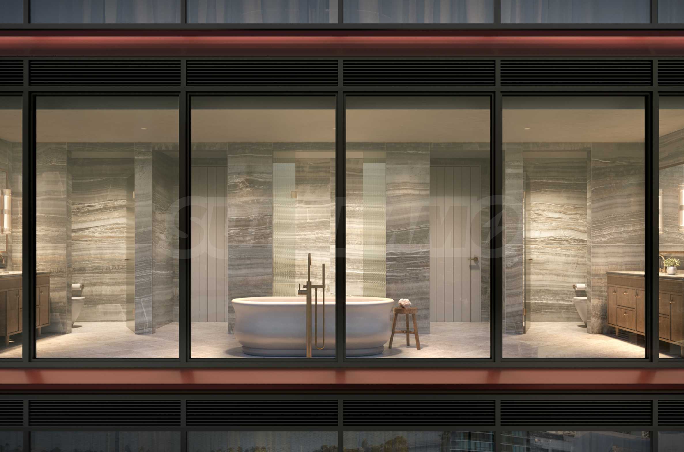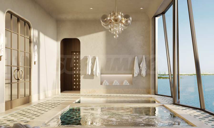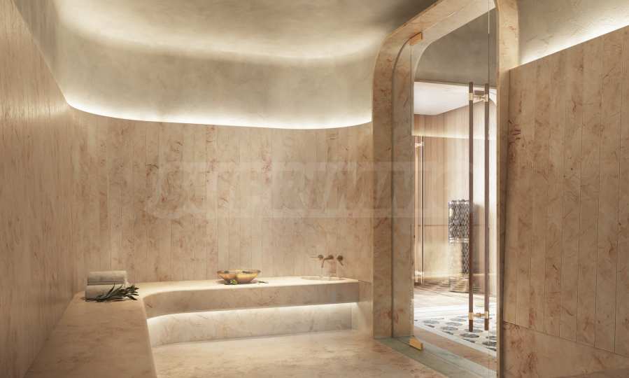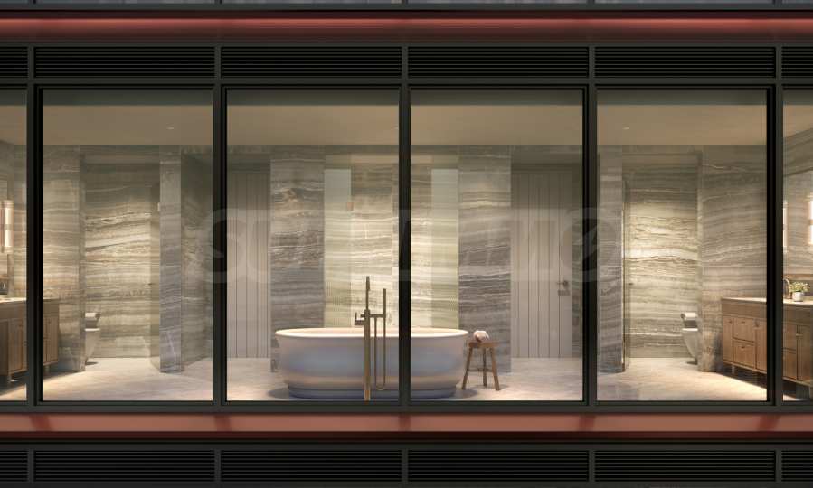 Łazienki zachwycają elegancją i precyzją wykonania, stanowiąc naturalne przedłużenie stref hydroterapii w budynku. Przestronne, zaokrąglone wanny, miękkie marmurowe powierzchnie, mosiężne detale i delikatnie żłobkowane szkło tworzą poczucie przytulności i relaksu. Każda sypialnia ma własną łazienkę, a sypialnia główna została zaprojektowana jako osobista oaza spa – z imponującą wanną, posadzką z trawertynu i ścianami wyłożonymi porcelaną w kolorze greige onyx. Wysokiej klasy ceramika sanitarna i akcesoria marek Dornbracht i Duravit dopełniają całości, zamieniając codzienne rytuały w chwile prawdziwej przyjemności.