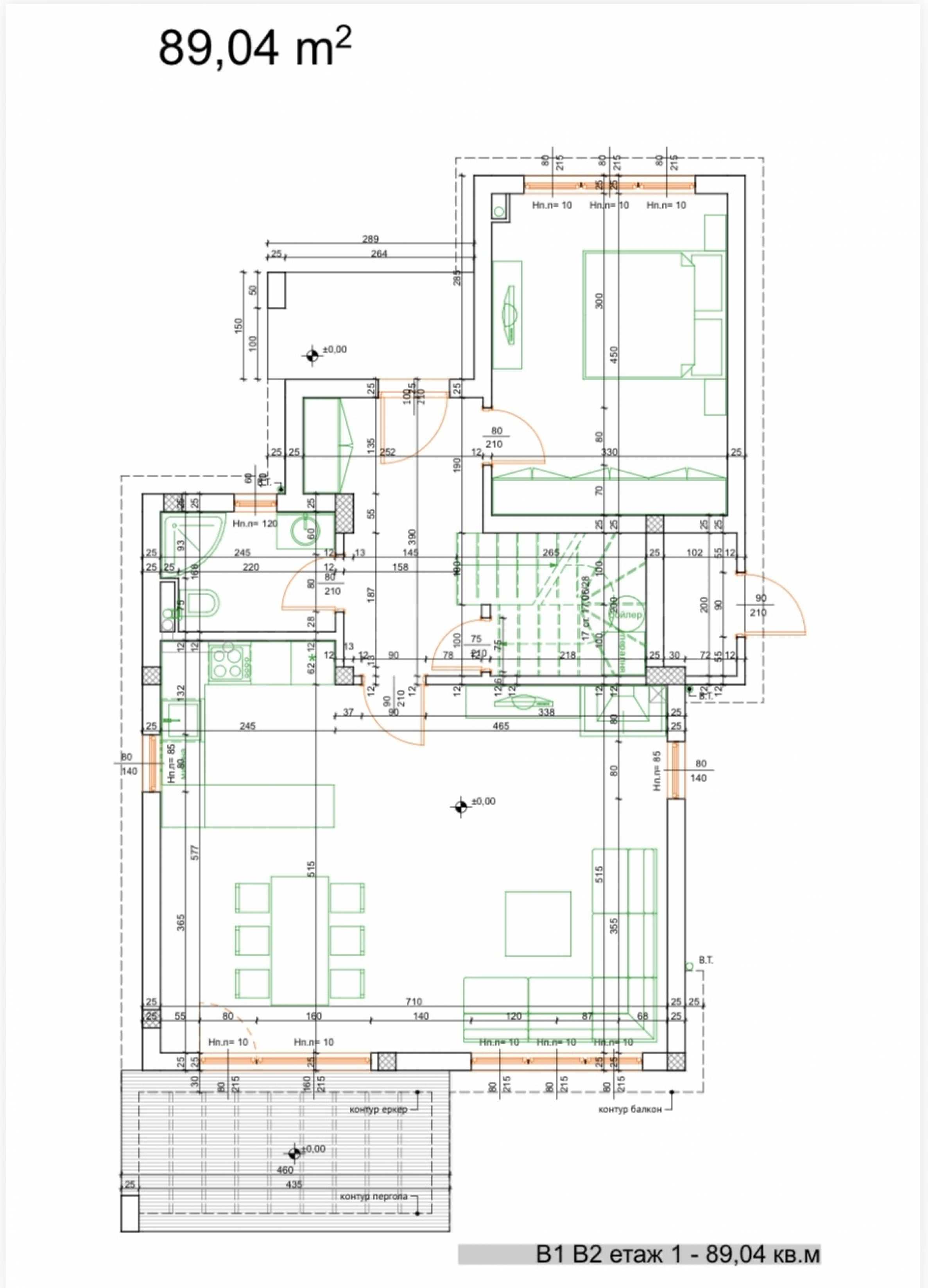• pierwsze piętro: hol wejściowy, salon z aneksem kuchennym, jedna sypialnia, łazienka z toaletą, pomieszczenie gospodarcze pod schodami i weranda;