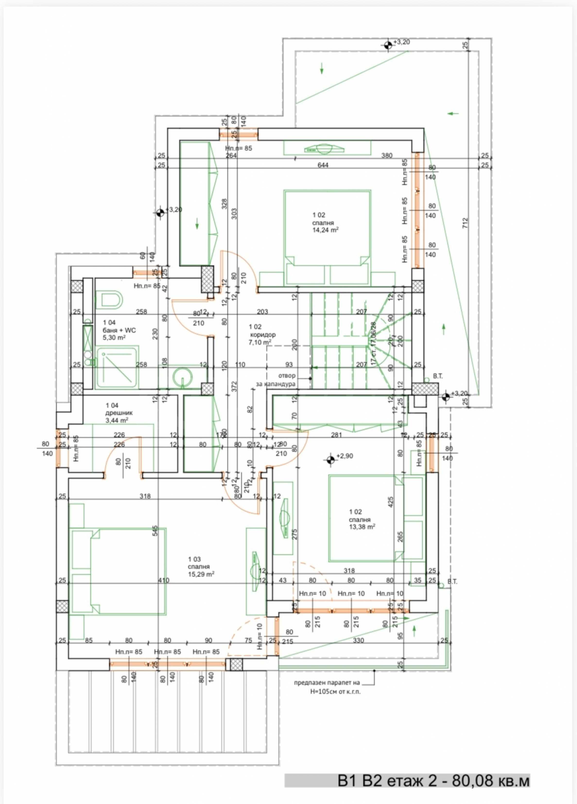 • drugie piętro: trzy sypialnie, w tym jedna z garderobą, łazienka z toaletą, taras.