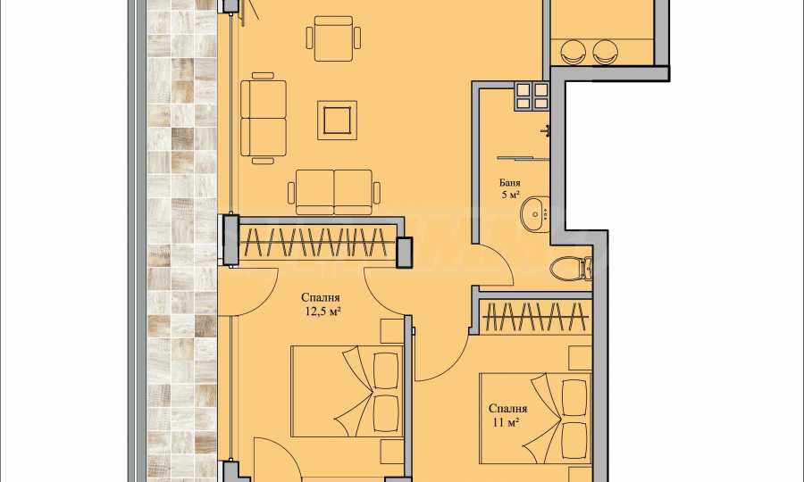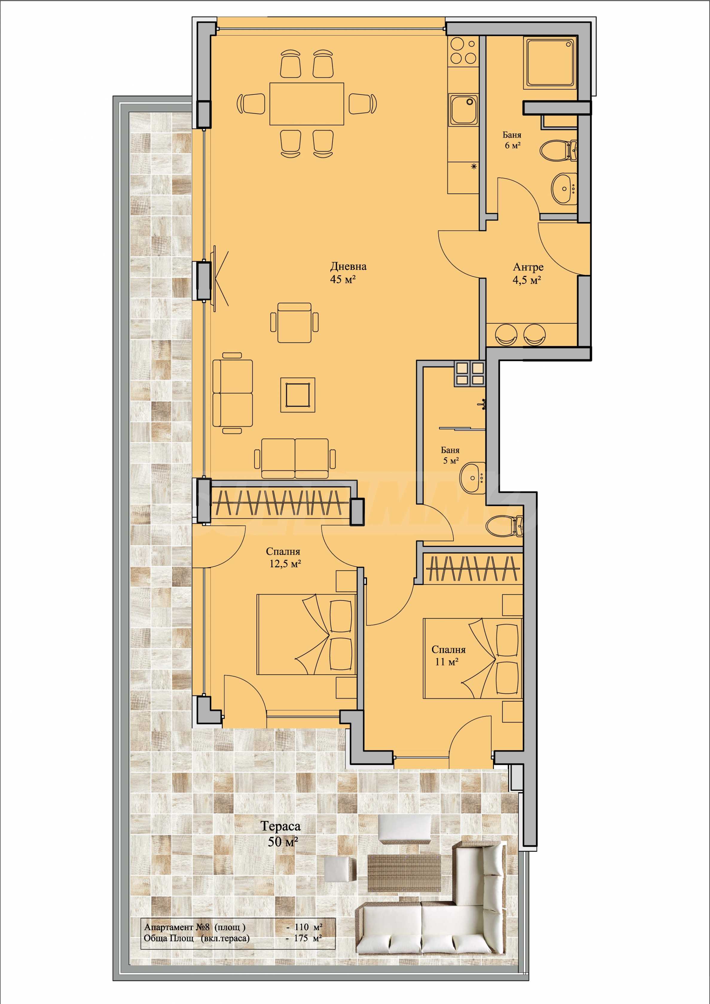 Apartament znajduje się na czwartym piętrze z pięciu, o łącznej powierzchni ok. 175 mkw., z czego 110 mkw. to powierzchnia mieszkalna i przestronny taras widokowy o powierzchni ok. 50 mkw., z którego rozpościera się imponujący widok na Sofię i Górę Witosza, niemożliwy do przesłonięcia.