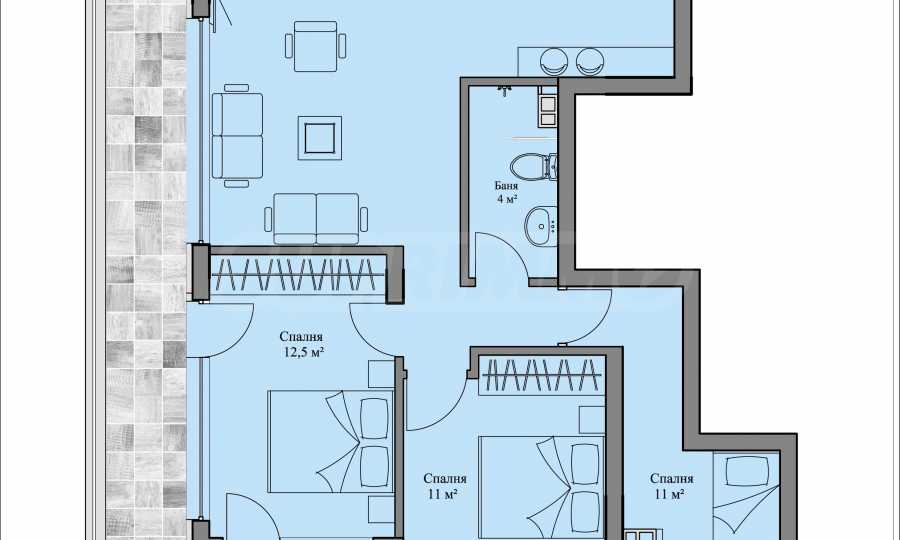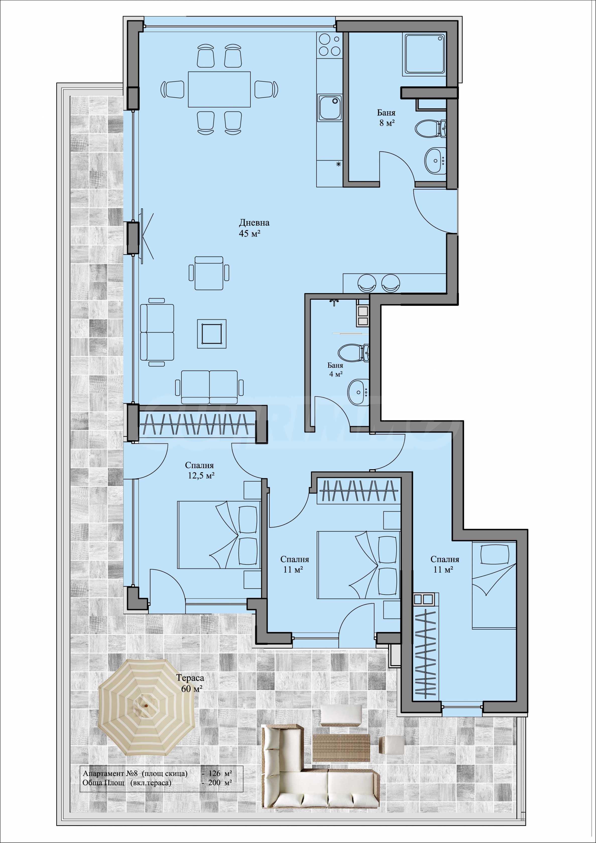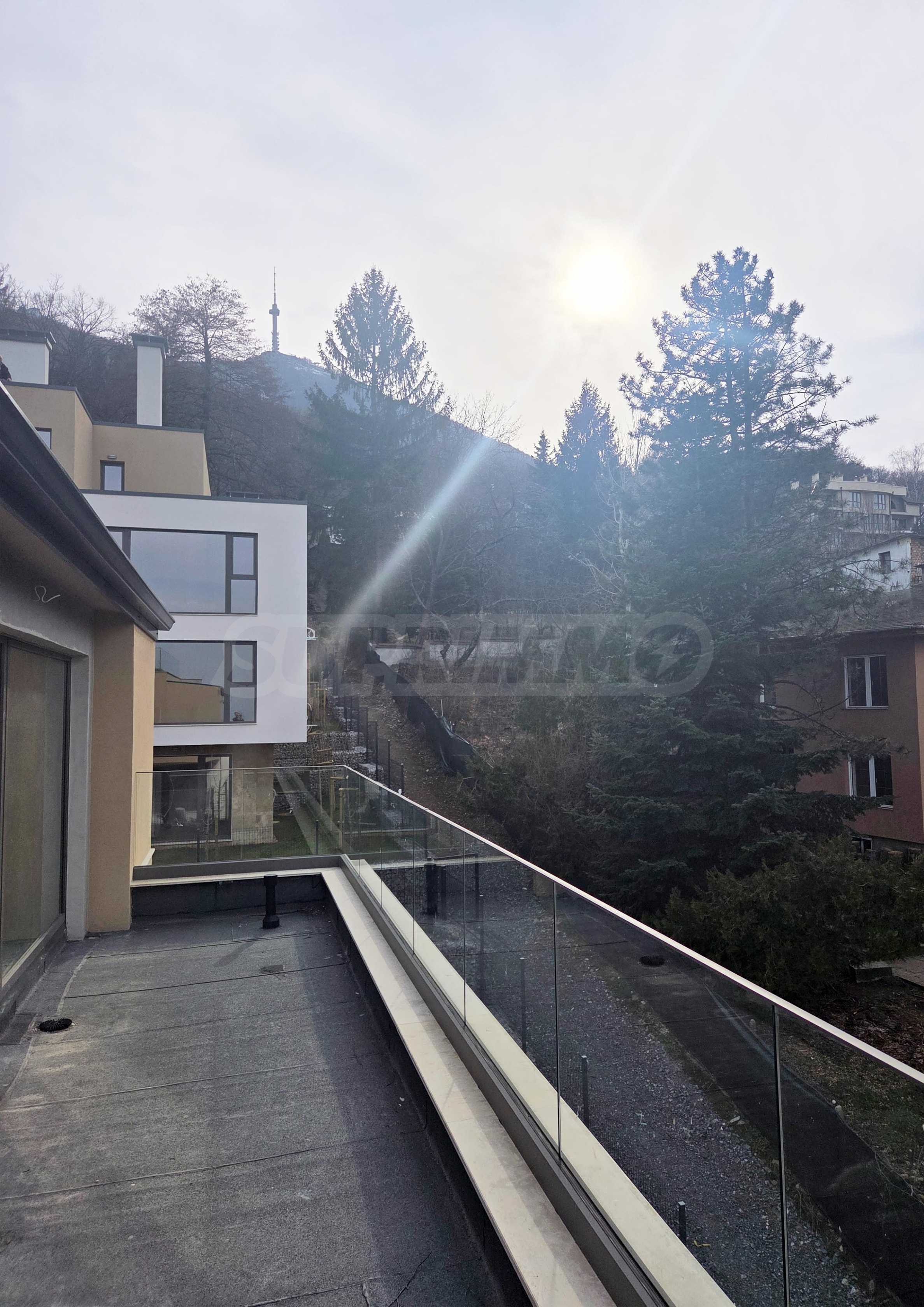Apartament znajduje się na czwartym piętrze z pięciu, o łącznej powierzchni około 200 mkw., z czego 126 mkw. to powierzchnia mieszkalna i przestronny taras widokowy o powierzchni około 60 mkw., z którego roztacza się imponujący widok na Sofię i Górę Witosza, którego nie można zasłonić.