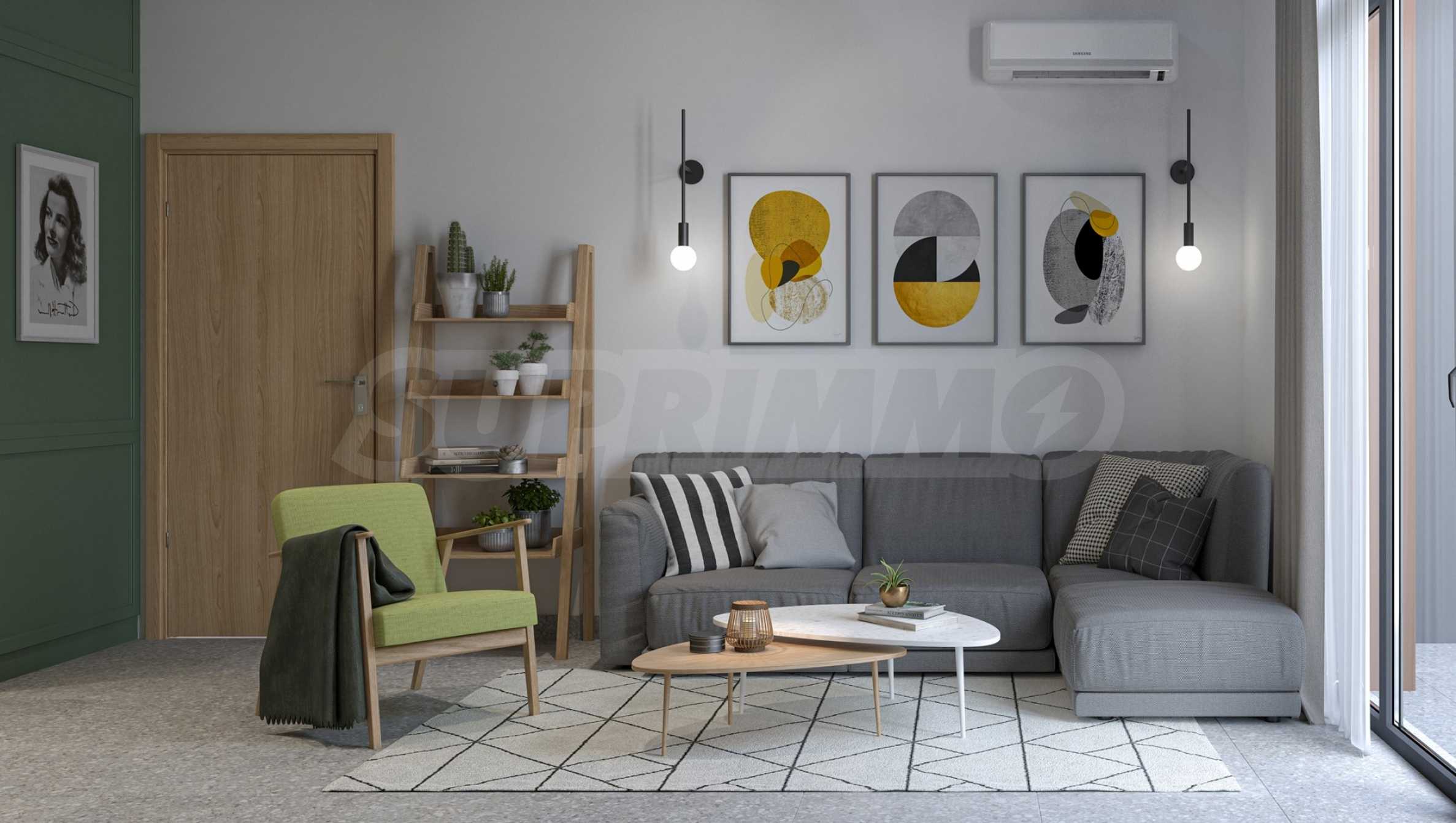 Mieszkanie jest sprzedawane w stanie wykończonym zgodnie z bułgarskim Kodeksem Budowlanym, z tynkiem i wylewką. Załączone wizualizacje mają na celu bardziej realistyczne przedstawienie możliwego umeblowania nieruchomości.
