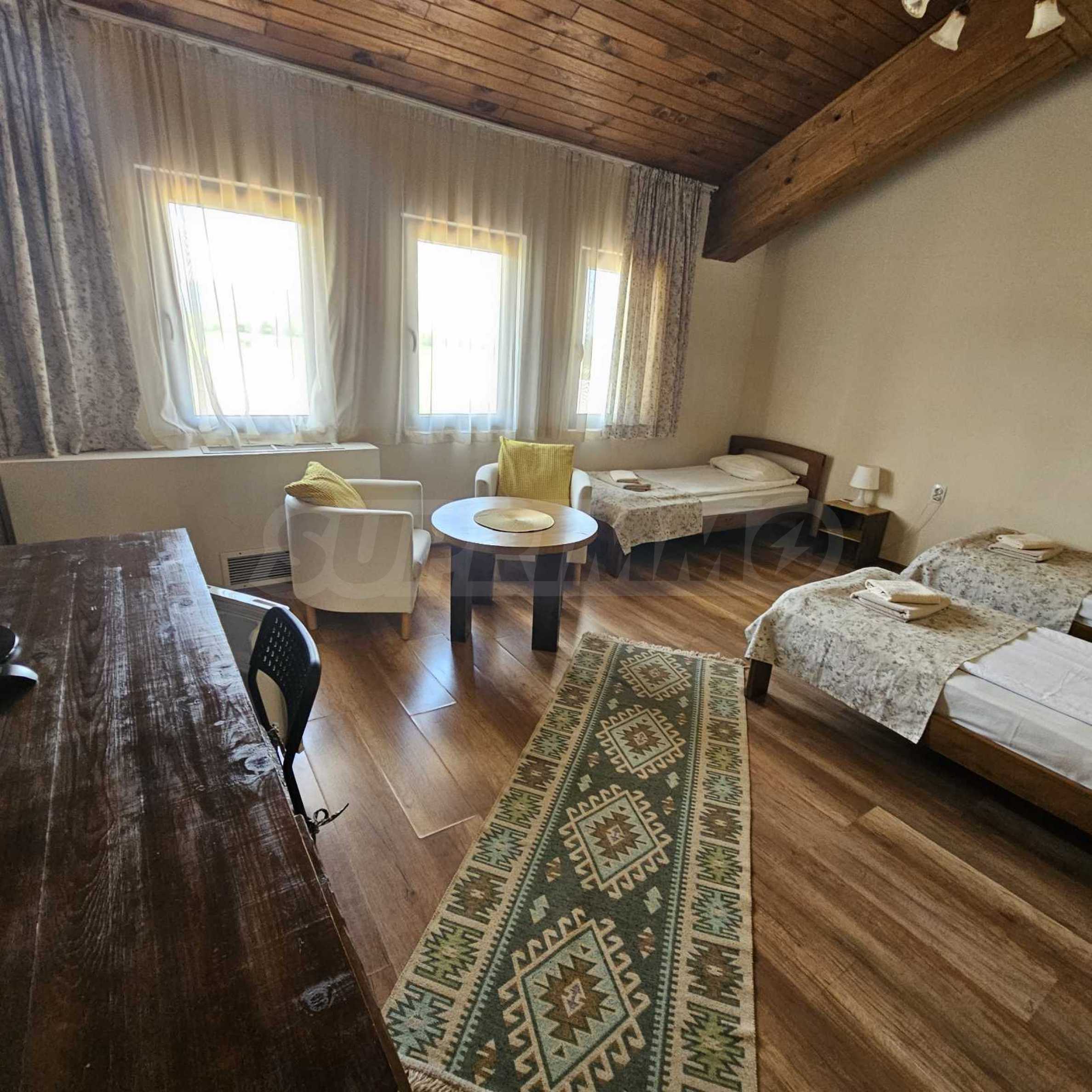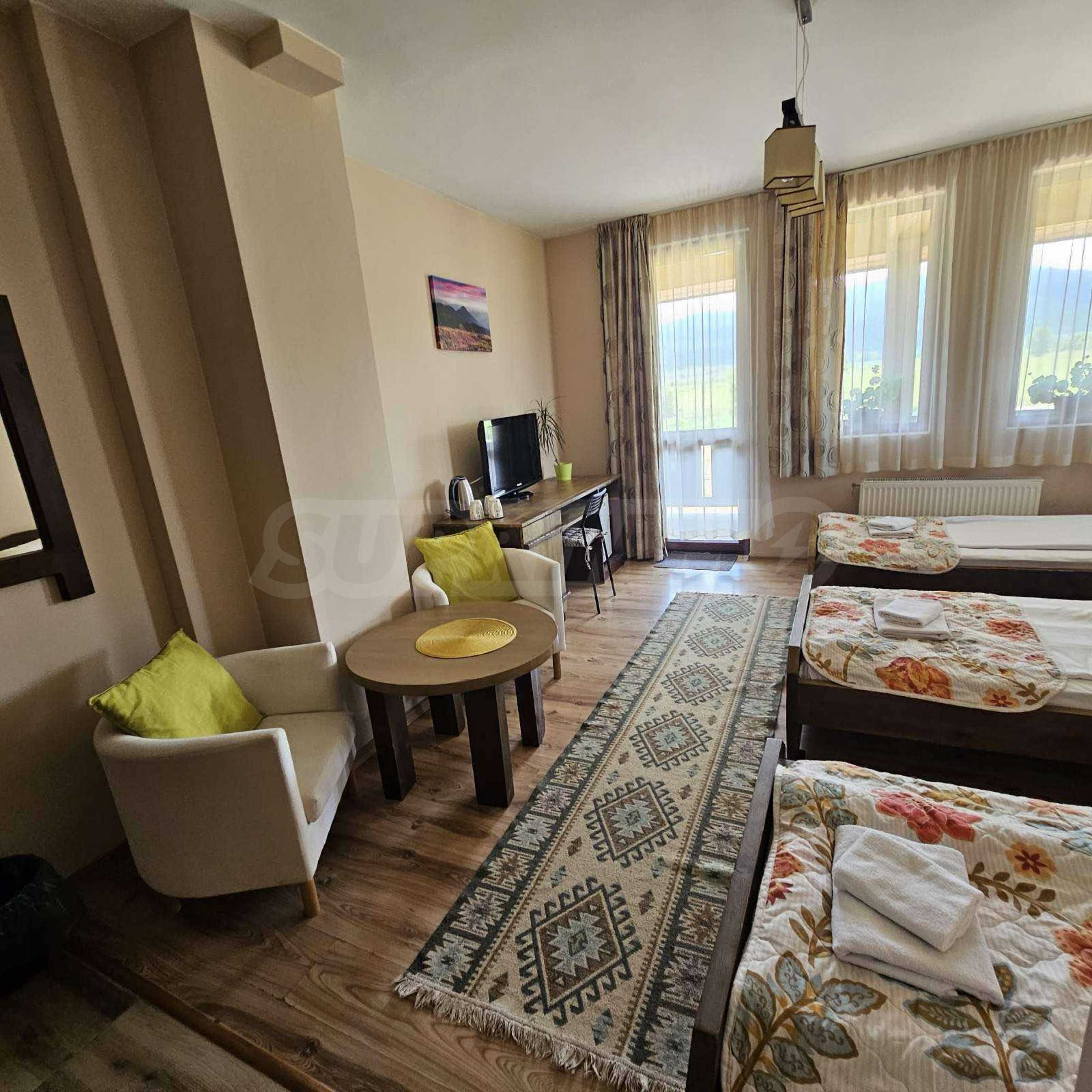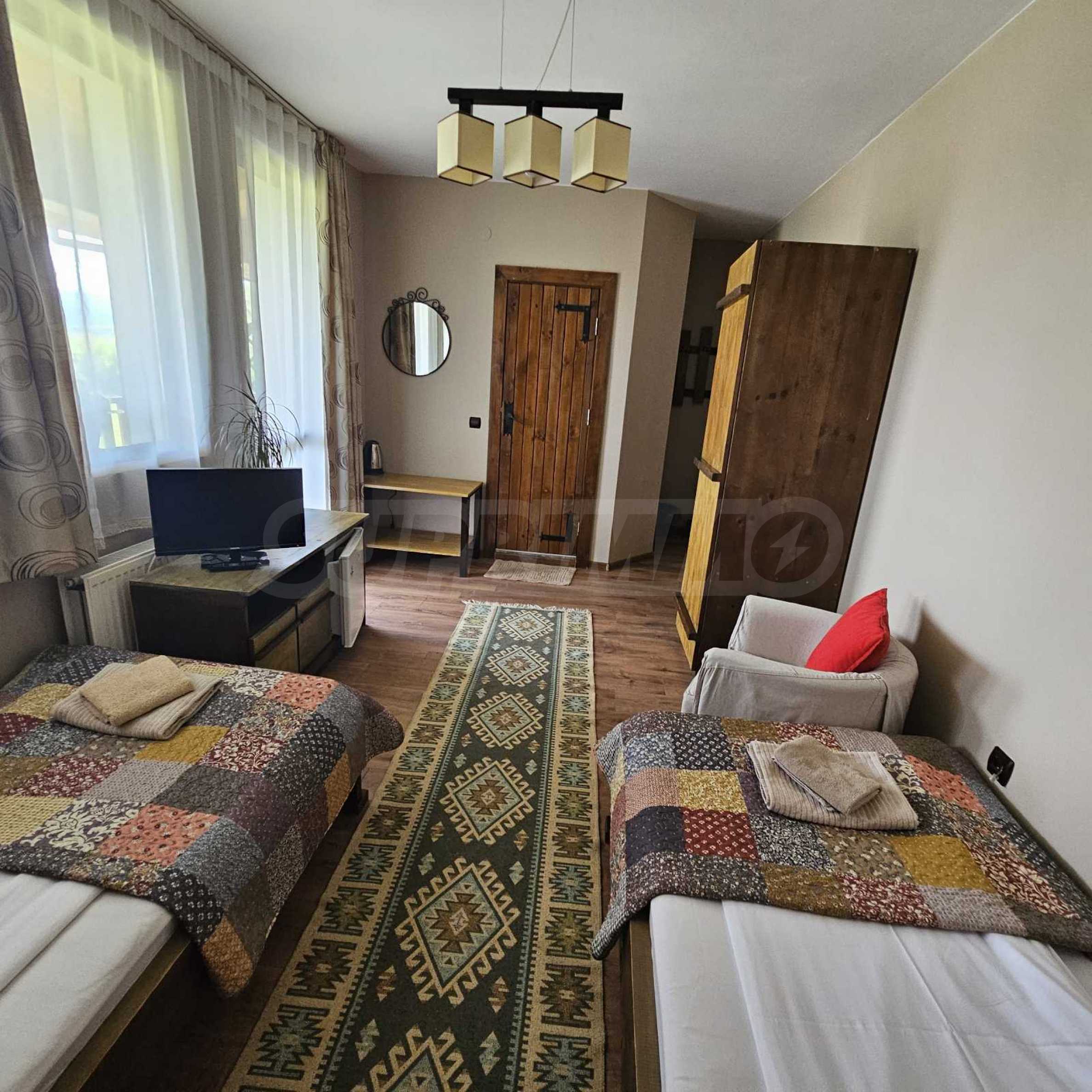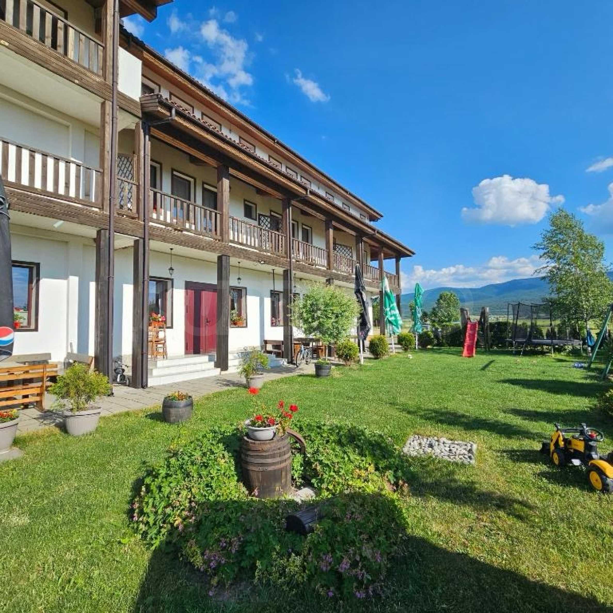 Oferujemy na sprzedaż w pełni wyposażony i funkcjonalny obiekt biznesowy położony u podnóża Gór Riła, w malowniczej miejscowości Biełczyn, zaledwie 60 km od Sofii i 15 minut od Borowca. Obiekt to pensjonat z restauracją-zajazdem, czynny przez cały rok i cieszący się doskonałą reputacją online, z oceną 9,4 na Booking.com.