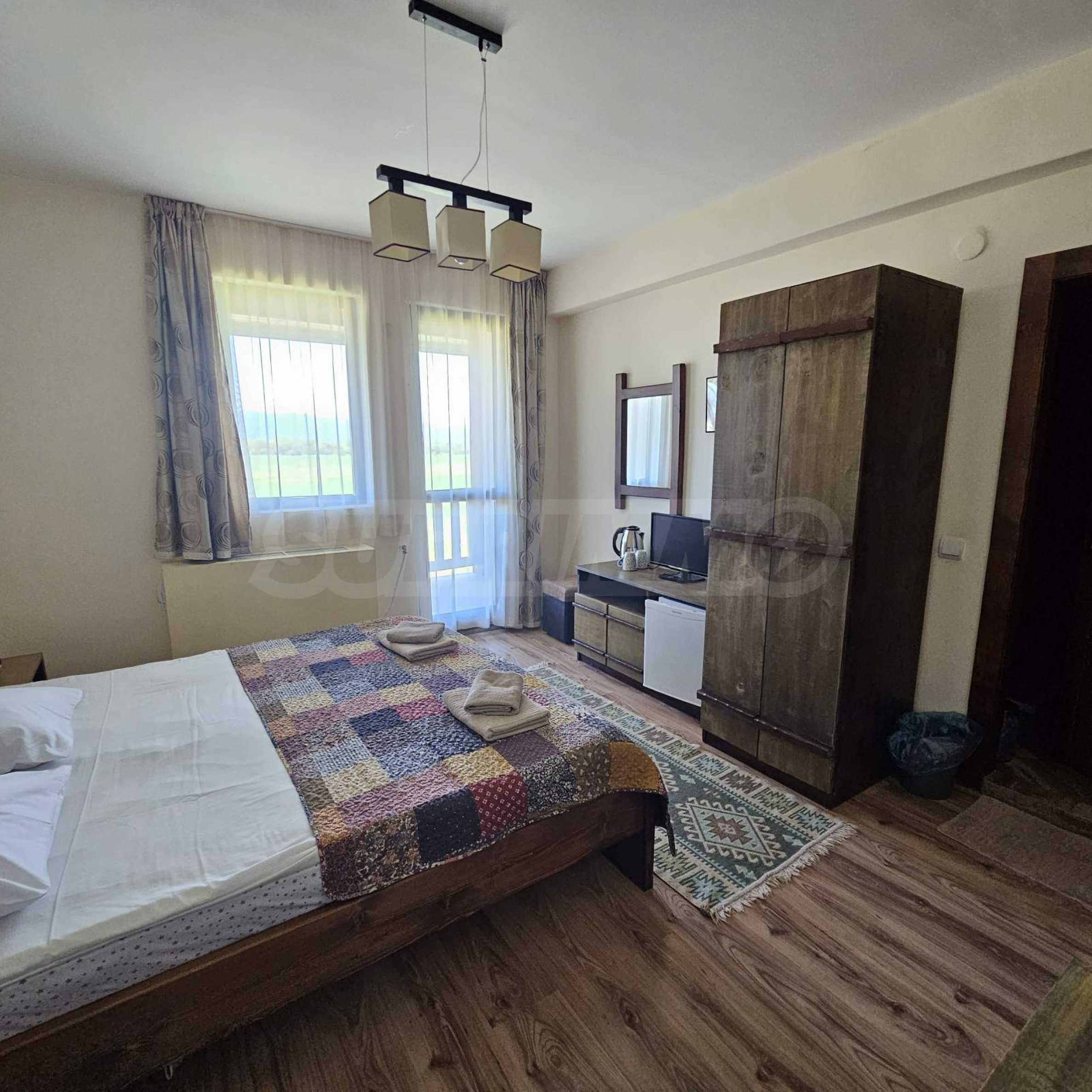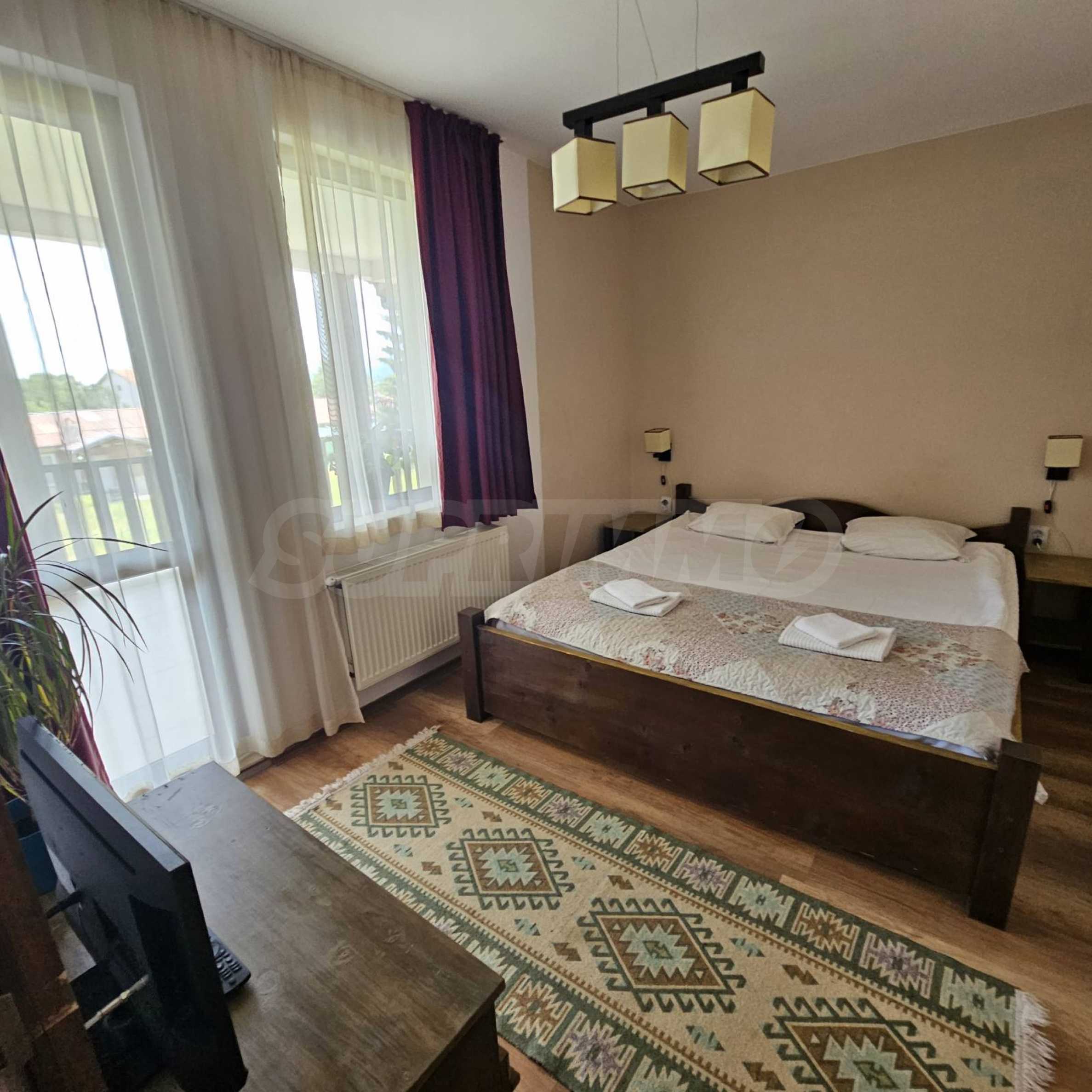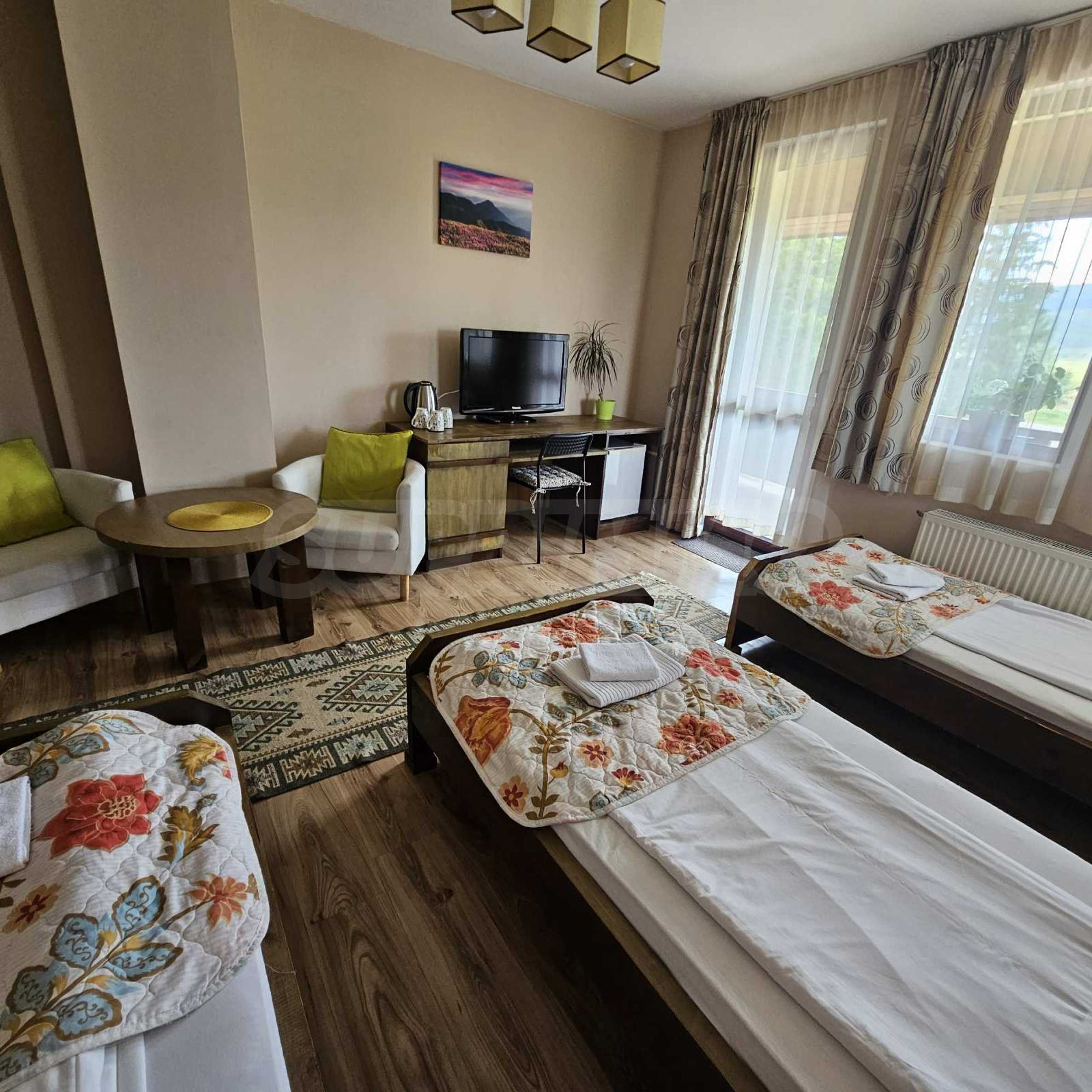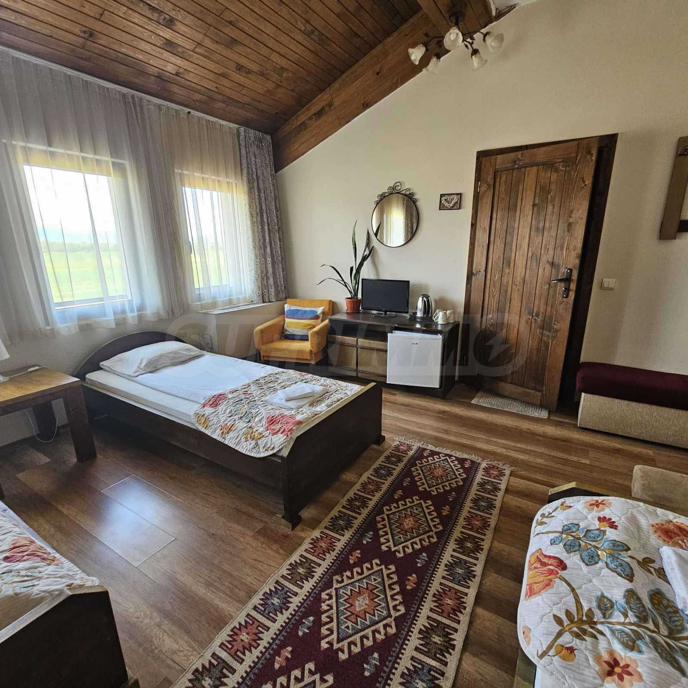 Oferujemy na sprzedaż w pełni wyposażony i funkcjonalny obiekt biznesowy położony u podnóża Gór Riła, w malowniczej miejscowości Biełczyn, zaledwie 60 km od Sofii i 15 minut od Borowca. Obiekt to pensjonat z restauracją-zajazdem, czynny przez cały rok i cieszący się doskonałą reputacją online, z oceną 9,4 na Booking.com.