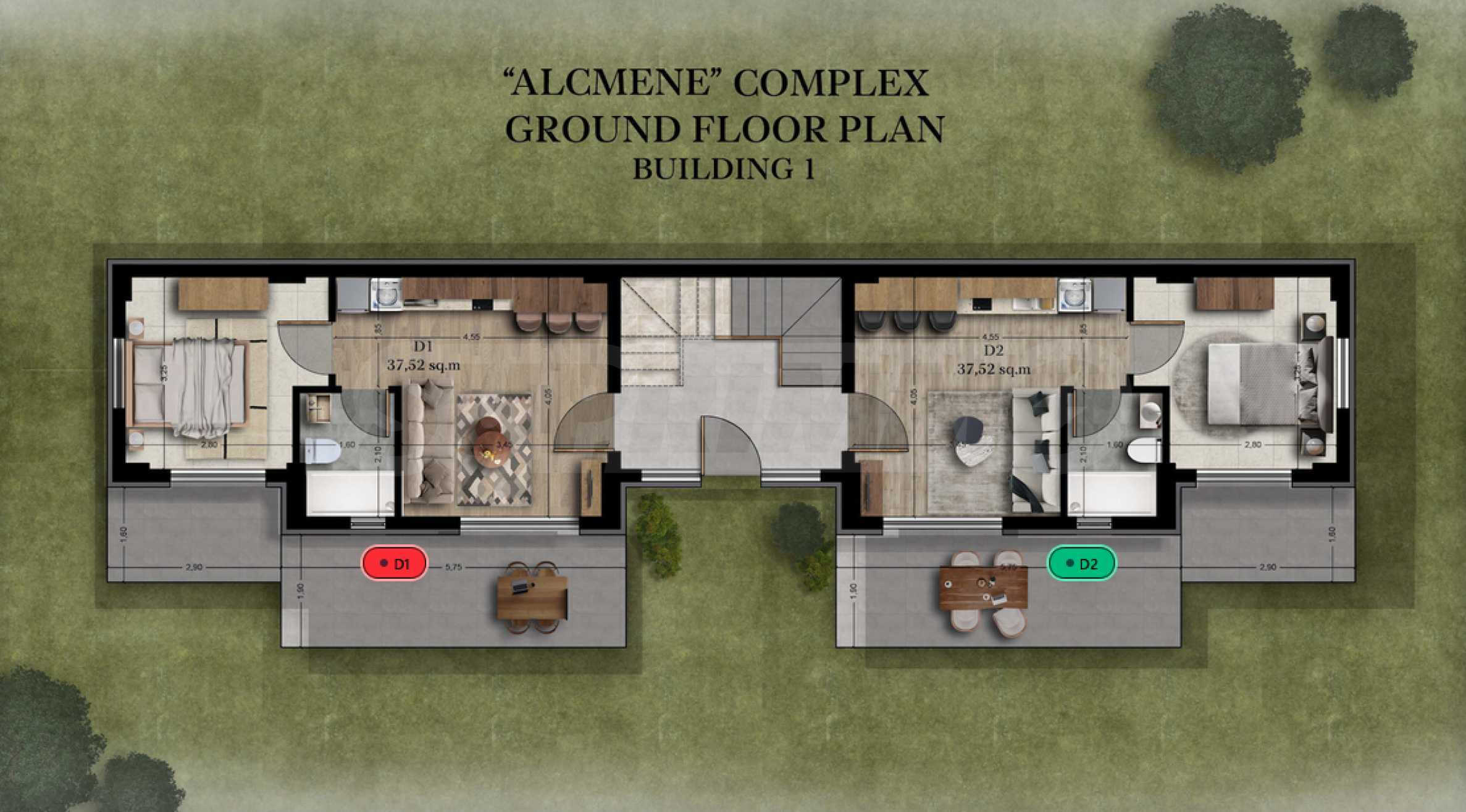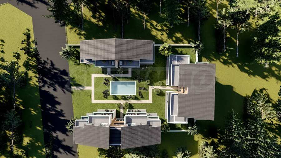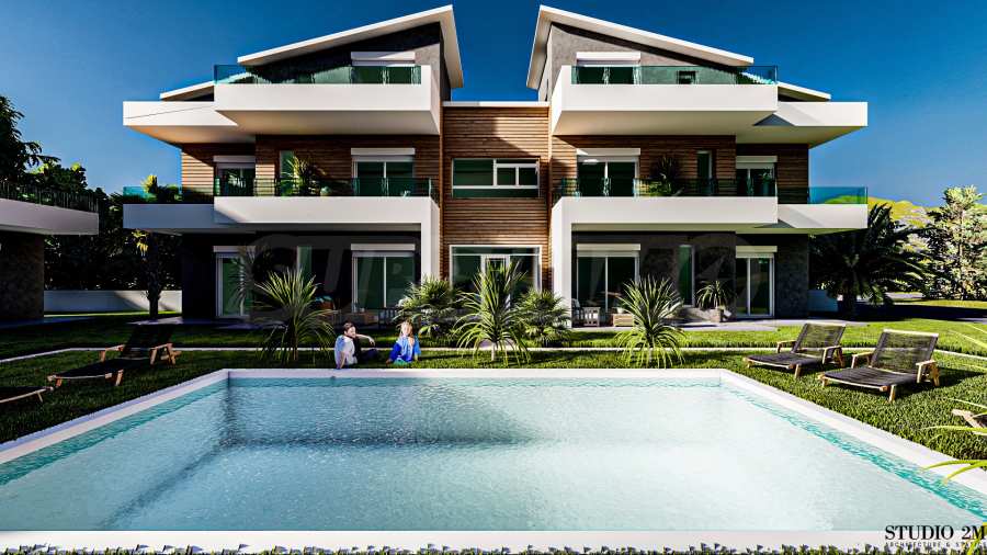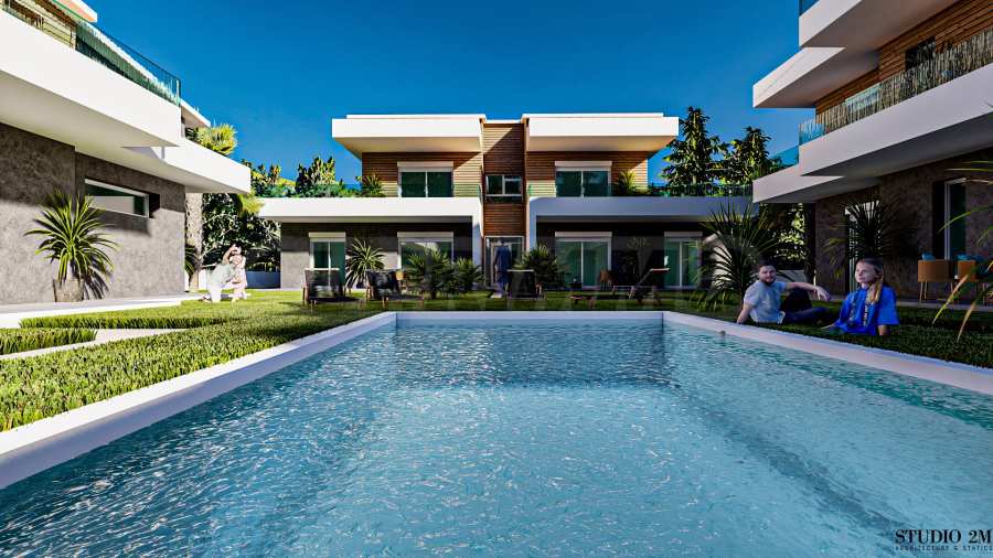 Kompleks składa się z trzech budynków – dwóch z czterema apartamentami i jednego z dwoma apartamentami, co gwarantuje większą prywatność i spokój mieszkańcom. Dodatkowo, kompleks dysponuje basenem do wspólnego użytku, który zapewni ochłodę w upalne letnie dni. Apartamenty dwupokojowe i trzypokojowe charakteryzują się funkcjonalnym rozkładem, zaprojektowanym z dbałością o wygodę codziennego życia. Apartamenty dwupokojowe znajdują się na parterach budynków i posiadają wspaniałe werandy oraz wyjście na dziedziniec, natomiast apartamenty trzypokojowe posiadają słoneczne tarasy na pierwszym i drugim piętrze.