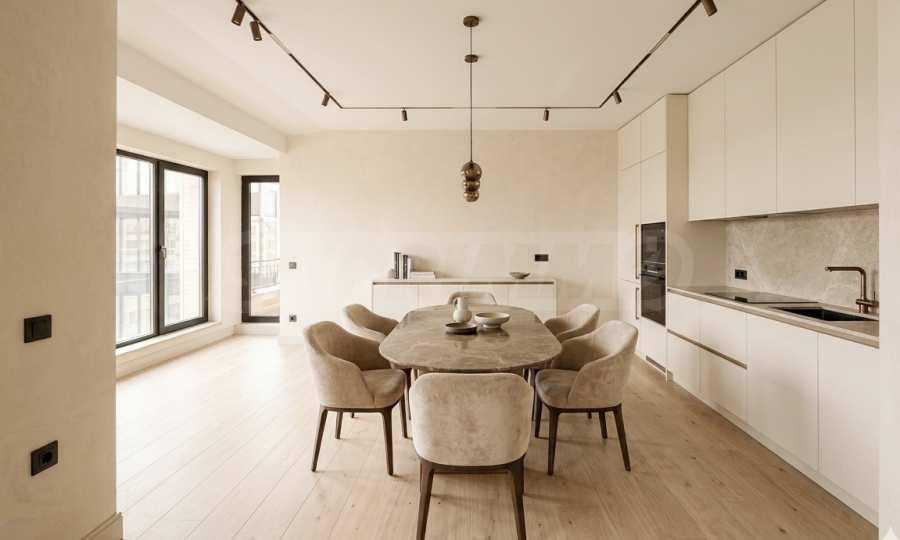 Apartament o powierzchni całkowitej 222 mkw. usytuowany jest na 4 piętrze (trzecim piętrze budynku mieszkalnego) z 5, z ekspozycją wschód/południe/północ.