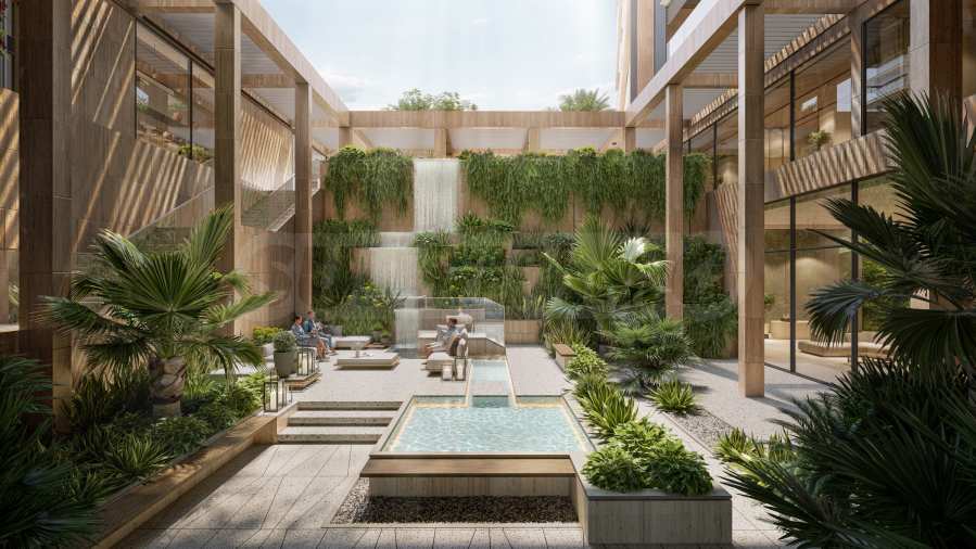 Zagospodarowane tereny zielone, zacienione tarasy i starannie zaprojektowane ogrody dopełniają ogólnego poczucia spokoju i harmonii, zamieniając każdy zakątek kompleksu w miejsce relaksu, inspirowane bliskością morza.