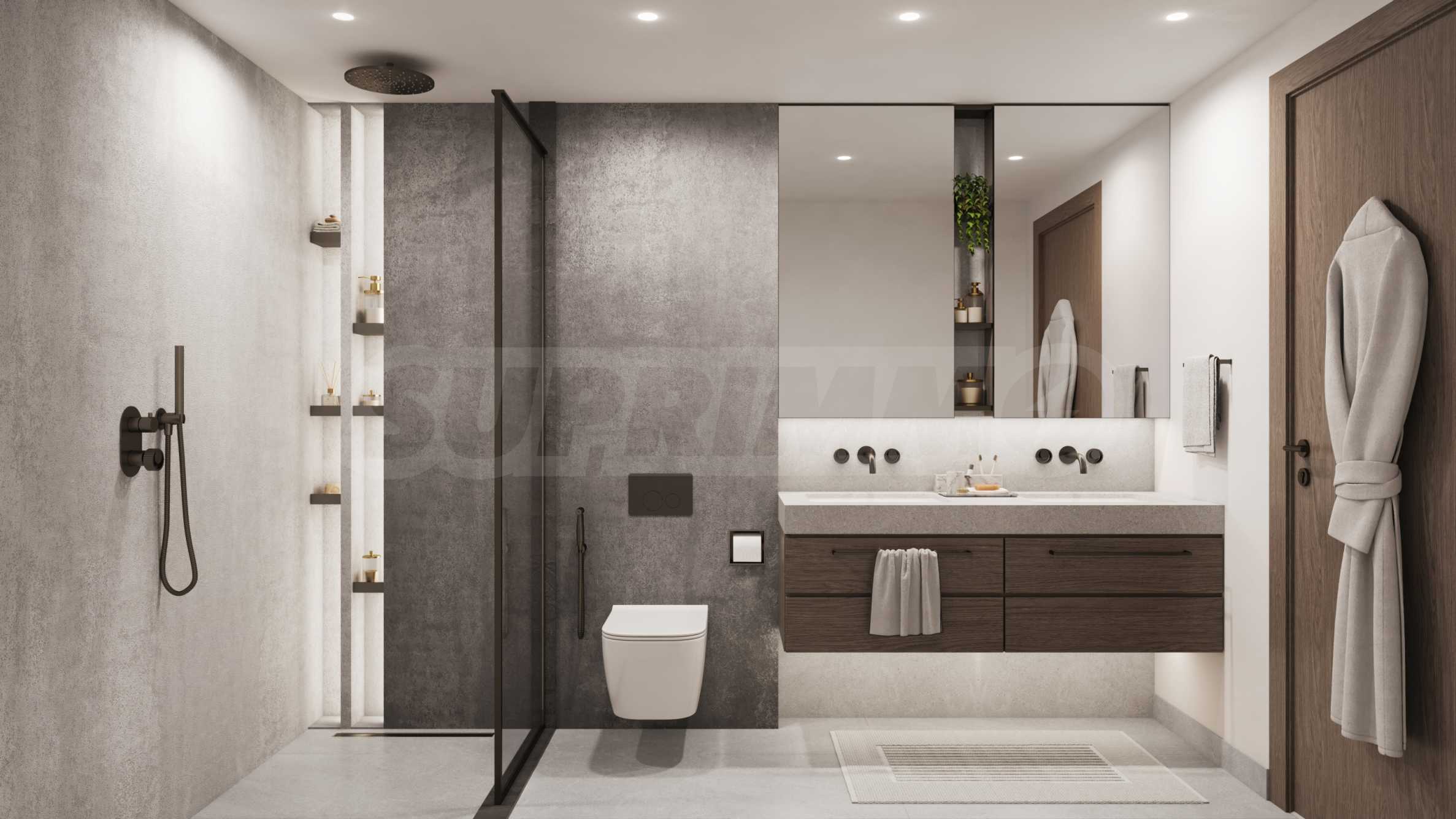 Apartamenty są oddawane w pełni wykończone „pod klucz”, łącznie z drzwiami wejściowymi i wewnętrznymi, podłogami, oświetleniem, wyposażonymi kuchniami i wykończonymi łazienkami.