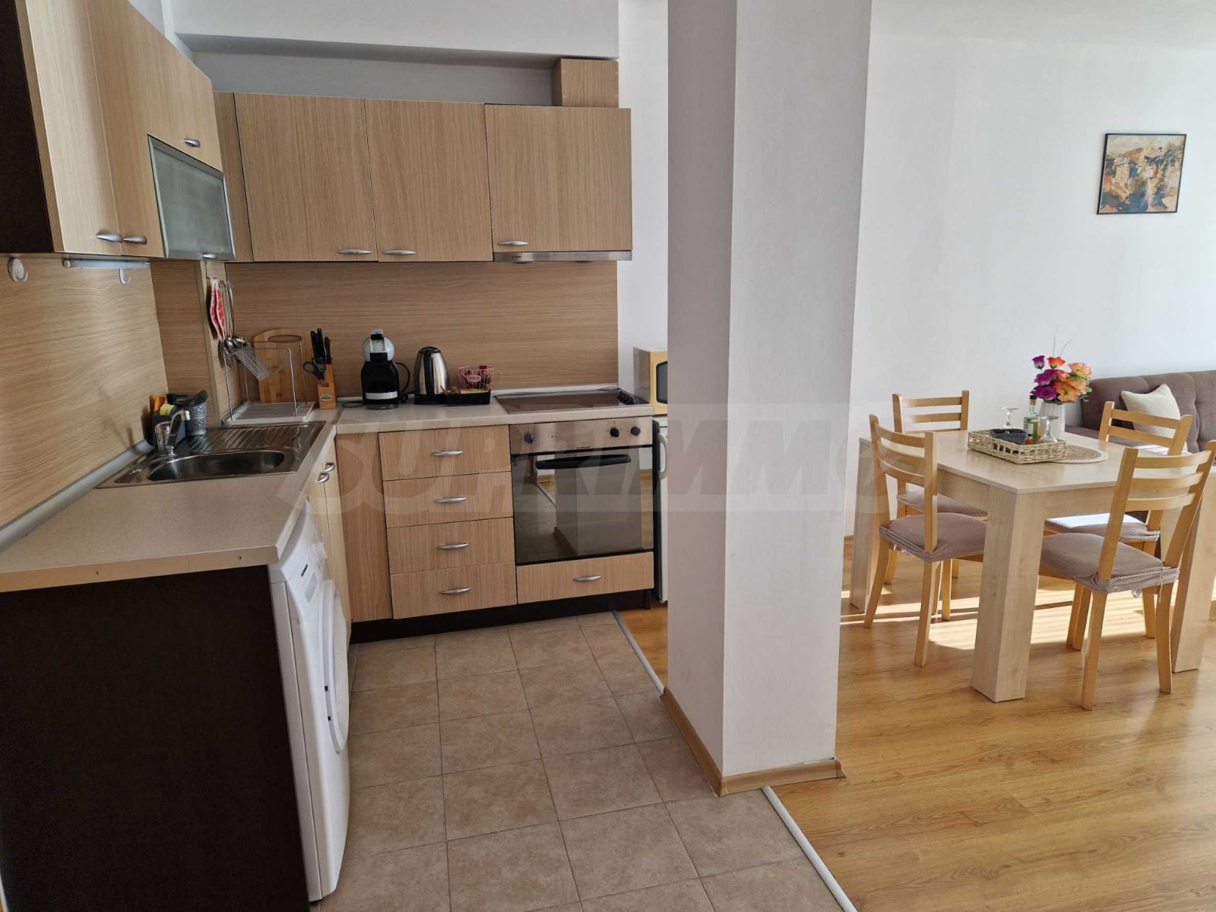 • Przestronny i jasny salon z w pełni wyposażoną kuchnią ze wszystkimi niezbędnymi sprzętami AGD, łącznie z pralką;