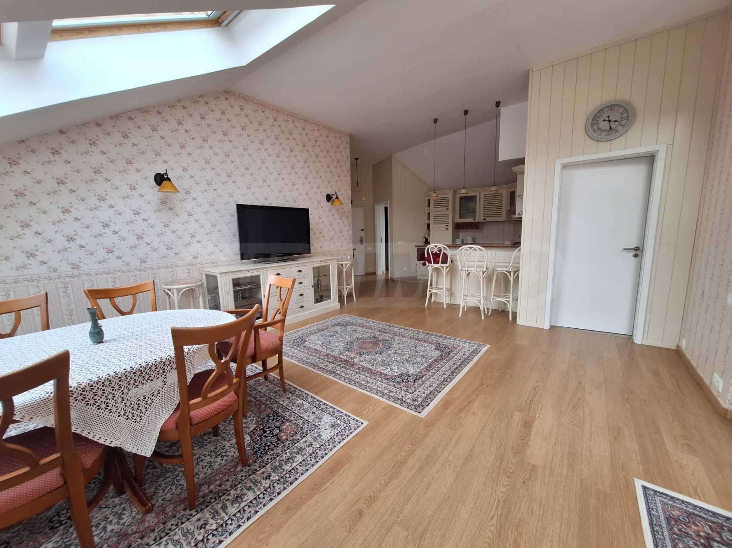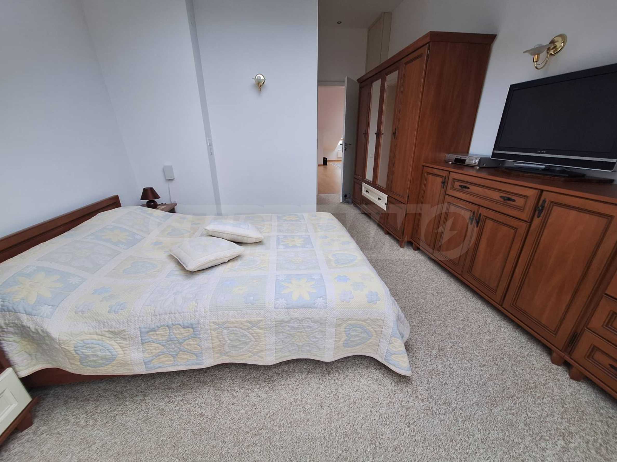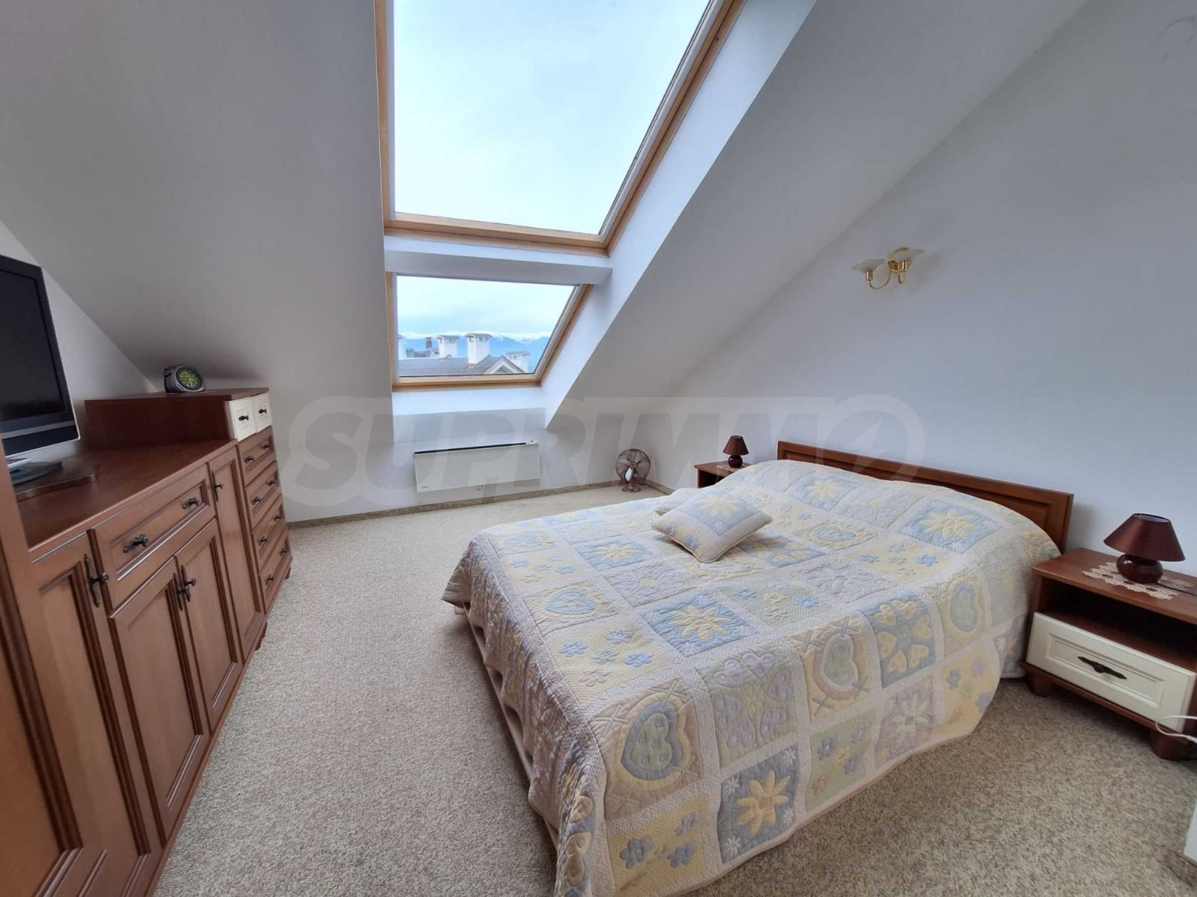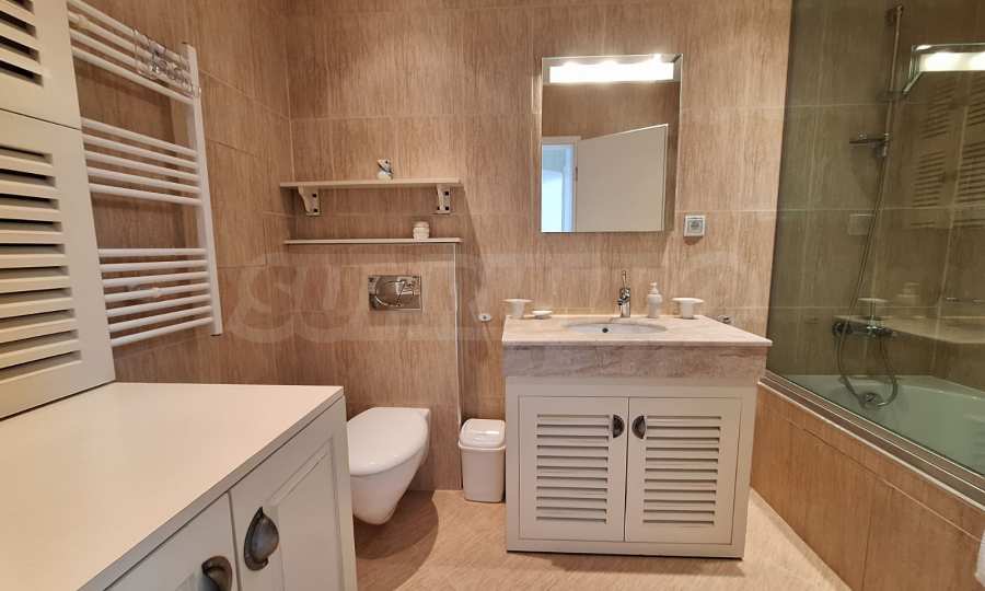 Jasne i przestronne trzypokojowe mieszkanie w nowoczesnym ogrodzonym kompleksie „Pałac św. Jerzego”, wybudowanym w dzielnicy Koszerina w górskim kurorcie Bansko, u podnóża góry Pirin. Obiekt położony jest 800 metrów od stacji kolejki linowej i 200 metrów od stoku. Kompleks oferuje swoim gościom nowoczesny luksus, komfort, spokój i bliskość czystej i pięknej przyrody, a także wielu zabytków kulturalnych, architektonicznych i historycznych, różne możliwości uprawiania sportów zimowych i letnich, relaksujące zabiegi spa, sporty golfowe.