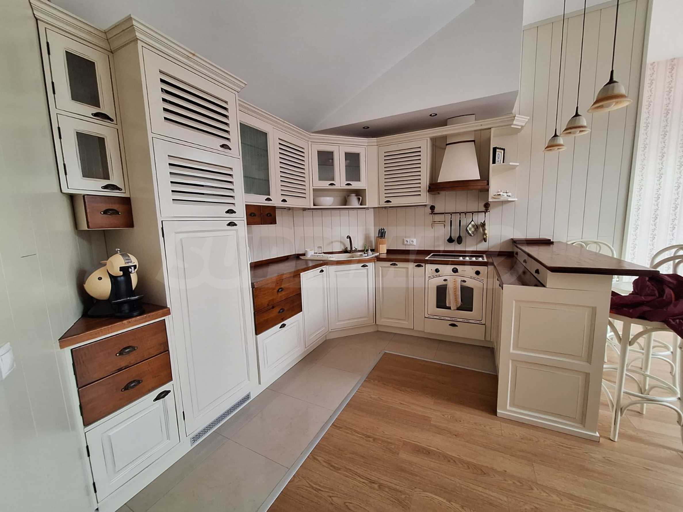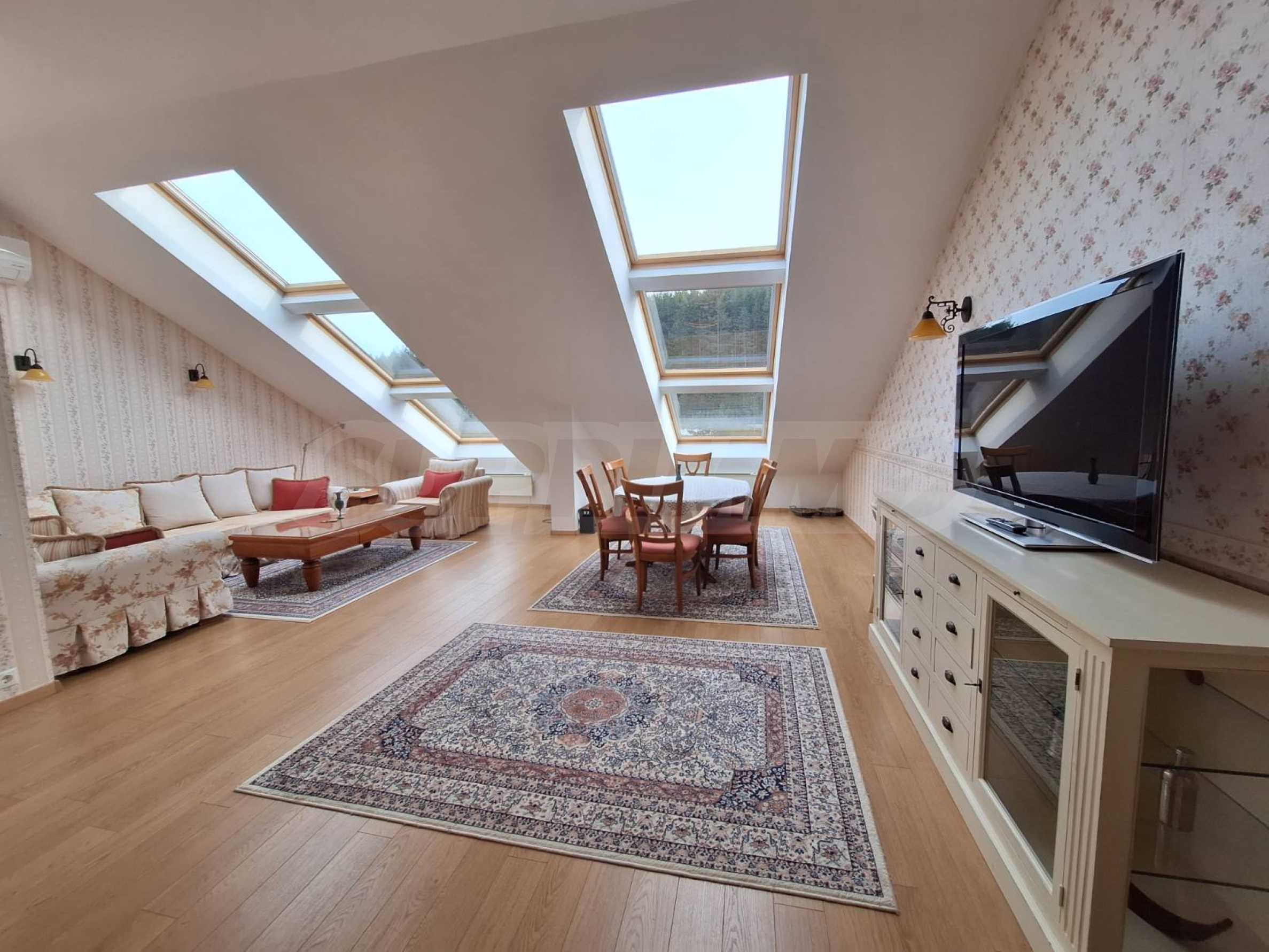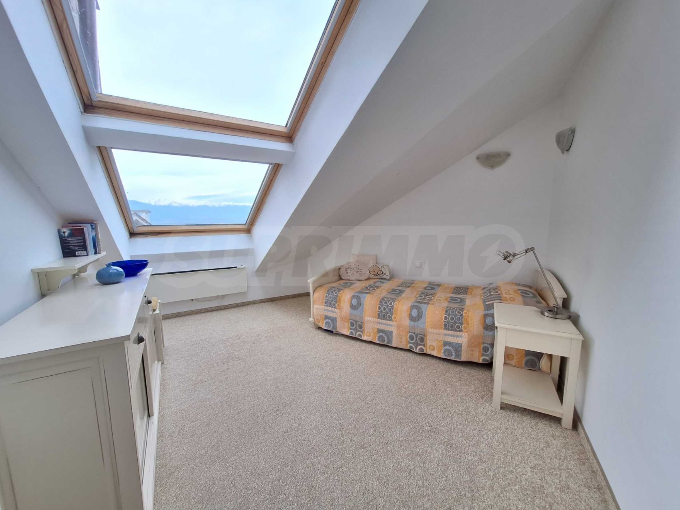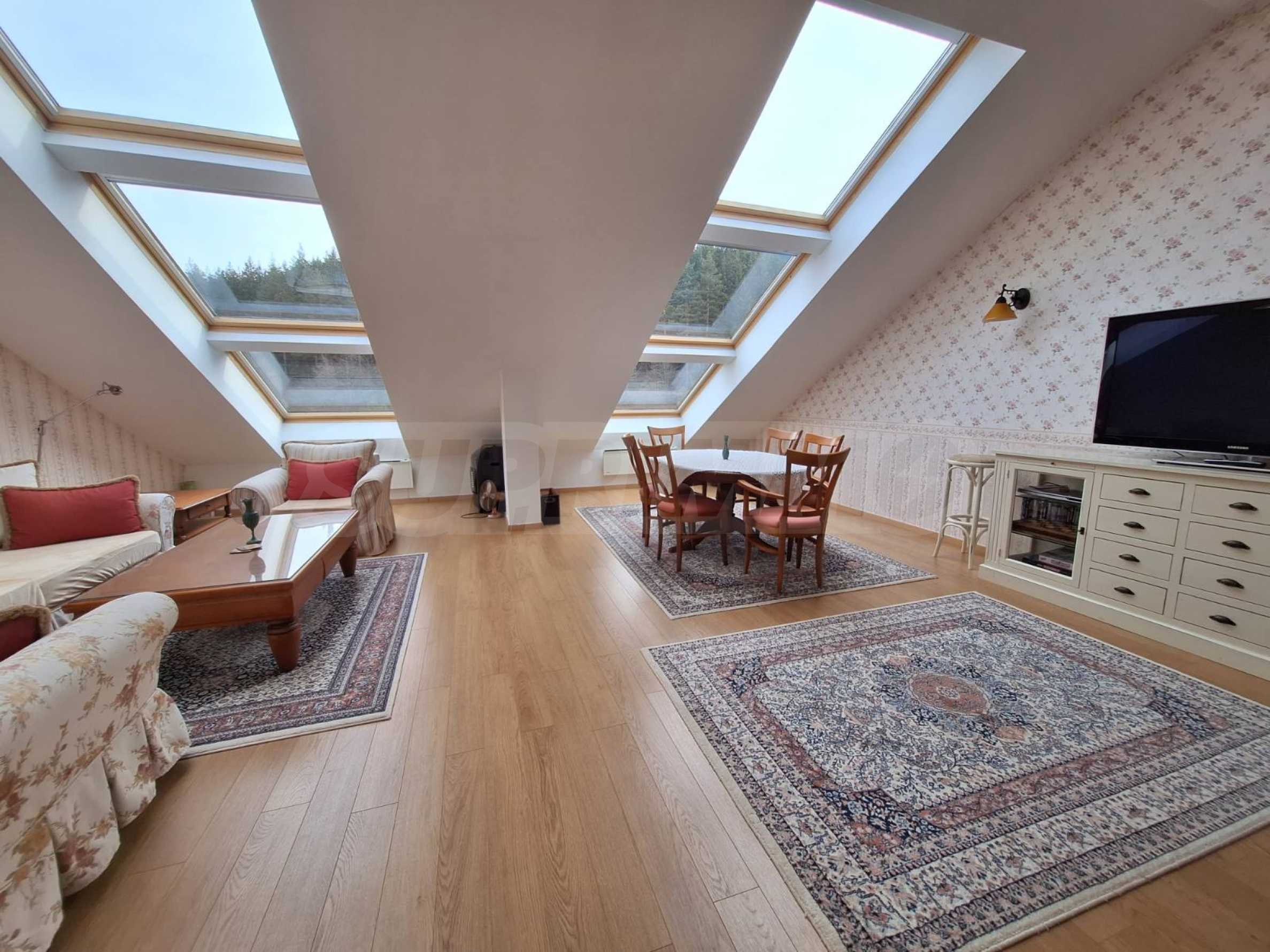 Jasne i przestronne trzypokojowe mieszkanie w nowoczesnym ogrodzonym kompleksie „Pałac św. Jerzego”, wybudowanym w dzielnicy Koszerina w górskim kurorcie Bansko, u podnóża góry Pirin. Obiekt położony jest 800 metrów od stacji kolejki linowej i 200 metrów od stoku. Kompleks oferuje swoim gościom nowoczesny luksus, komfort, spokój i bliskość czystej i pięknej przyrody, a także wielu zabytków kulturalnych, architektonicznych i historycznych, różne możliwości uprawiania sportów zimowych i letnich, relaksujące zabiegi spa, sporty golfowe.