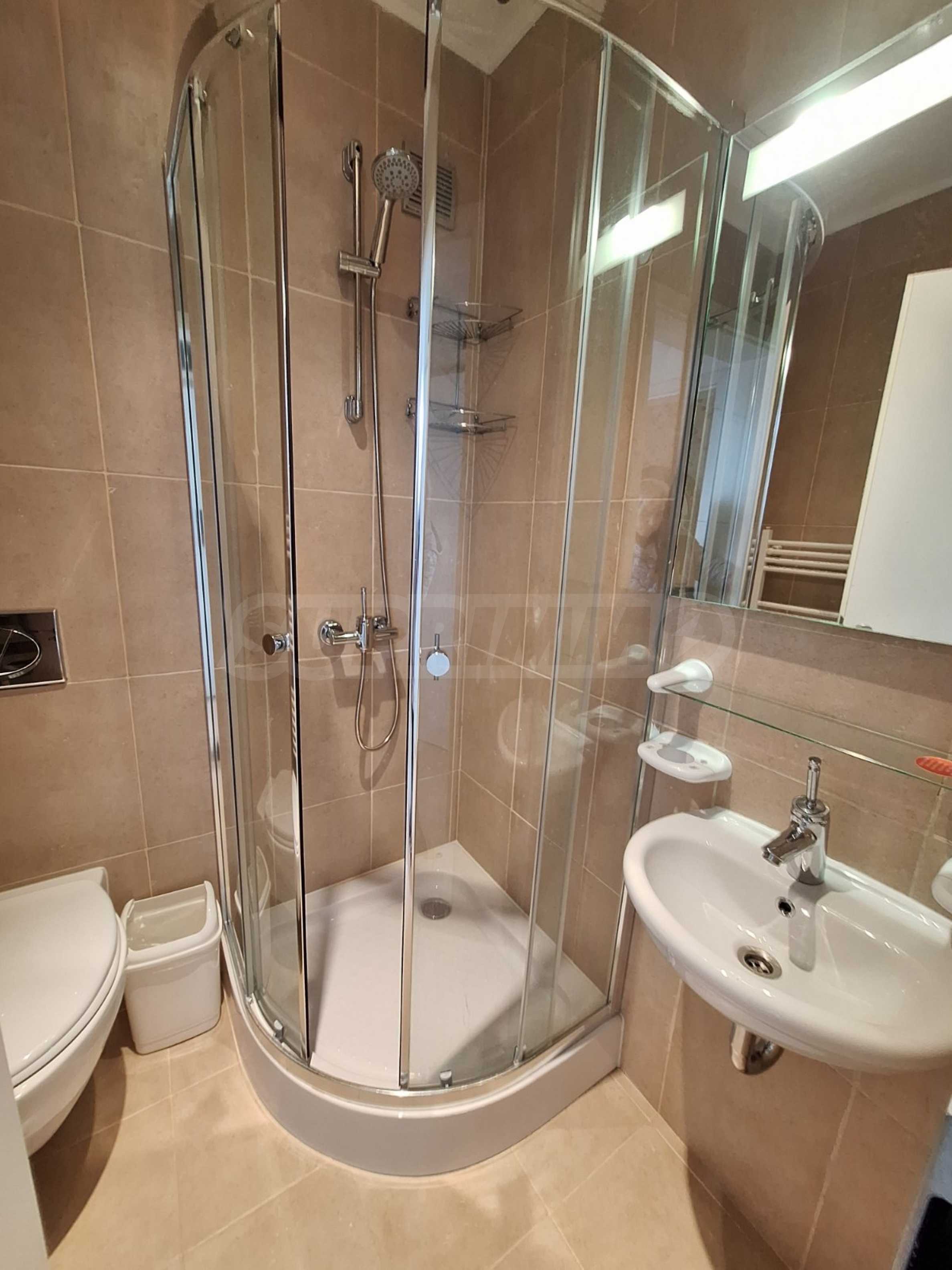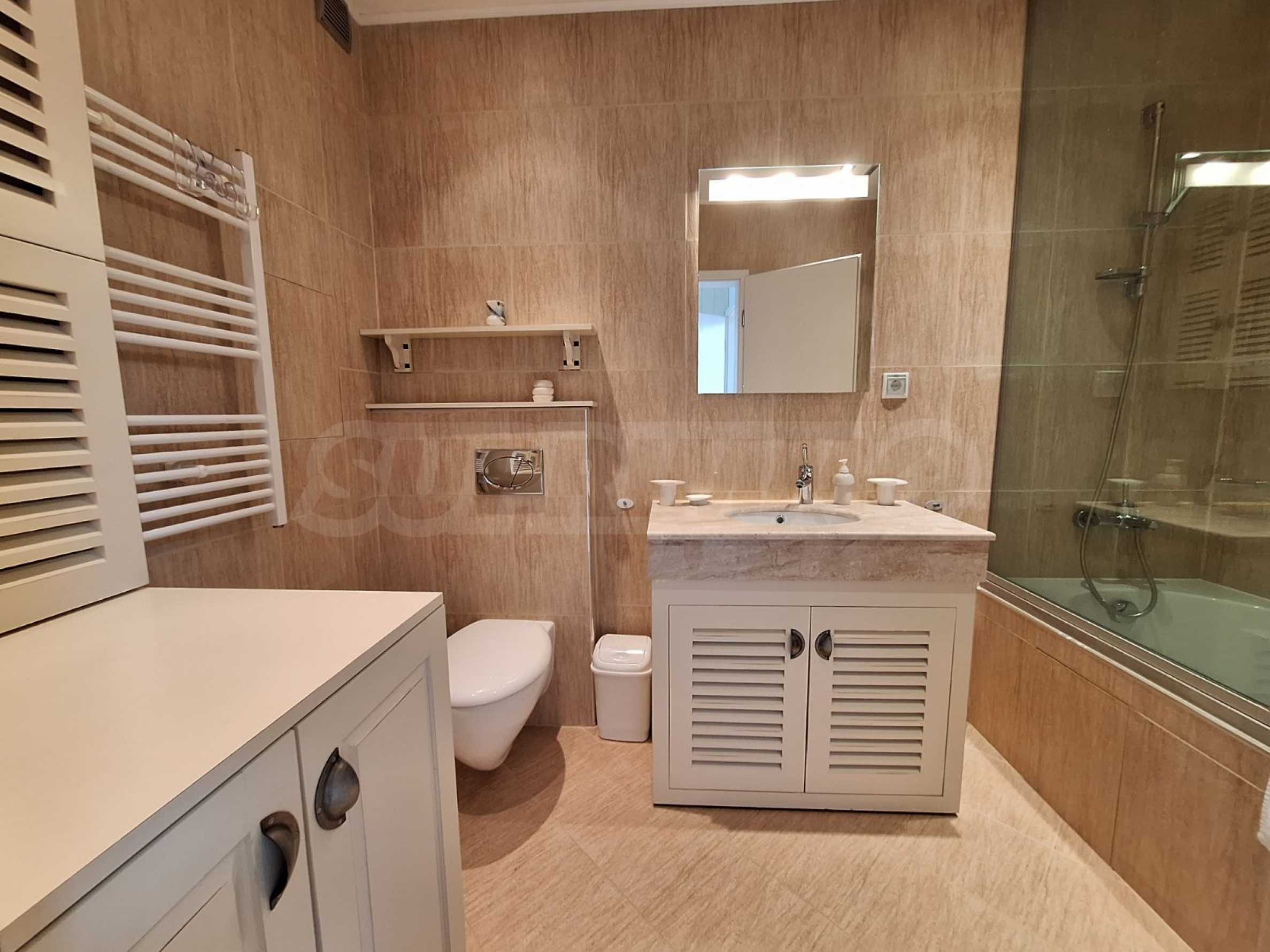 Apartament posiada dwie luksusowo wyposażone łazienki. W jednej łazience znajduje się wanna, w drugiej kabina prysznicowa.