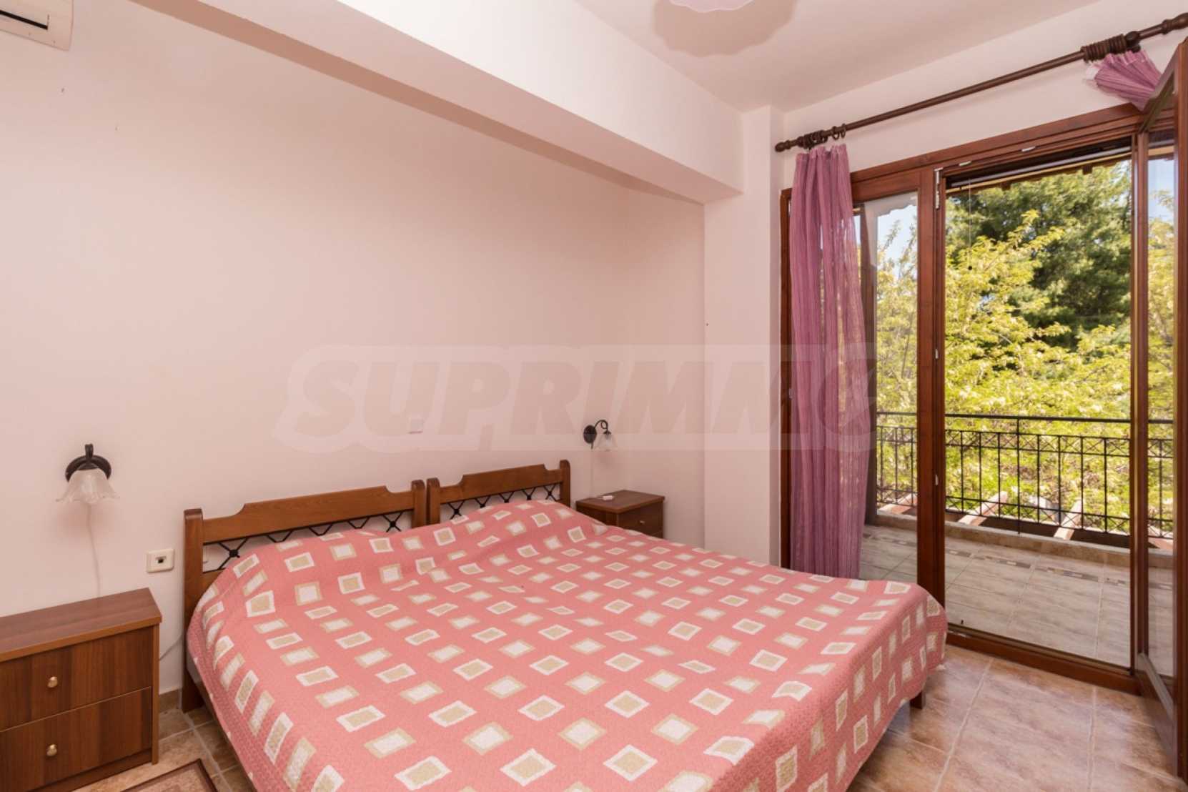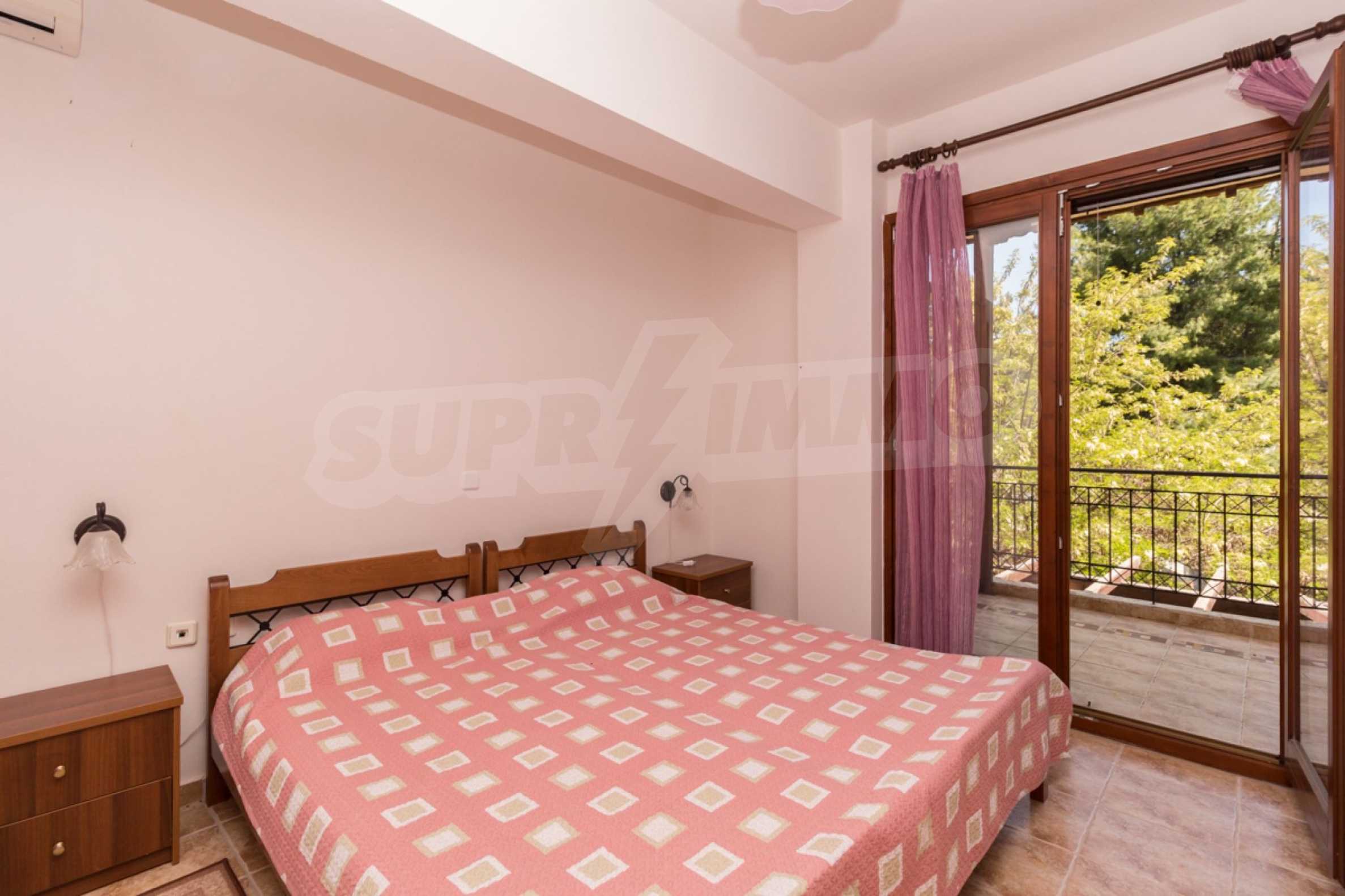 Dom ma powierzchnię zabudowaną 120 mkw. i posiada ogrodzony dziedziniec o powierzchni 600 mkw. Zbudowany w 2003 roku, dwupoziomowy posiada na pierwszym piętrze: 2 miejsca parkingowe oraz przestronny salon z kominkiem i zabudowaną kuchnią z całym niezbędnym sprzętem AGD i AGD, łazienkę i garderobę. Na drugim piętrze znajdują się 2 sypialnie, łazienka oraz duży balkon z panoramicznym widokiem. Okna posesji są drewniane, az tarasu rozpościera się wspaniały widok na cudowną przyrodę okolicy. Sale są klimatyzowane i ogrzewane kominkiem.