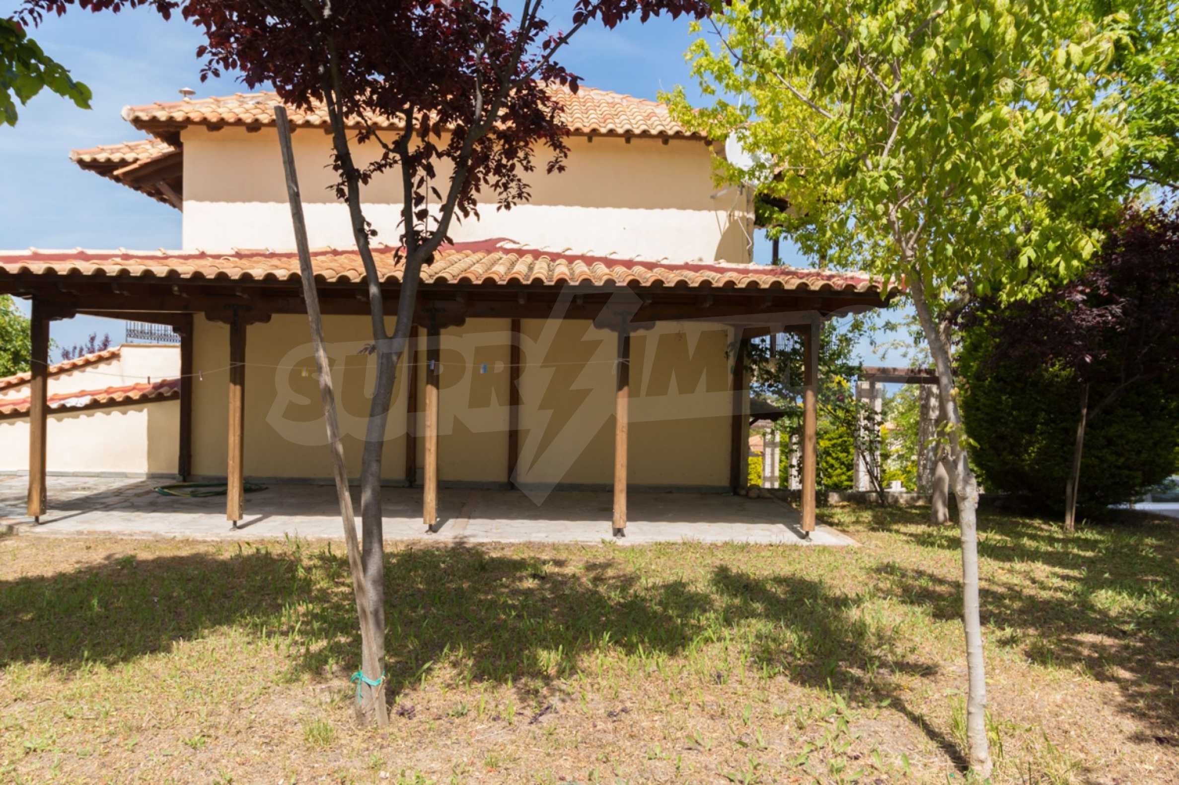 Dom ma powierzchnię zabudowaną 120 mkw. i posiada ogrodzony dziedziniec o powierzchni 600 mkw. Zbudowany w 2003 roku, dwupoziomowy posiada na pierwszym piętrze: 2 miejsca parkingowe oraz przestronny salon z kominkiem i zabudowaną kuchnią z całym niezbędnym sprzętem AGD i AGD, łazienkę i garderobę. Na drugim piętrze znajdują się 2 sypialnie, łazienka oraz duży balkon z panoramicznym widokiem. Okna posesji są drewniane, az tarasu rozpościera się wspaniały widok na cudowną przyrodę okolicy. Sale są klimatyzowane i ogrzewane kominkiem.