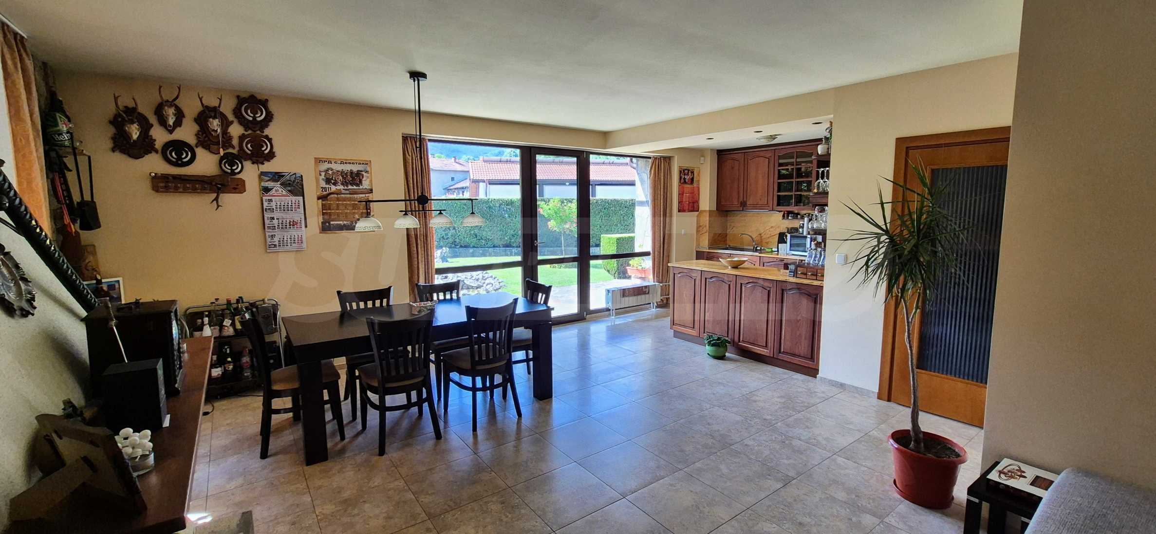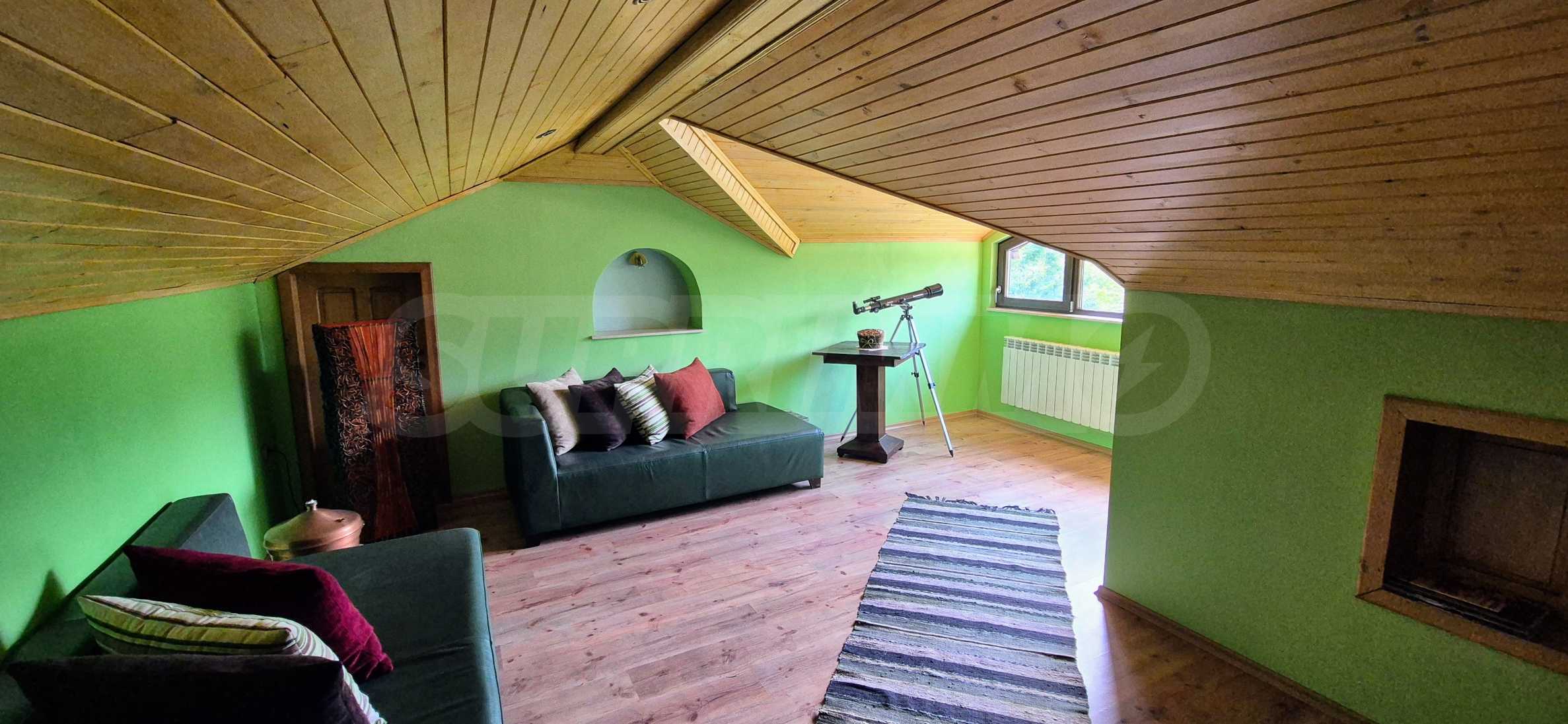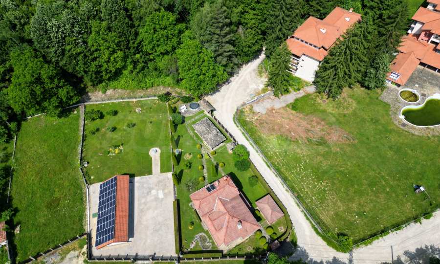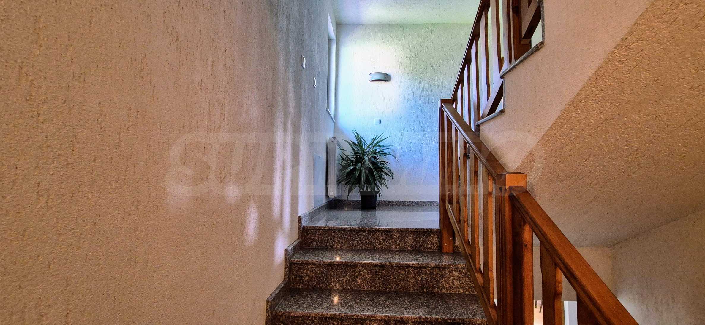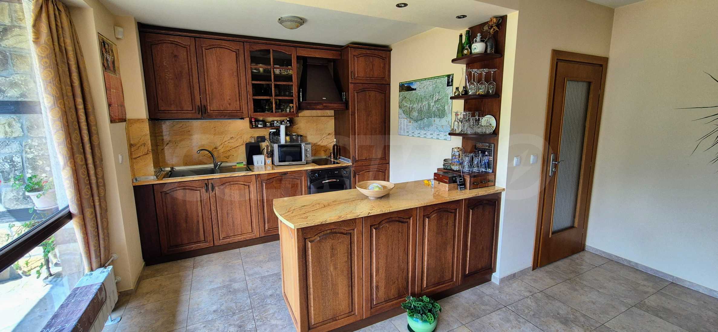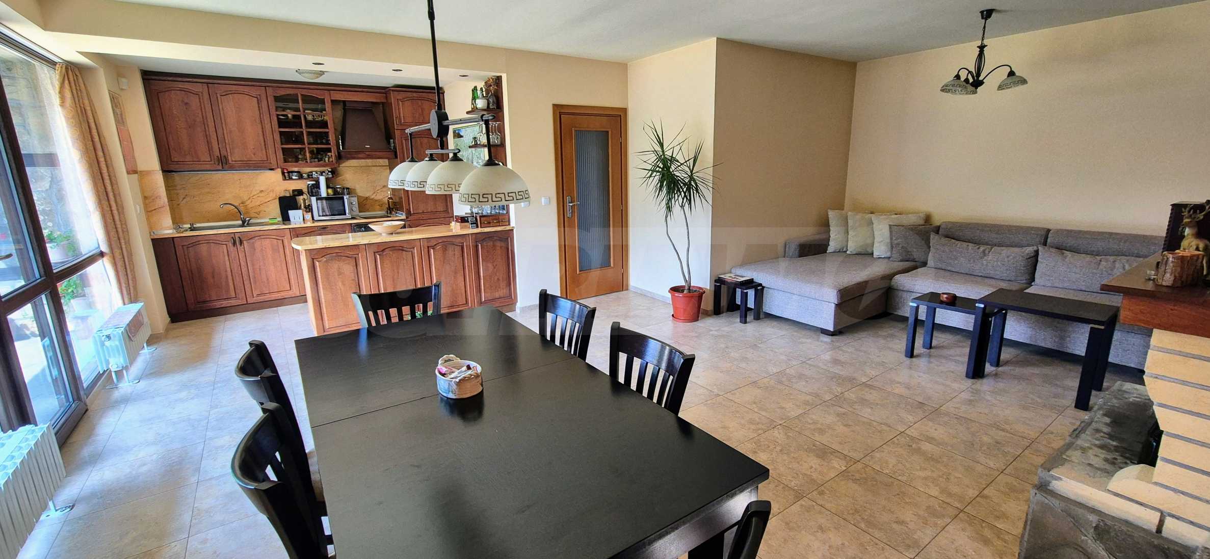Dom posiada przestronny salon z bezpośrednim wyjściem na podwórko, kominek, jadalnię i aneks kuchenny, toaletę, kotłownię, 3 sypialnie i 2 studia z 5 łazienkami i toaletami z naturalną wentylacją, 2 panoramiczne tarasy z niesamowity widok, klatka schodowa i granitowe platformy. W salonie i kotłowni płytki granitowe, w sypialniach parkiet laminowany. Do sprzedania z całym umeblowaniem.