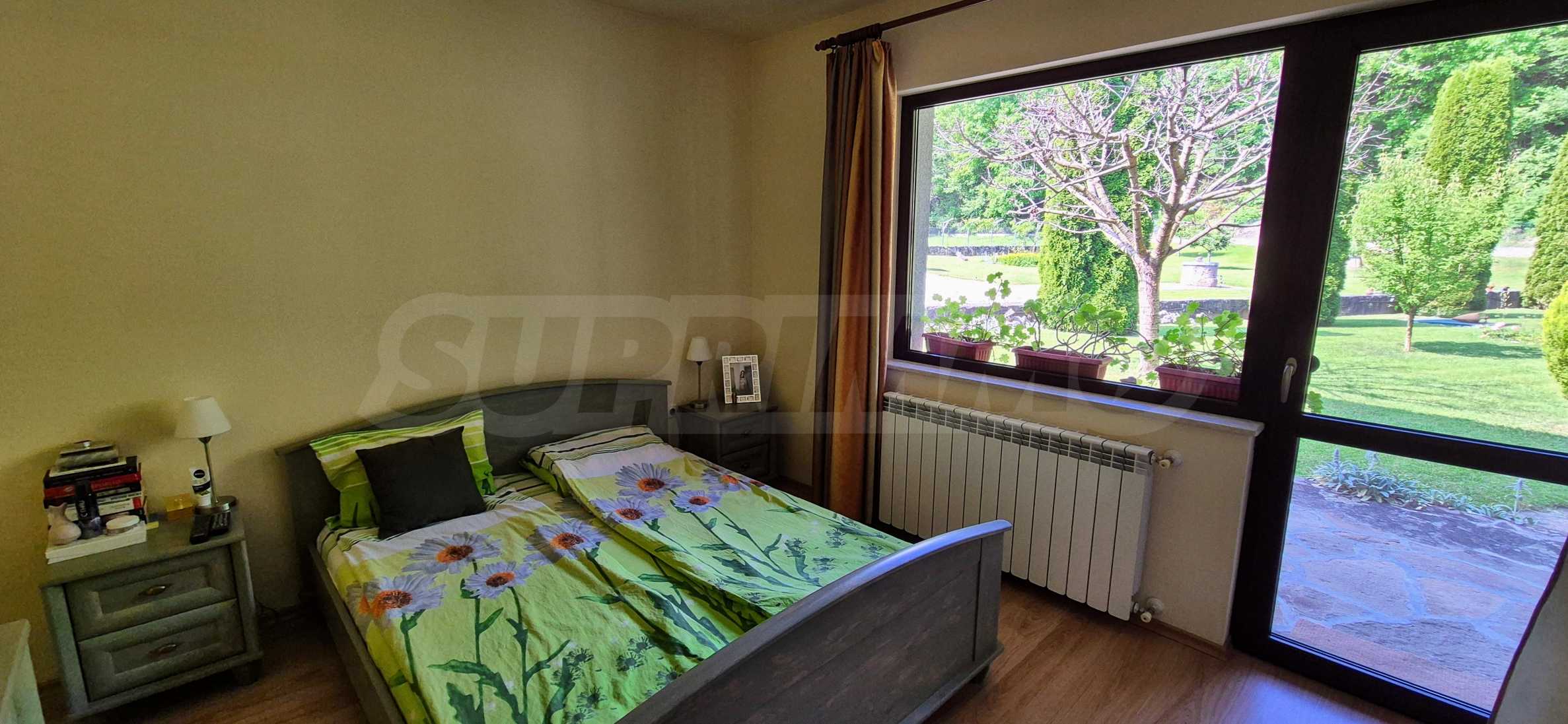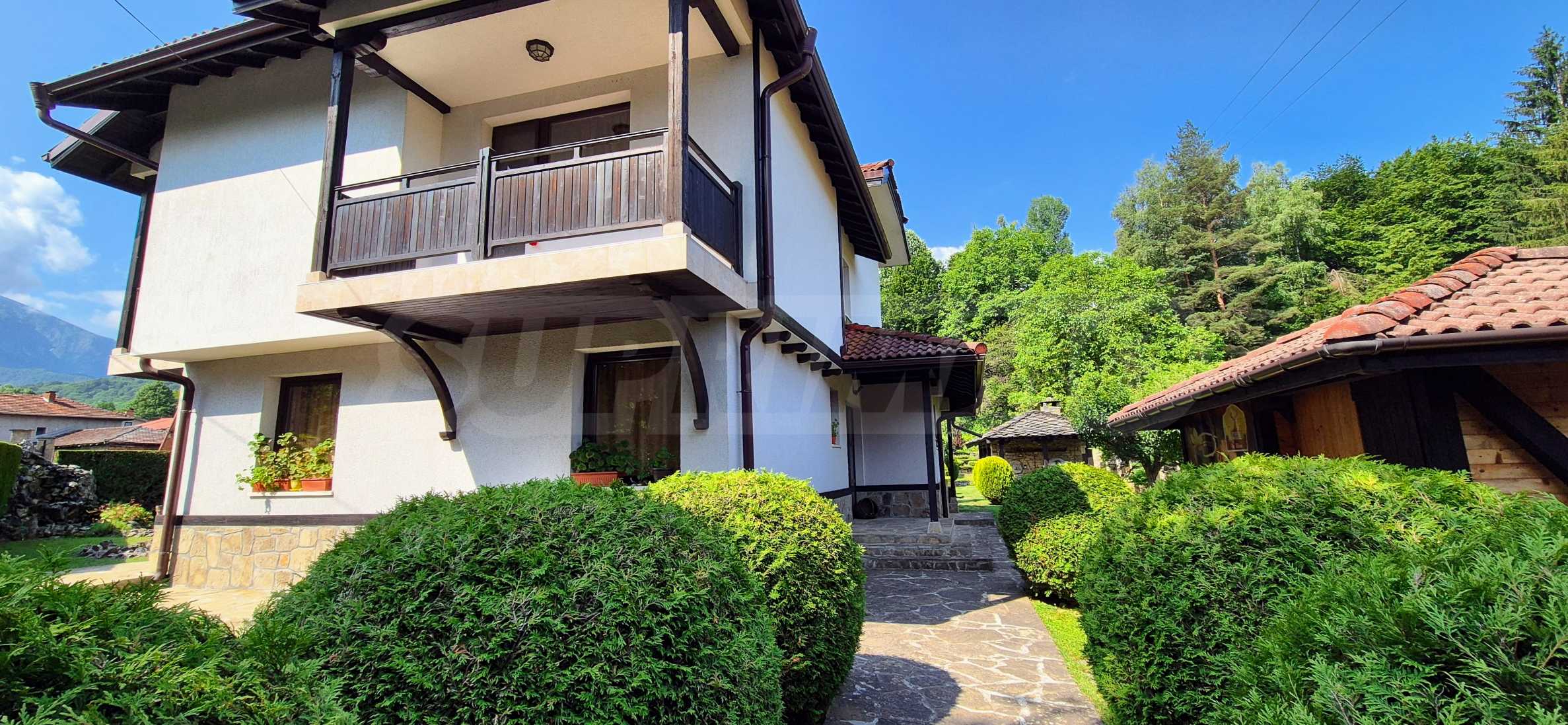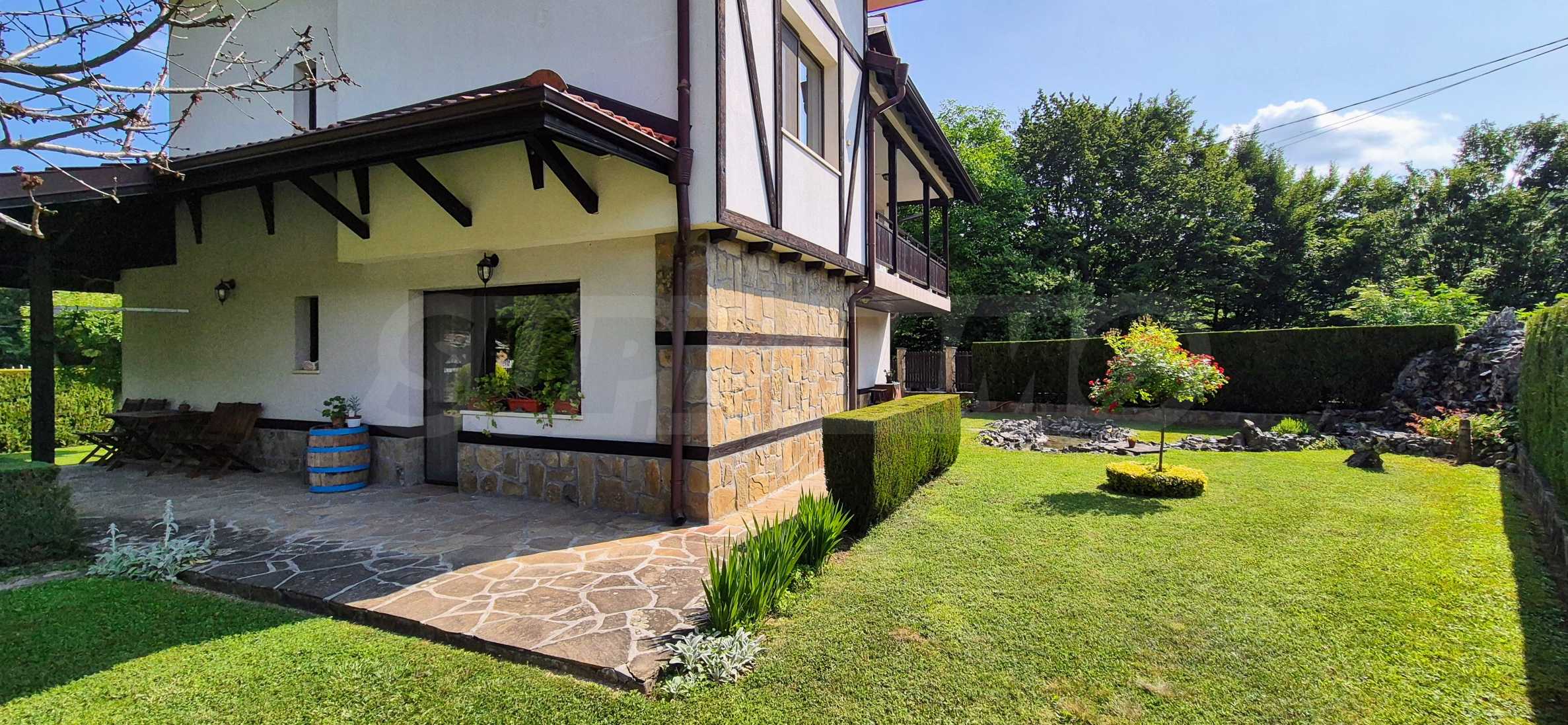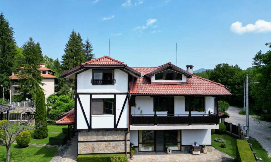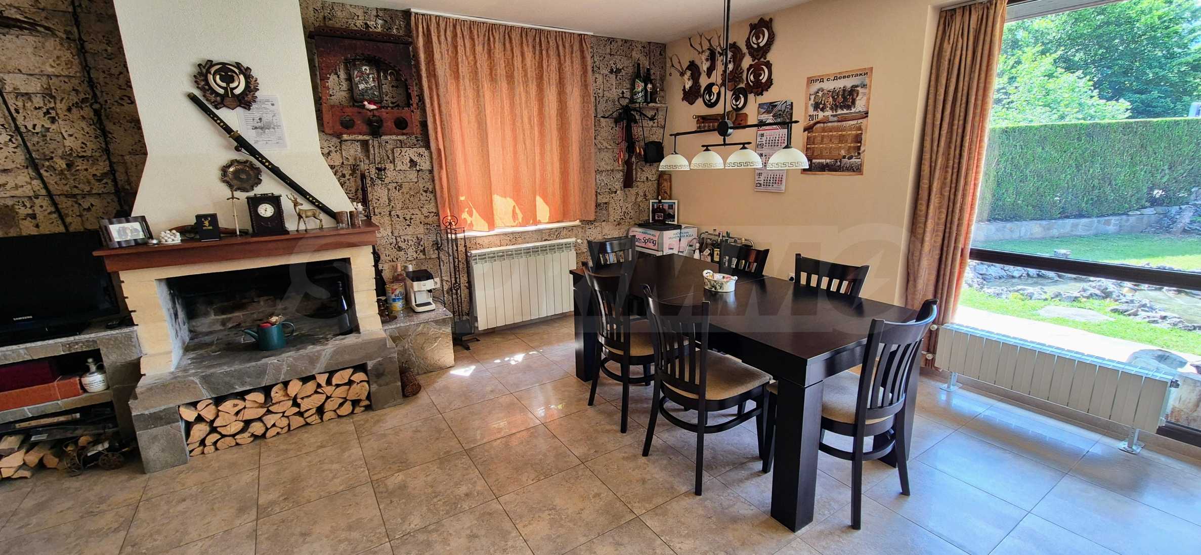 Dom posiada przestronny salon z bezpośrednim wyjściem na podwórko, kominek, jadalnię i aneks kuchenny, toaletę, kotłownię, 3 sypialnie i 2 studia z 5 łazienkami i toaletami z naturalną wentylacją, 2 panoramiczne tarasy z niesamowity widok, klatka schodowa i granitowe platformy. W salonie i kotłowni płytki granitowe, w sypialniach parkiet laminowany. Do sprzedania z całym umeblowaniem.
