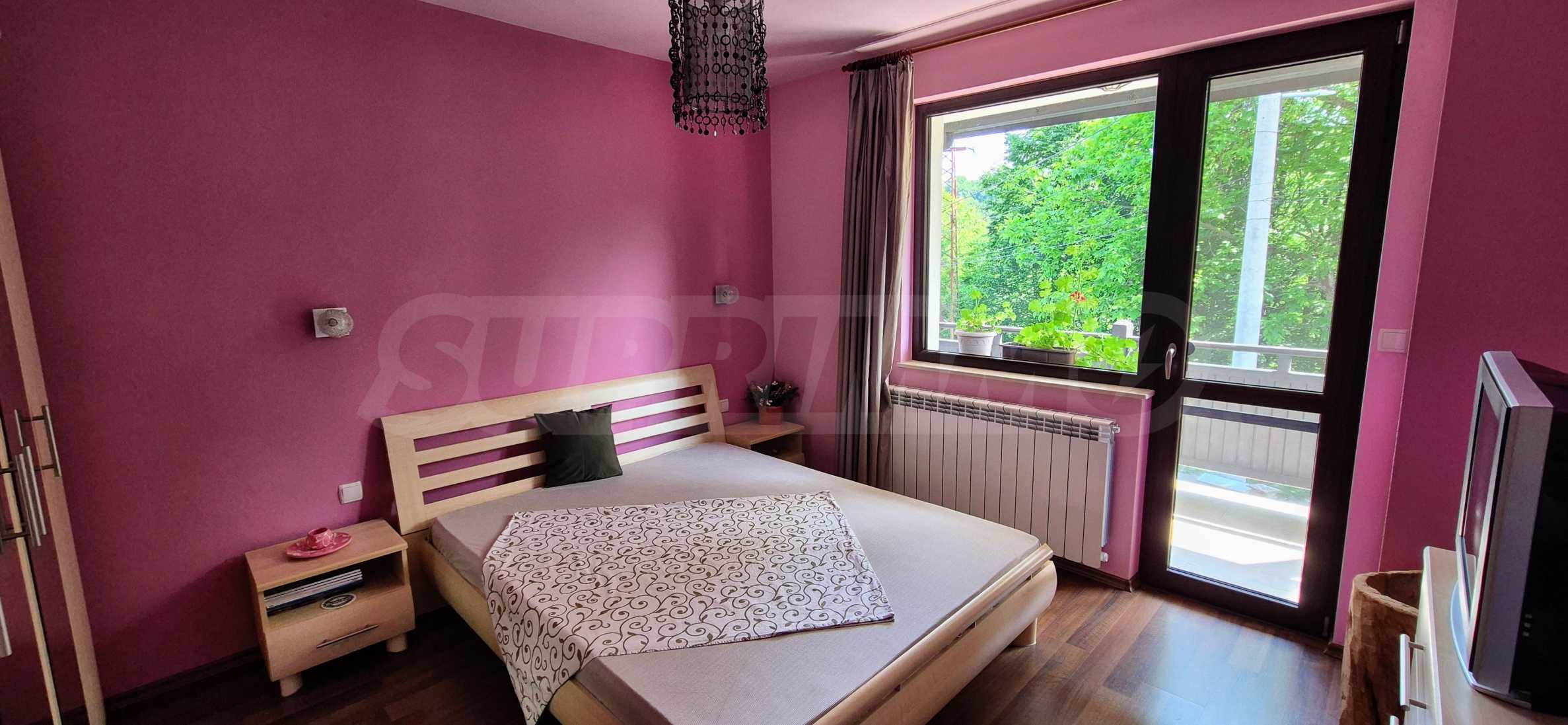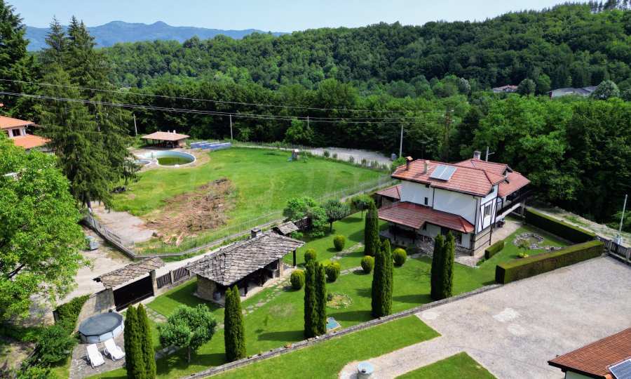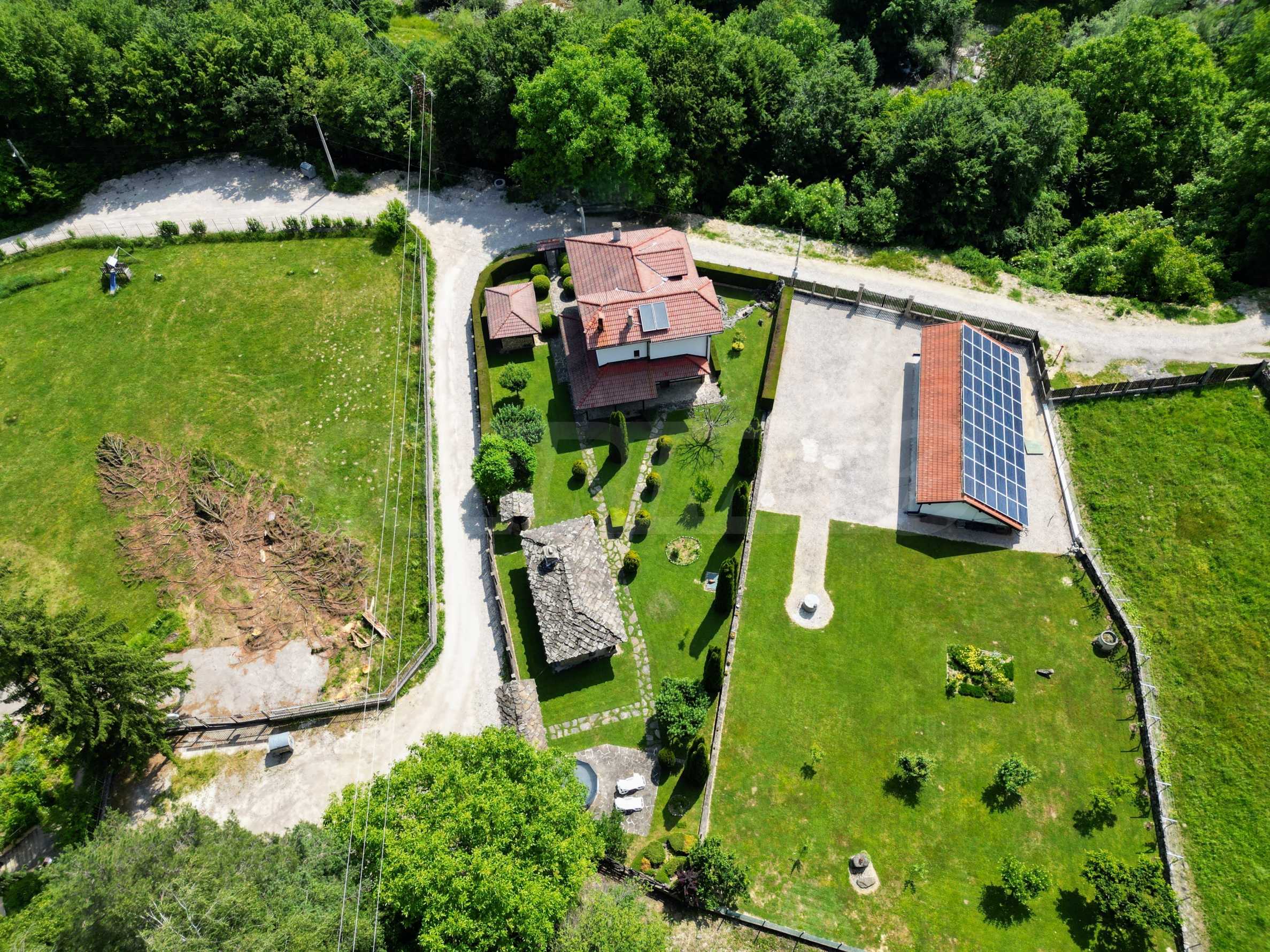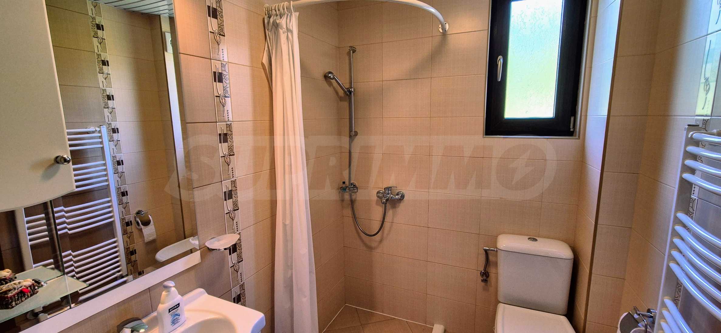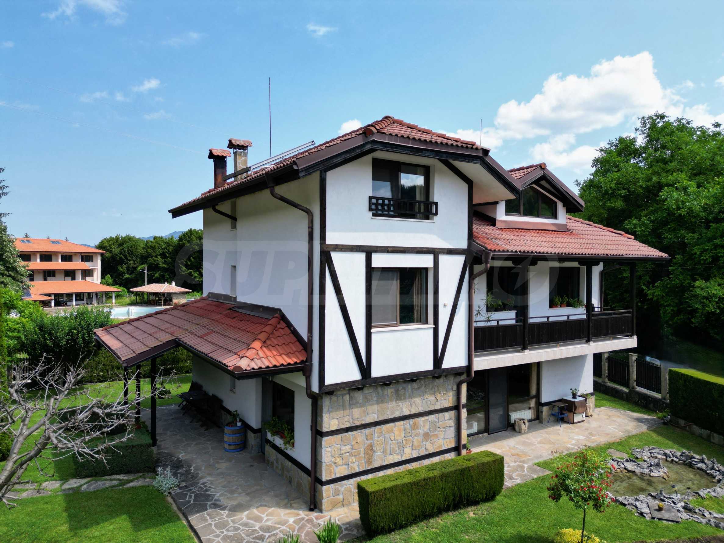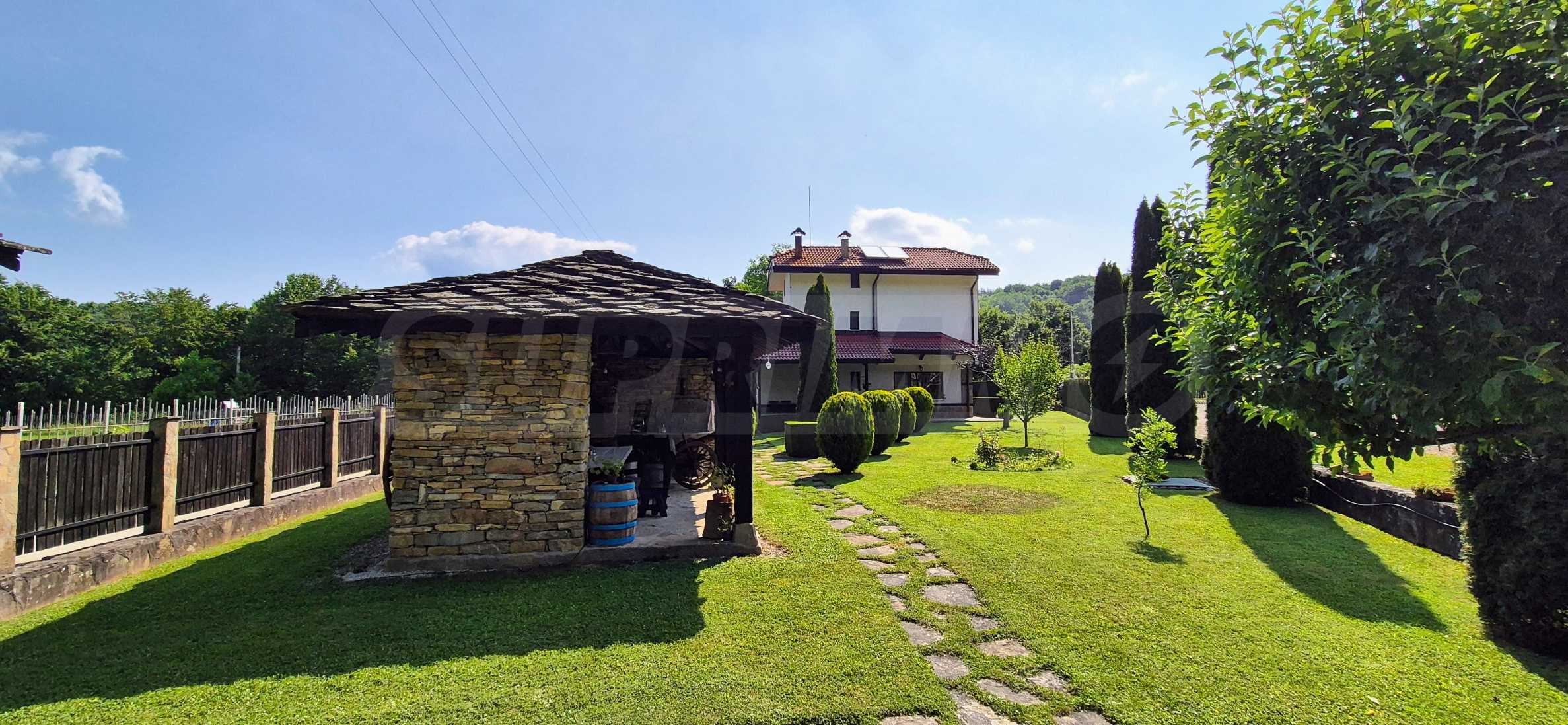 Dom posiada przestronny salon z bezpośrednim wyjściem na podwórko, kominek, jadalnię i aneks kuchenny, toaletę, kotłownię, 3 sypialnie i 2 studia z 5 łazienkami i toaletami z naturalną wentylacją, 2 panoramiczne tarasy z niesamowity widok, klatka schodowa i granitowe platformy. W salonie i kotłowni płytki granitowe, w sypialniach parkiet laminowany. Do sprzedania z całym umeblowaniem.